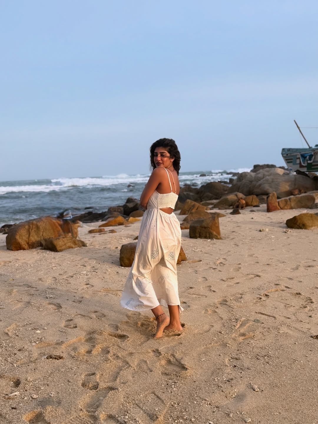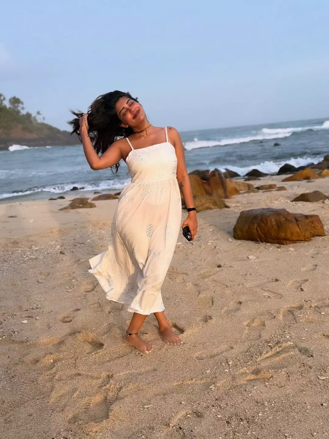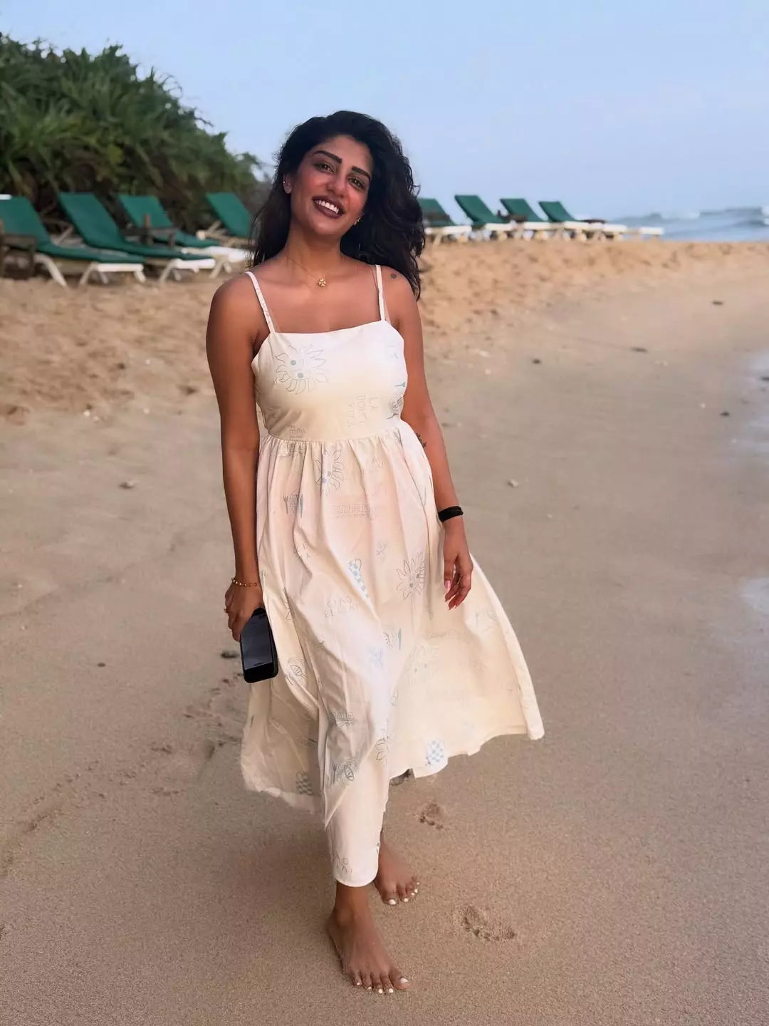 Supritha who is becoming a popular figure on social media shared a moment on her Instagram recently showing her at the beach in a light white dress.