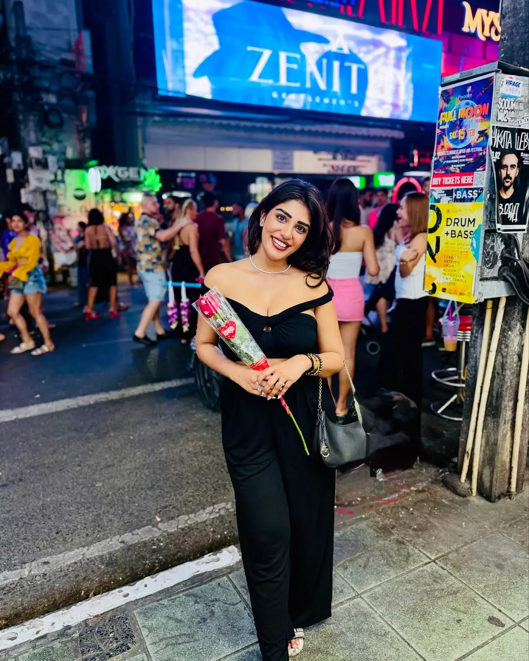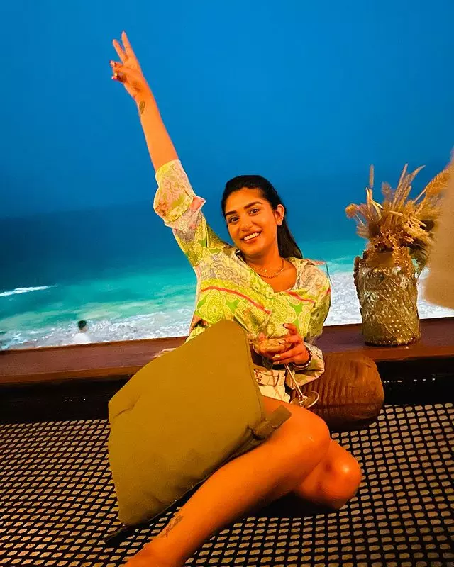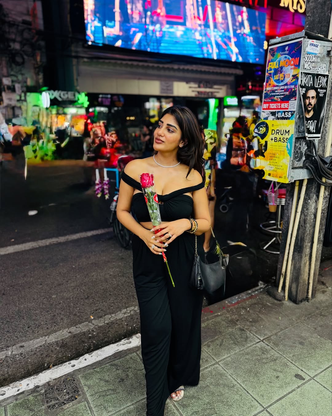 Adding to the glamour, Supritha accessorizes with layered gold jewelry, a statement watch, and cool black sunglasses that perfectly elevate her party-ready mood. With her hair tied back in a classy ponytail and a radiant smile, she carries the look with absolute ease and charisma.