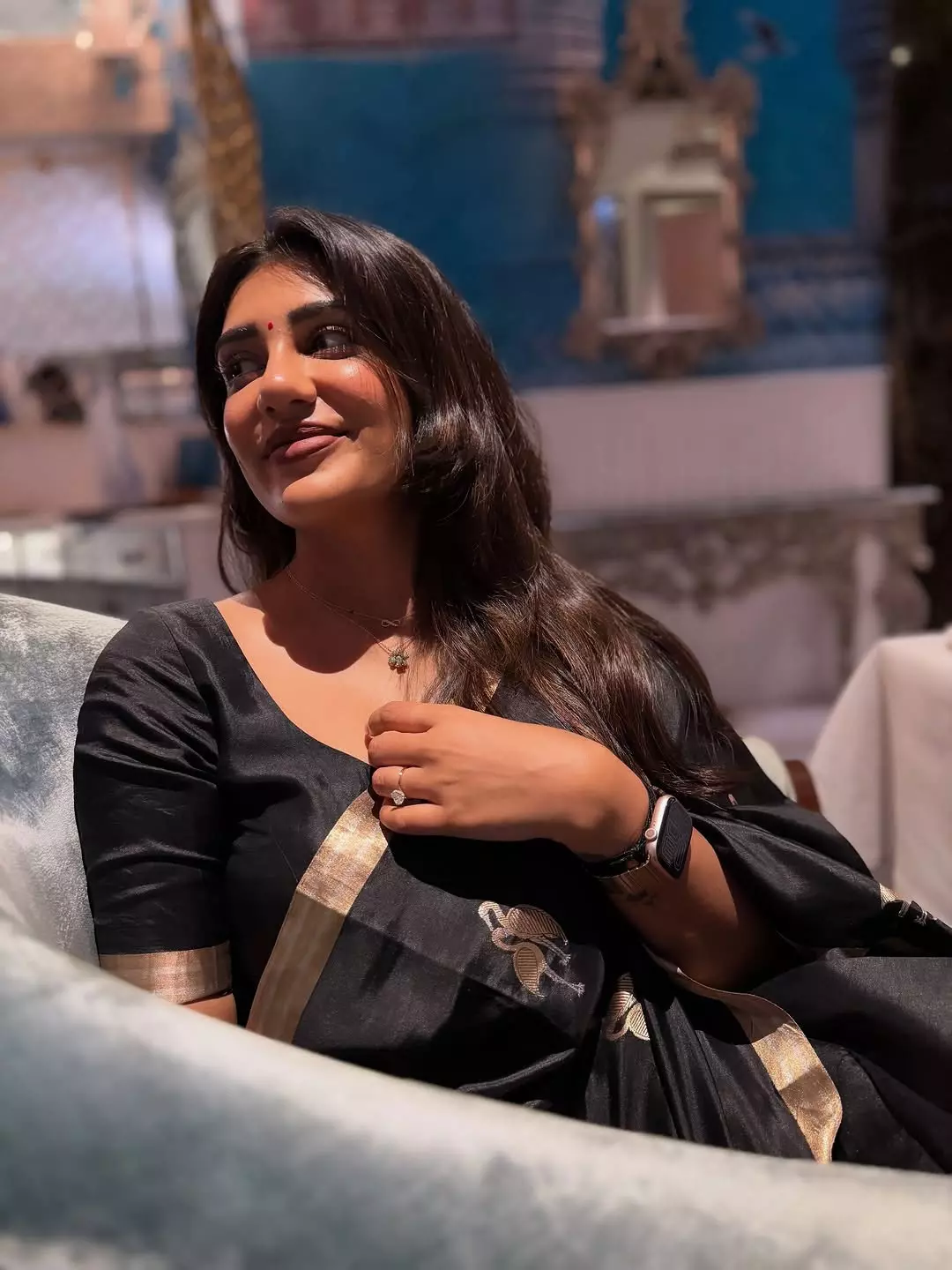 Supritha Naidu who always makes her fans go gaga with her style has recently shared a picture of herself on Instagram and it’s evident that she has an eye for fashion. She is seen dressed in a beautiful black saree with golden borders.