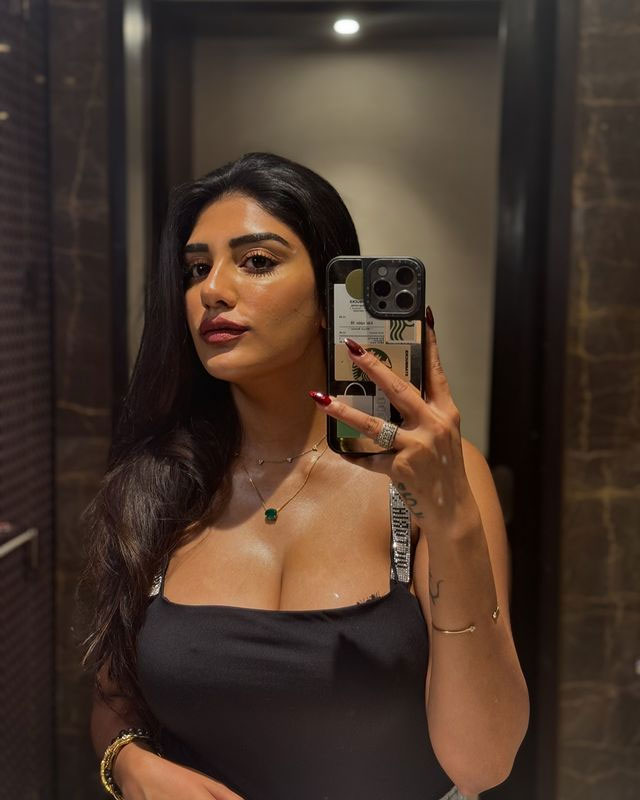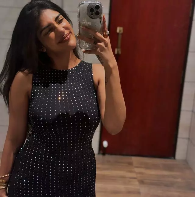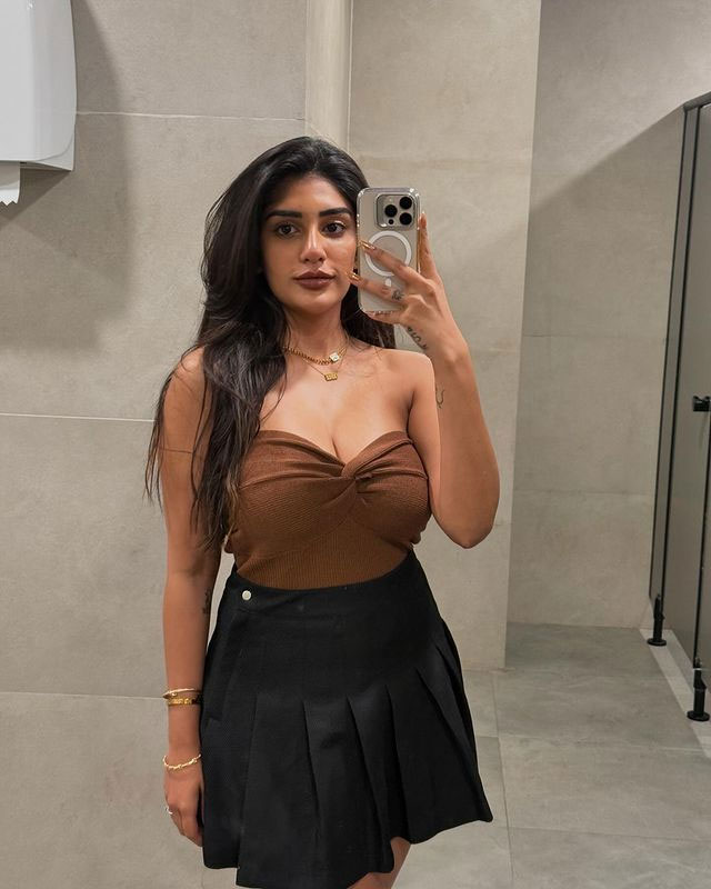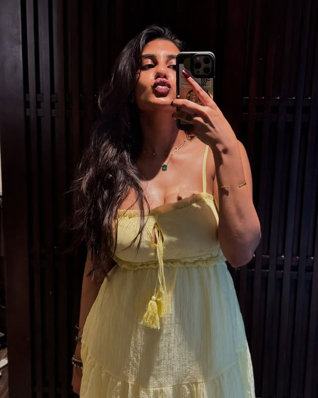 By: Tupaki Gallery Desk | 17 April 2026 12:25 PM ISTSupritha Naidu, the rising Telugu actress and social media sensation, dropped a striking mirror selfie that is turning heads. Captured in a bathroom setting, she looked confident and glamorous with long wavy hair, a sheer brown polka-dot crop top, a bright lime-yellow bag strap, and a playful pink fuzzy phone case. Her subtle tattoos, layered necklaces, and bold gaze added an edgy, youthful charm to the casual yet seductive look.