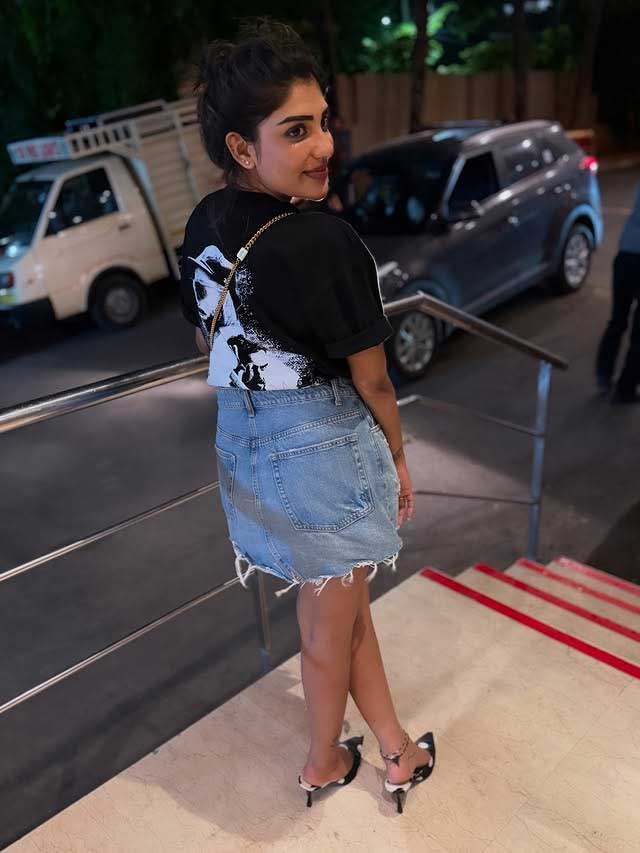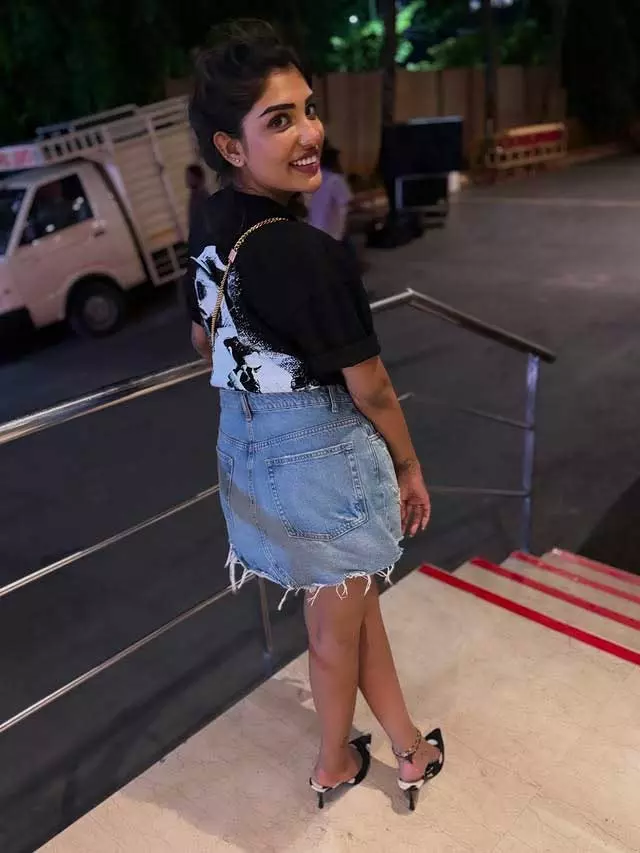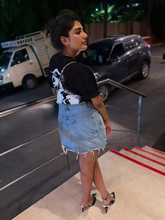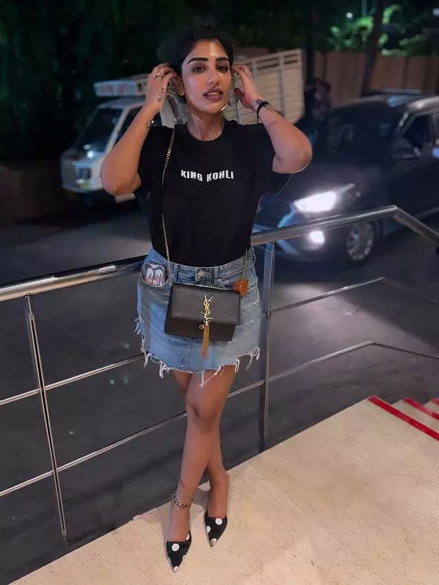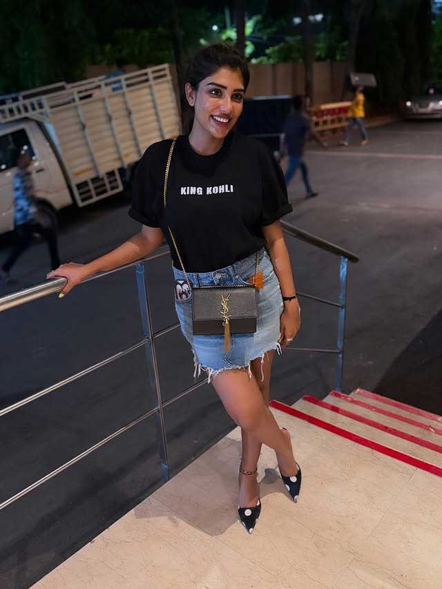 Supritha recently posted a stylish photo on Instagram that caught everyone’s attention. Dressed in a black t-shirt with the words “King Kohli” and a denim skirt, she looked trendy and confident. She completed her look with a luxury YSL crossbody bag and pointed black heels with white polka dots. The caption she wrote, “RCB cup kavali vachesindi 🖤🧿”, translates to “RCB wanted the cup, and they got it.” This shows her support for the Royal Challengers Bangalore team and cricket star Virat Kohli.