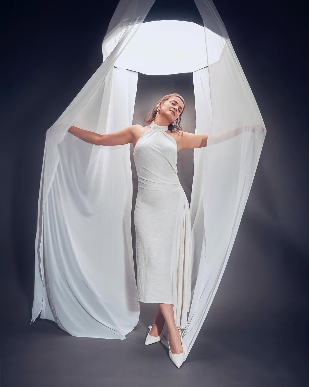 The image shot by visualaffairs_va shows her lifting a flowing white fabric giving it a magical feel. Her caption reads, "surveenchawla White . Wild . Weightless . ♥ Wearing sheenatrehofficial , tanngcommunications Earring iltmusindia Rings e3kjewelry Styled by sukritigrover Styling Team Senior stylist vanigupta_23 Team jaiswal_aditi_ Fashion Intern jiaa_joshi Hairstylist gohar_shaikh 📸 visualaffairs_va #hoursago."