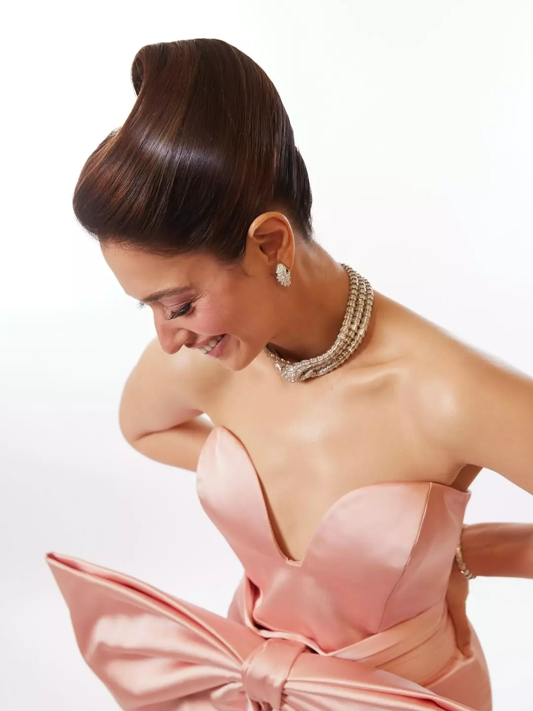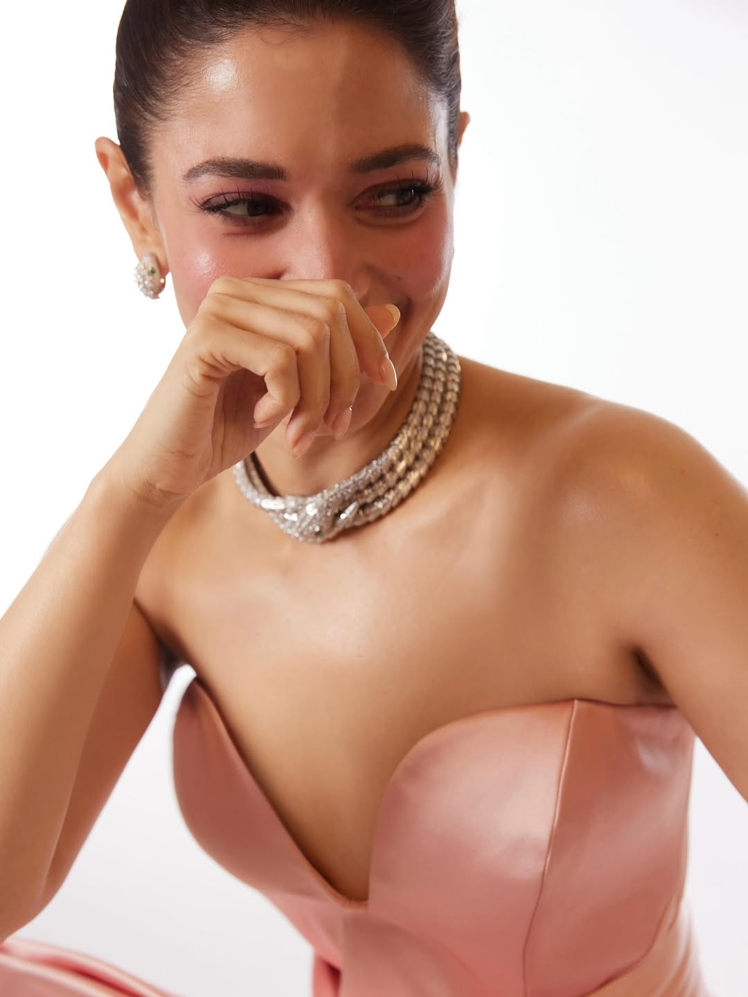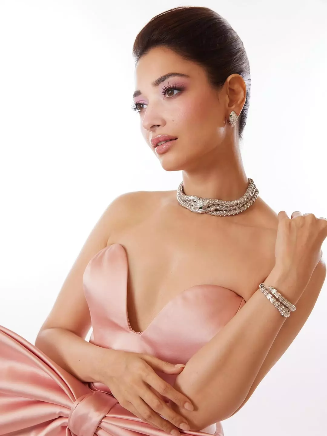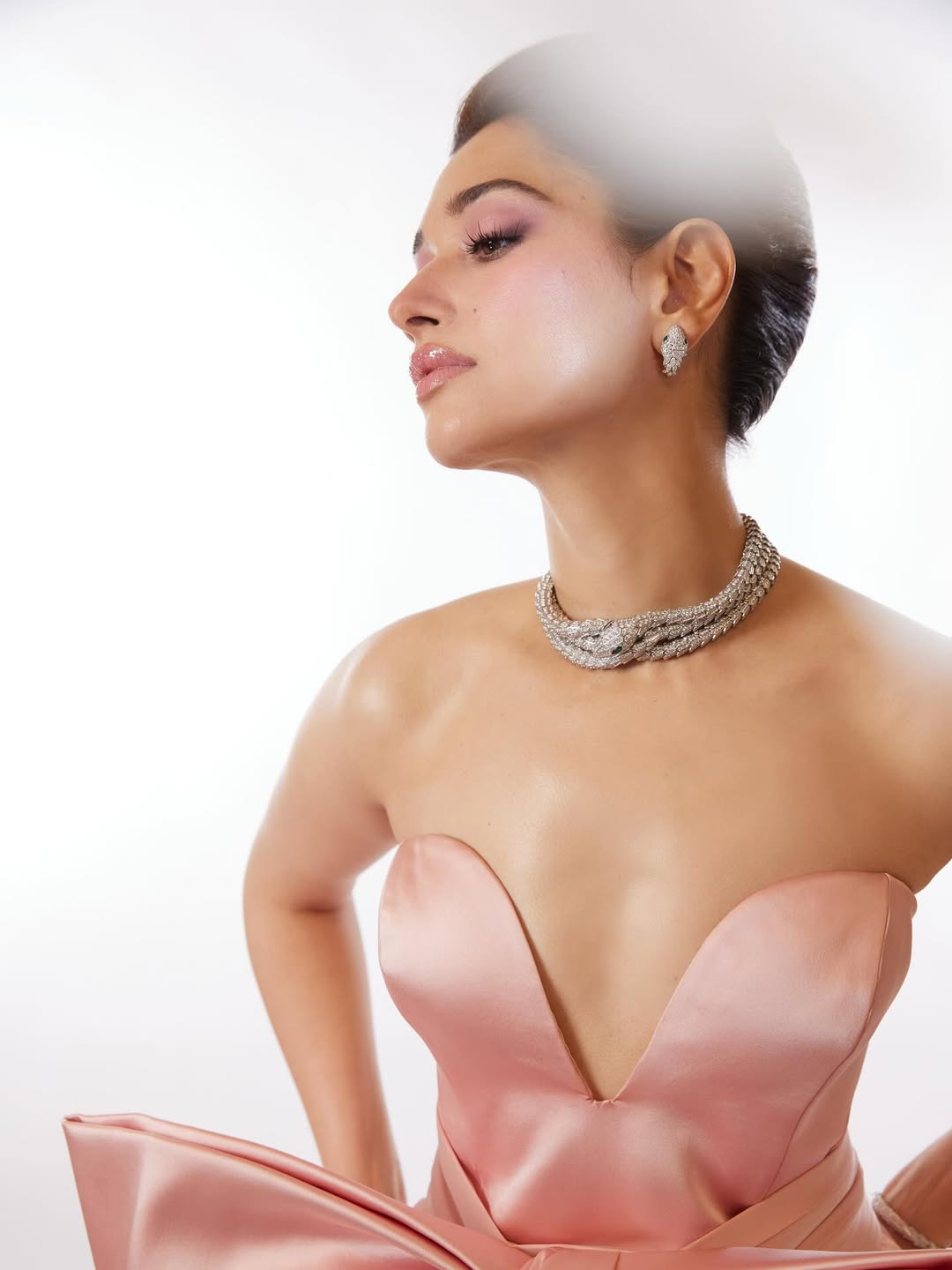 When art, culture, and jewellery come together, you get an experience like no other and Tamannaah Bhatia embodied that spirit flawlessly at the Serpenti Infinito exhibition by Bvlgari. Dressed in a stunning blush pink satin gown featuring a structured sweetheart neckline and an oversized bow, Tamannaah looked like a vision of elegance and grace. Her sculpted high bun and radiant diamond jewellery added a timeless charm, perfectly complementing the essence of the event a celebration of rebirth, luxury, and artistic legacy.