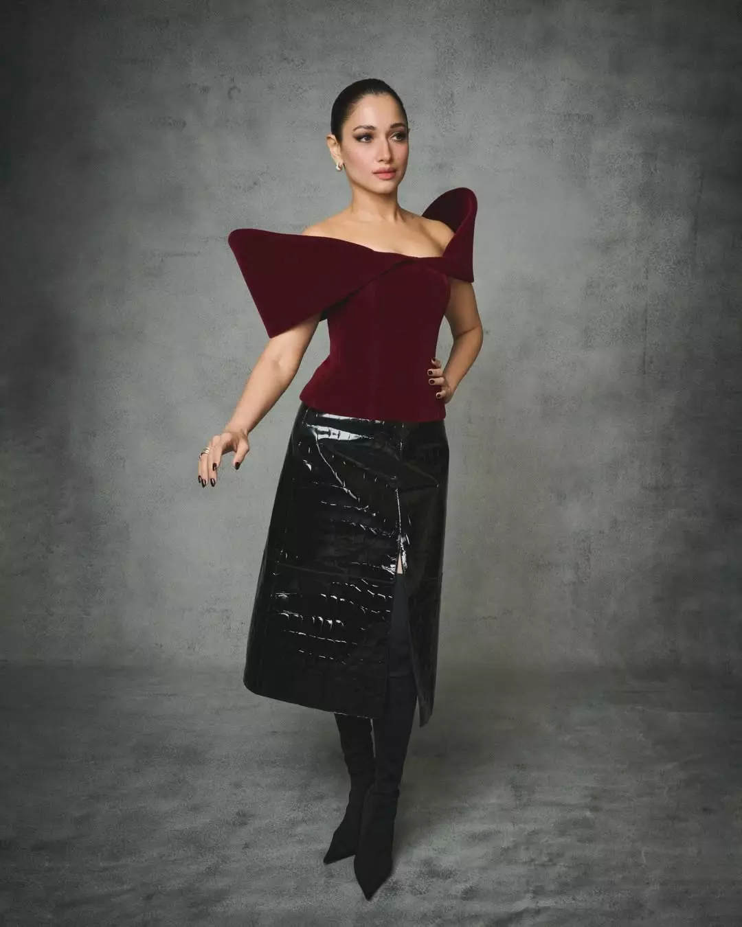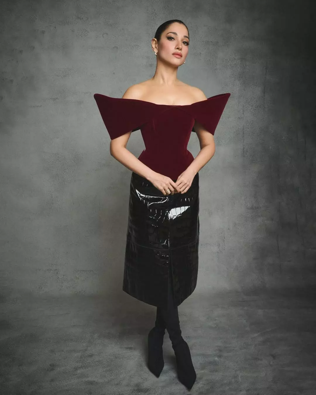 By: Tupaki Gallery Desk | 29 April 2026 2:58 PM ISTTamannaah Bhatia continues to redefine elegance with her striking presence and evolving fashion choices. In this stunning look, she blends bold structure with classic sophistication, wearing a sculpted off-shoulder burgundy top paired with a sleek black skirt. The dramatic silhouette highlights her confidence, while the minimal accessories allow her natural beauty to shine through.