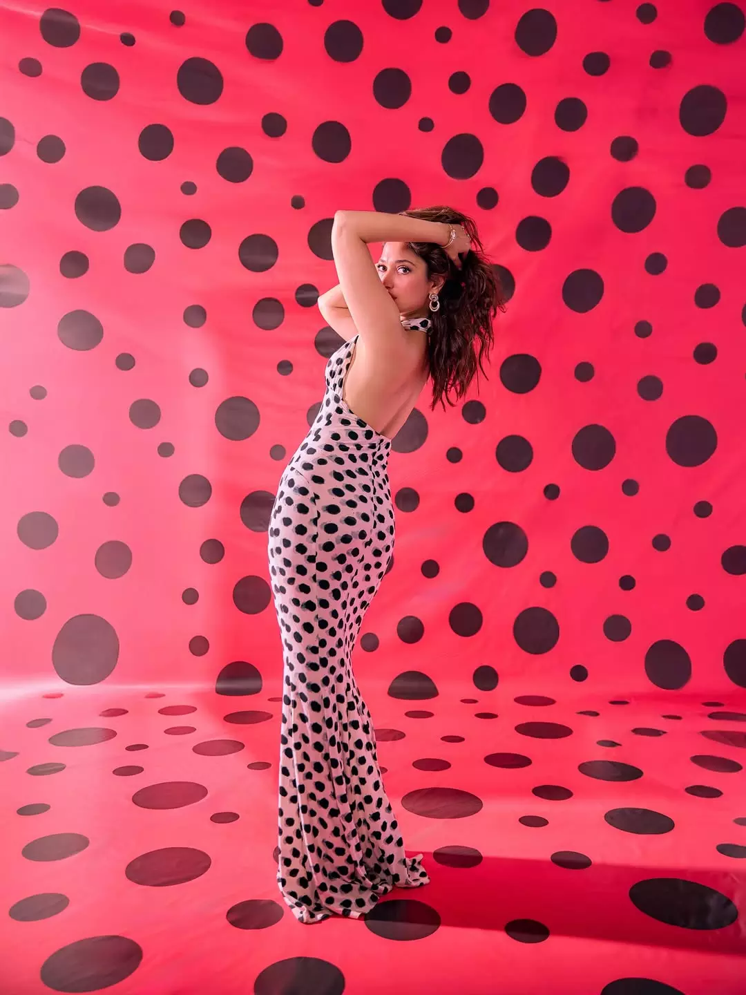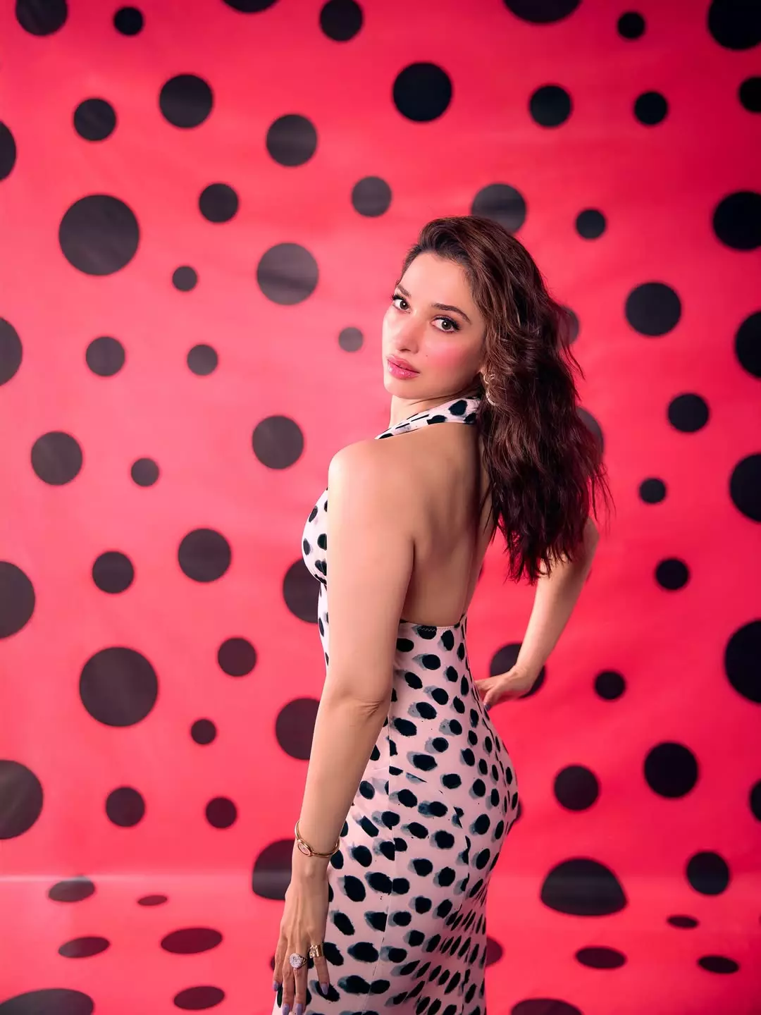 Tamannaah Bhatia shared a stylish picture on Instagram that caught everyone’s attention. In the photo, she is wearing a long white dress with black polka dots. The background also has a matching polka-dot design in red and black, which makes the picture look very creative and fun.