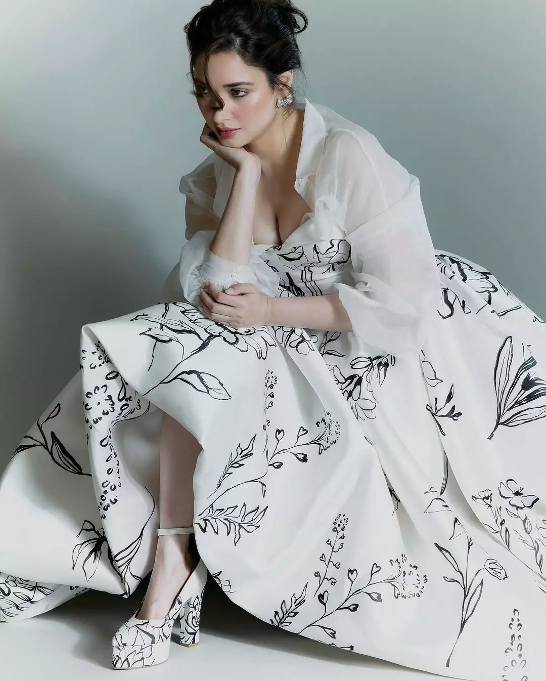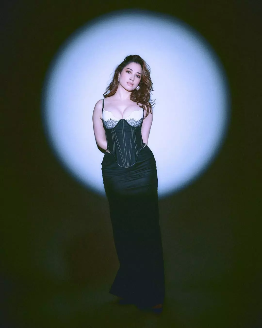 Tamannaah Bhatia shared a stylish picture on Instagram that caught everyone’s attention. In the photo, she is wearing a long white dress with black polka dots.
