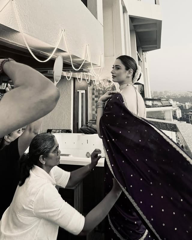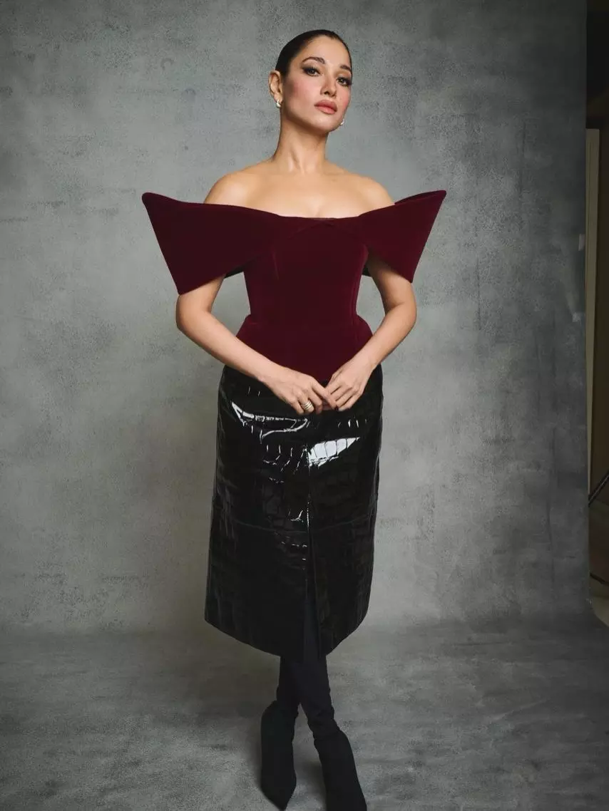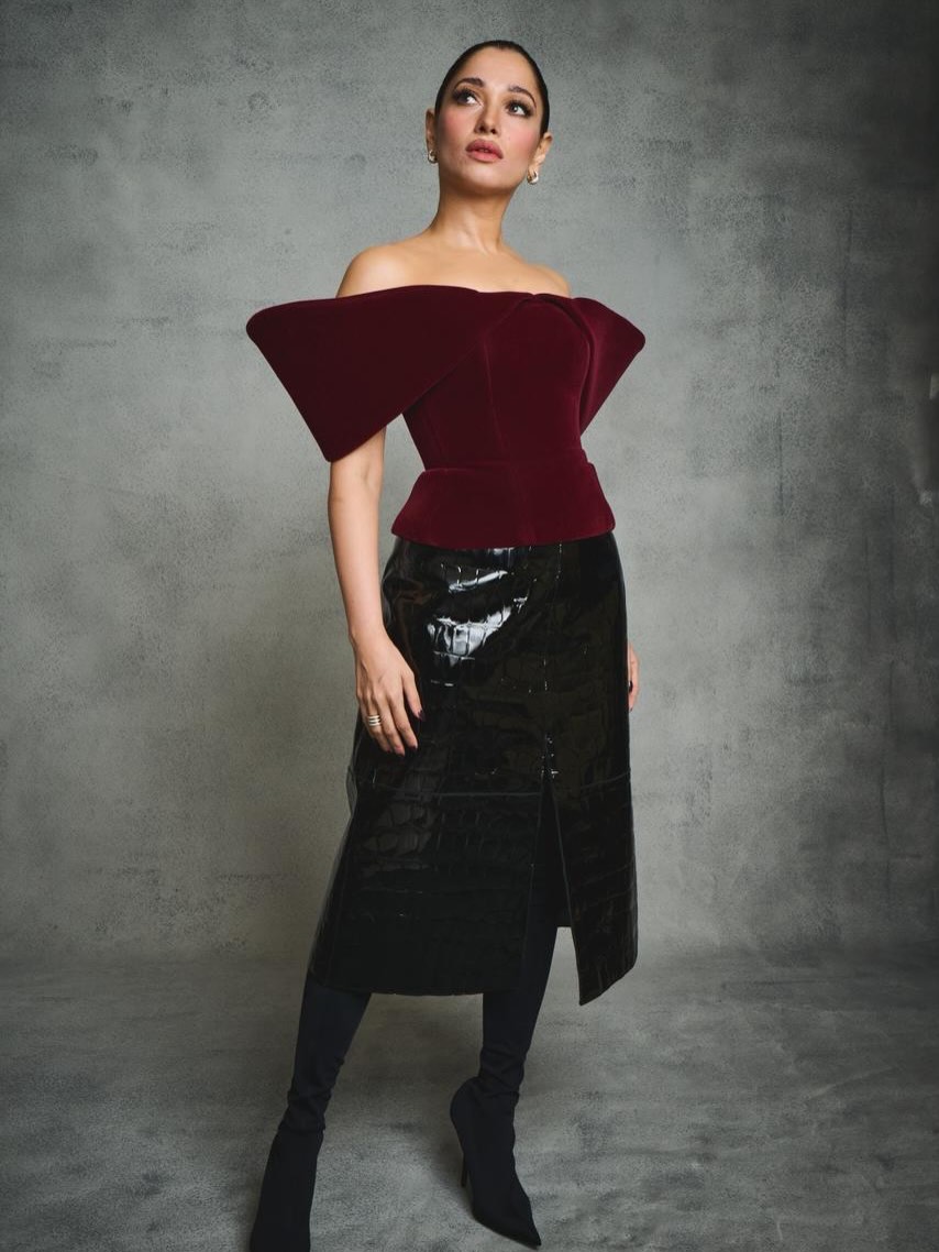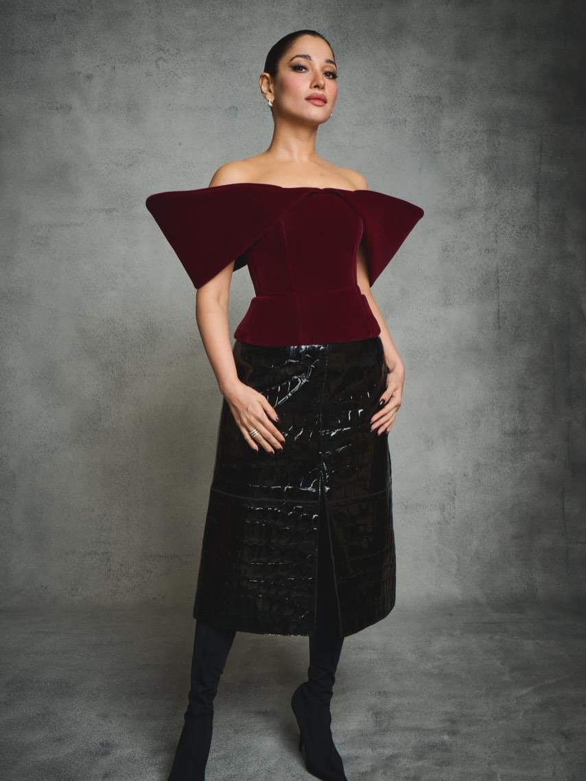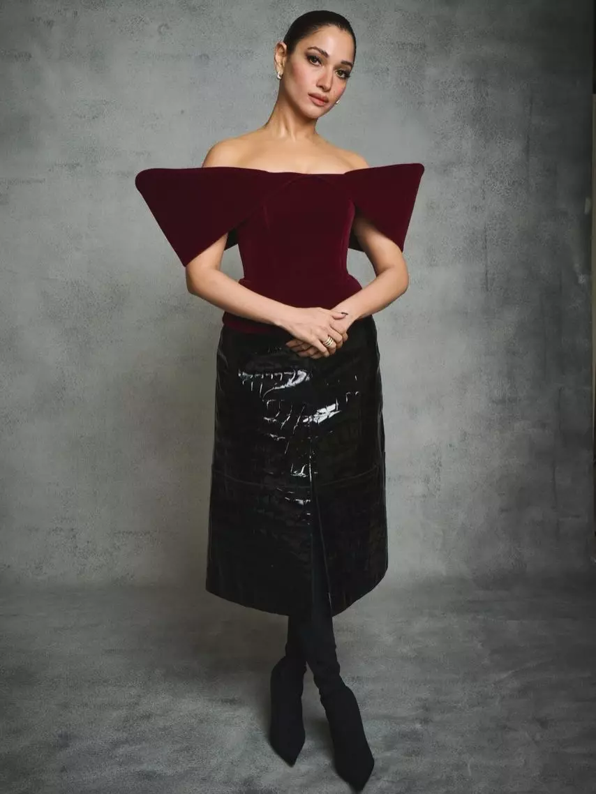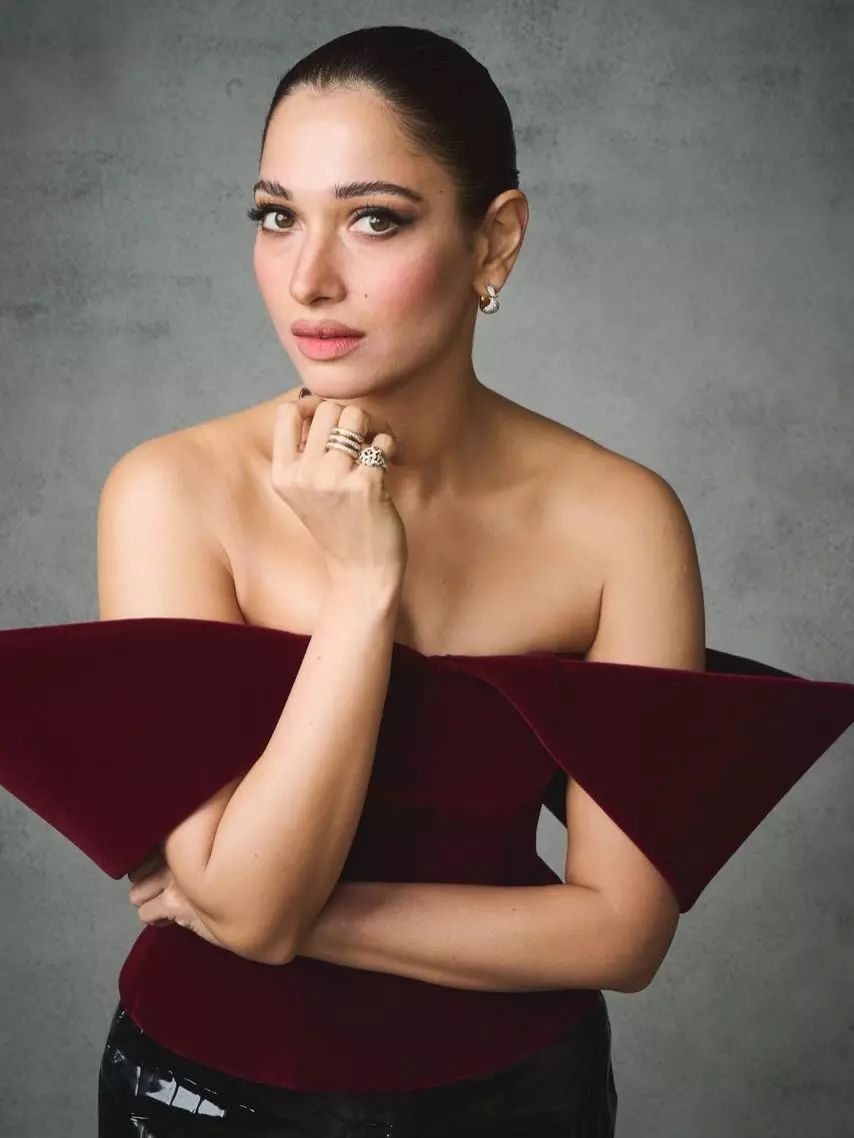 Tamannaah Bhatia looks fierce and elegant in this striking portrait. With her sleek pulled-back hairstyle, bold off-shoulder burgundy velvet top featuring dramatic structured sleeves, and subtle yet powerful makeup, she exudes confidence and timeless glamour.