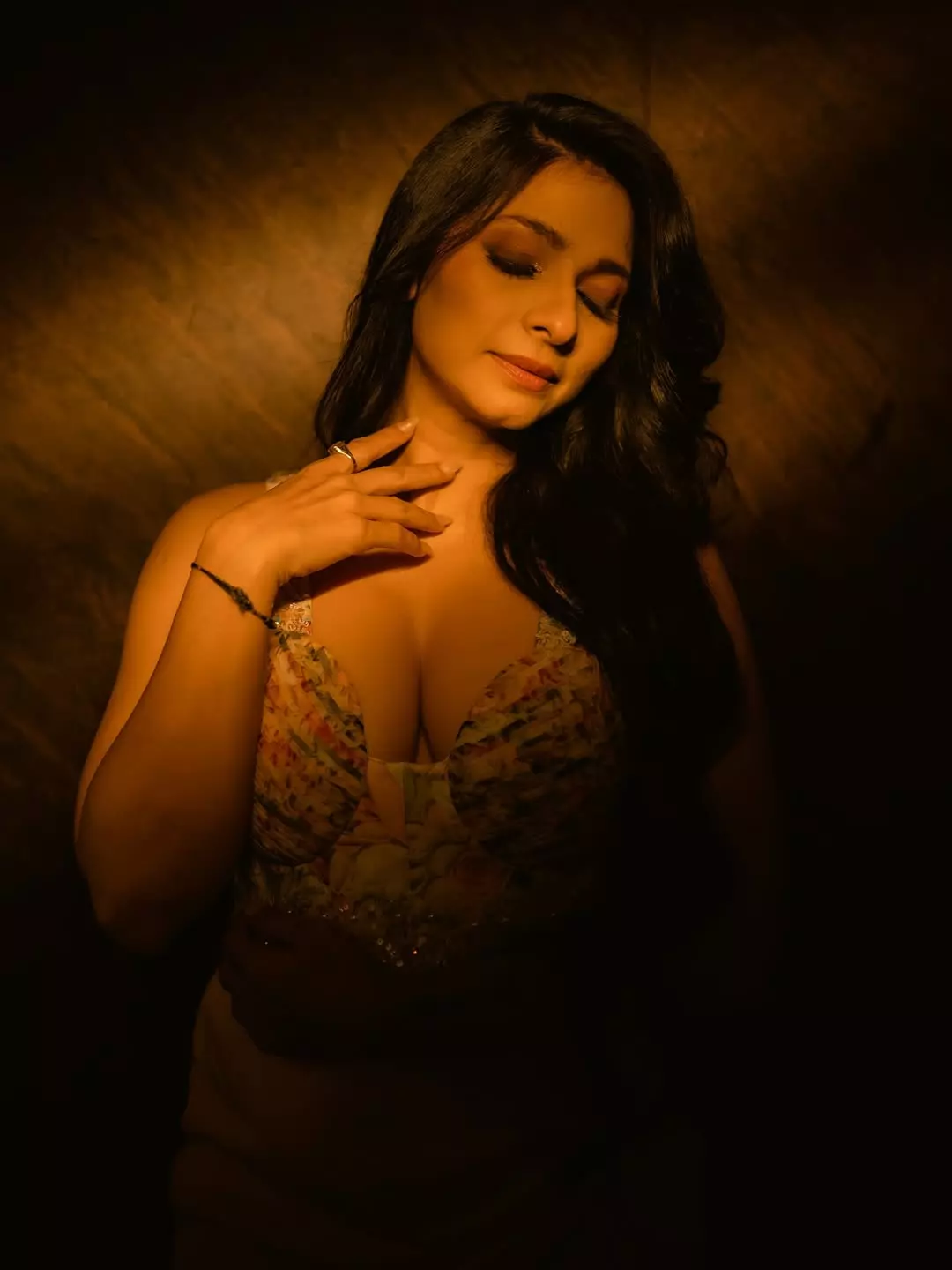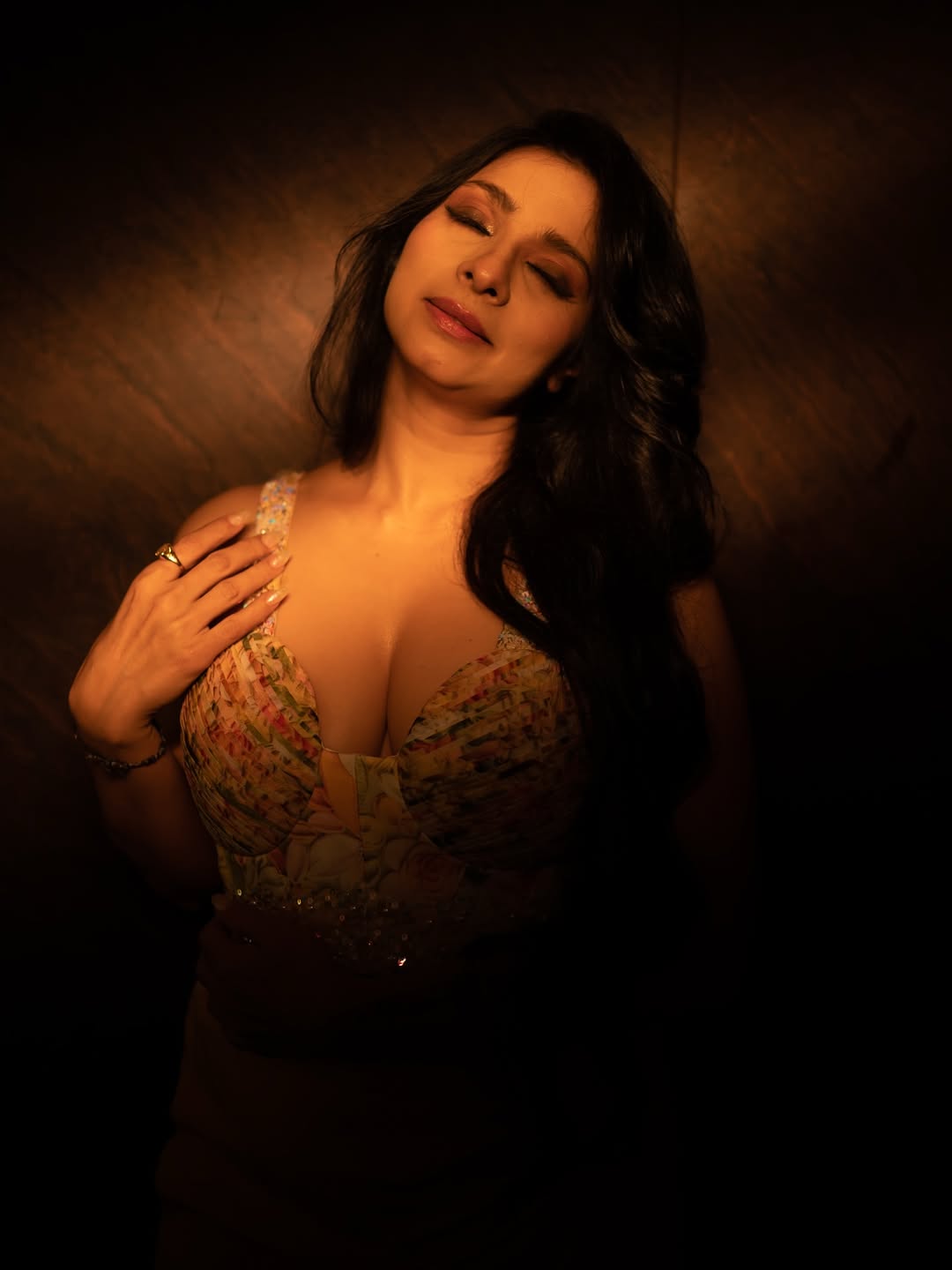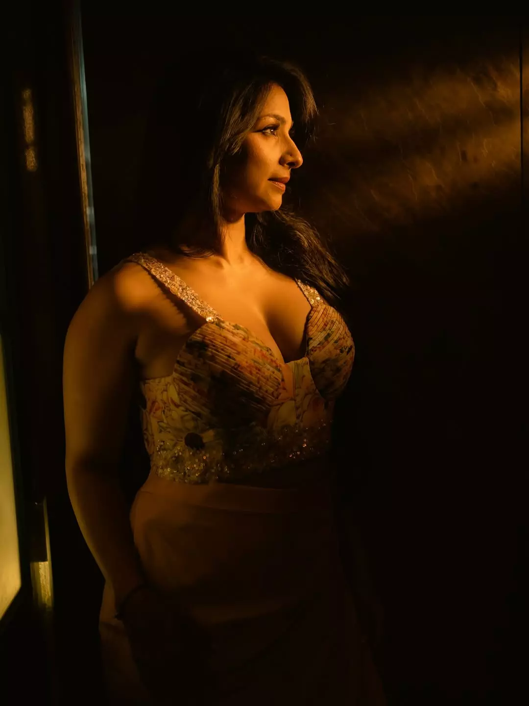 The picture shows her in warm light and the light highlights her to that has floral patterns and sparkling details.