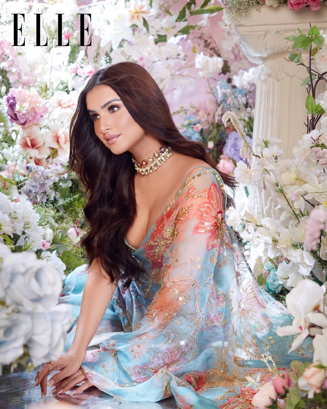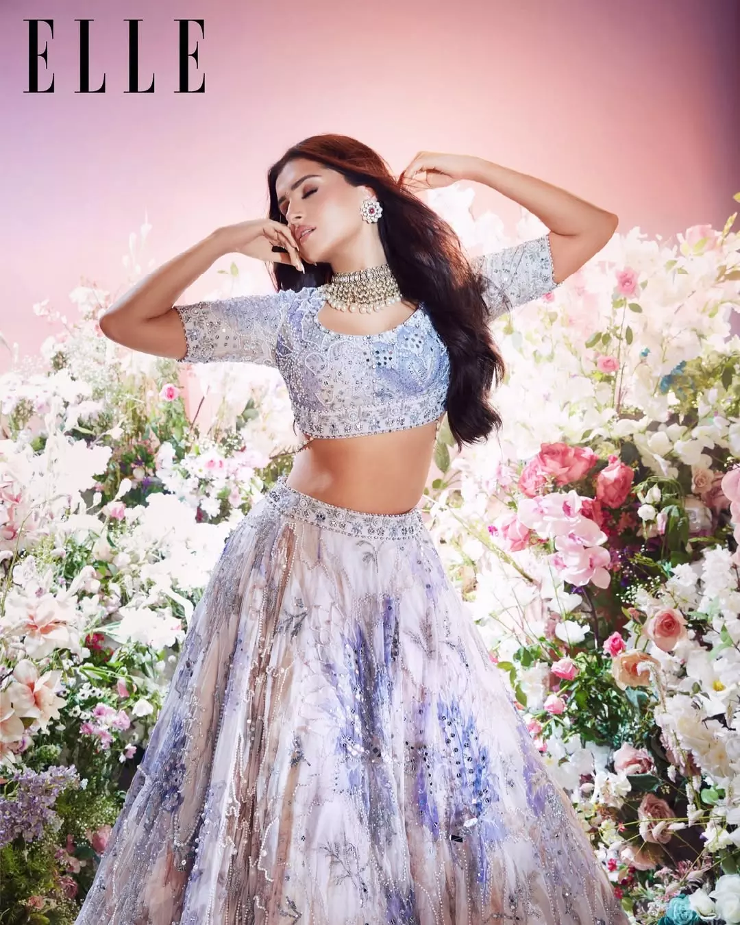 Her latest photoshoot shows her in a striking Golden look. A shoulder-drop golden sequence blouse with a matching saree, giving her a sharp yet elegant silhouette. The minimal styling lets the outfit and her natural beauty take center stage. Loose waves soften the look, while the palette lends a classic, almost vintage feel.