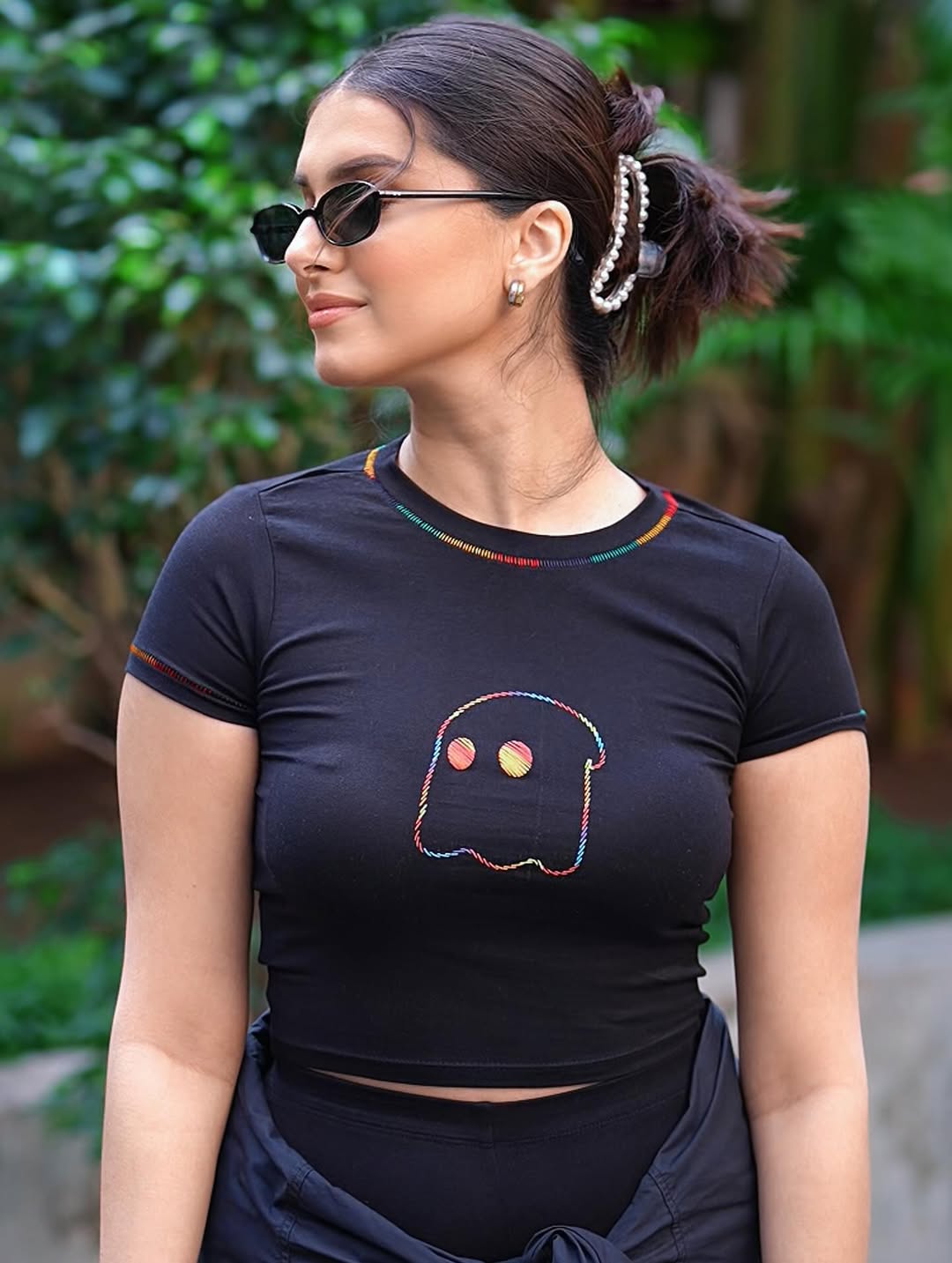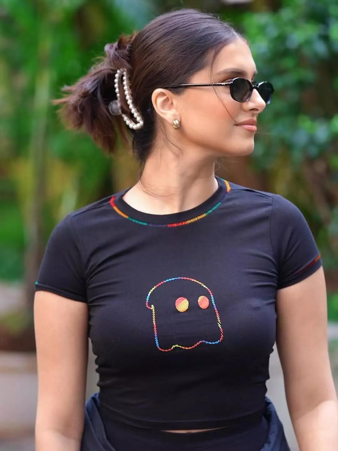 Tara Sutaria, the versatile Bollywood actress and singer, recently turned heads with a chic casual photoshoot. Sporting a black cropped tee featuring a colorful embroidered ghost design, paired with high-waisted black pants and a stylish ponytail accessorized with pearl clips, she exuded effortless cool. Completing the look with sleek black sunglasses and a subtle smile against a lush green backdrop, the image captures her blend of modern edge and natural grace, delighting fans on social media.