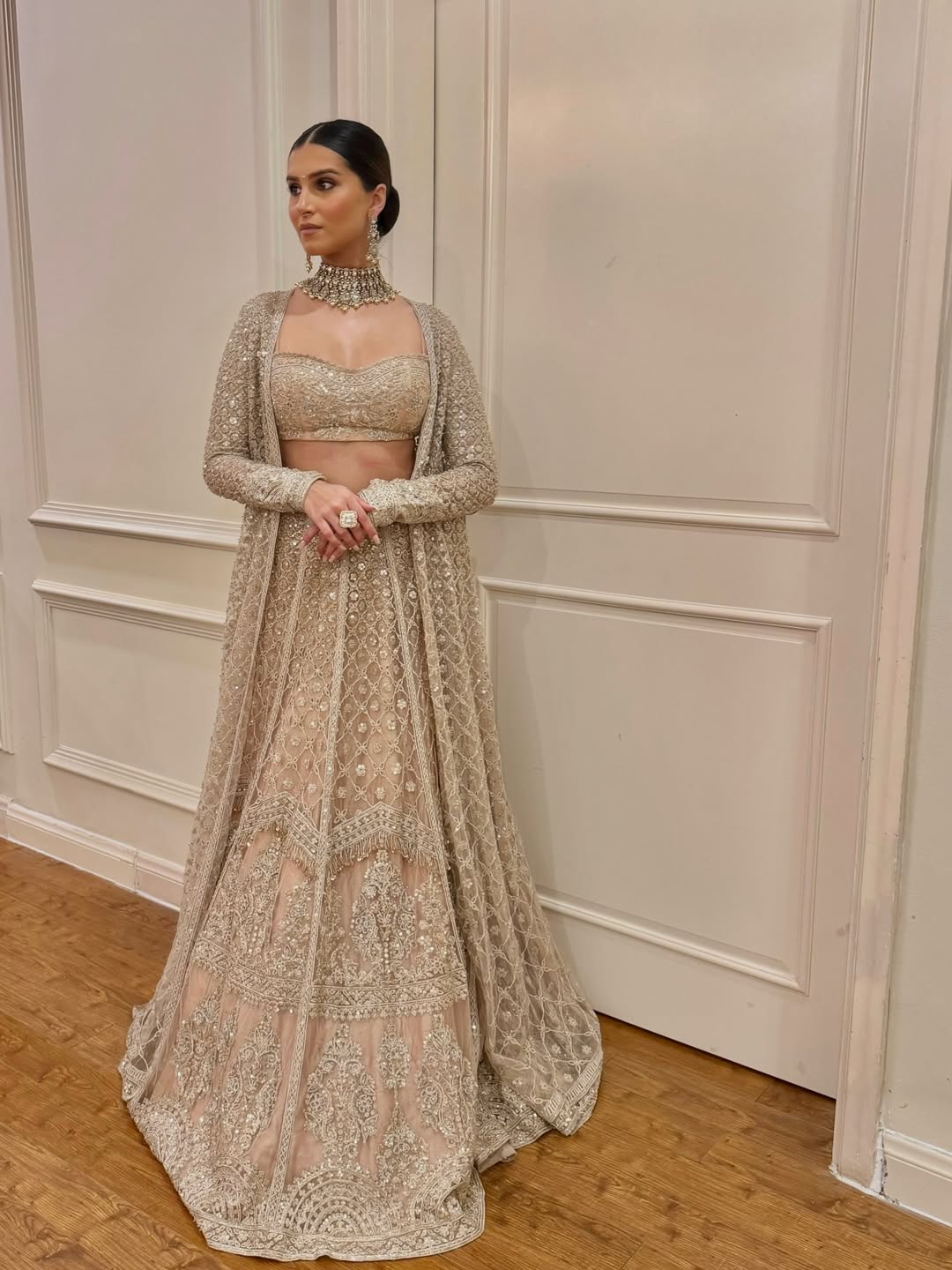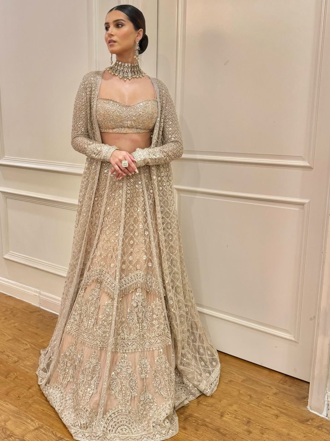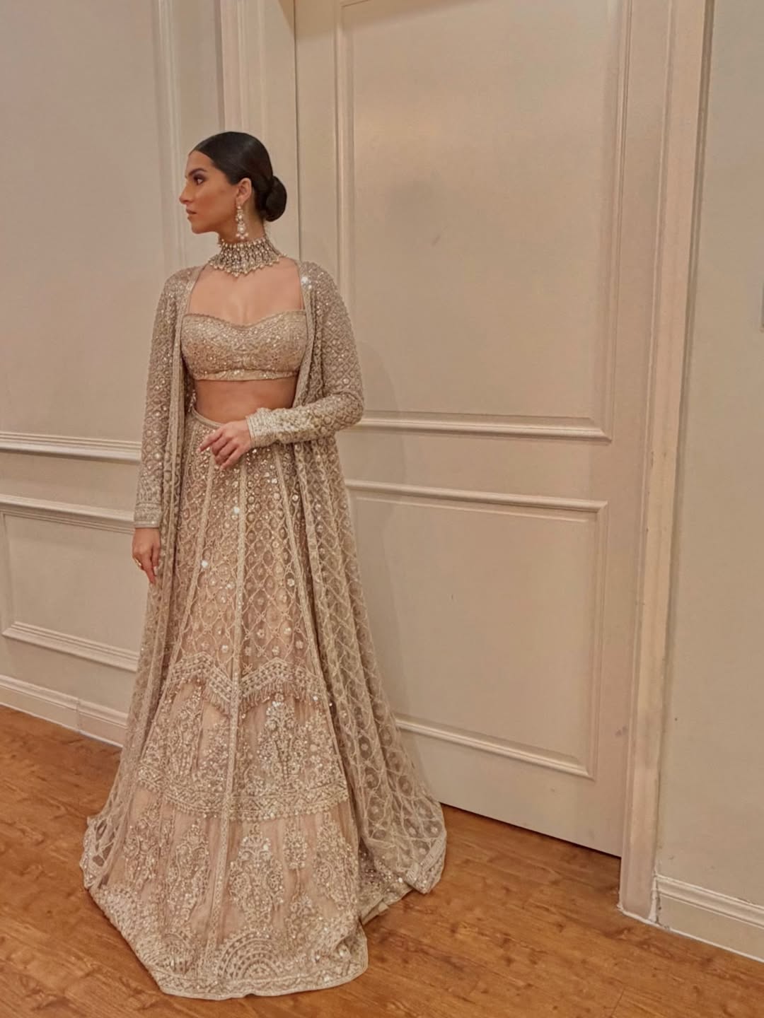 The ensemble featured a bandeau-style blouse paired with a long, matching overlay jacket, adding sophistication and a modern twist to the classic lehenga silhouette.
