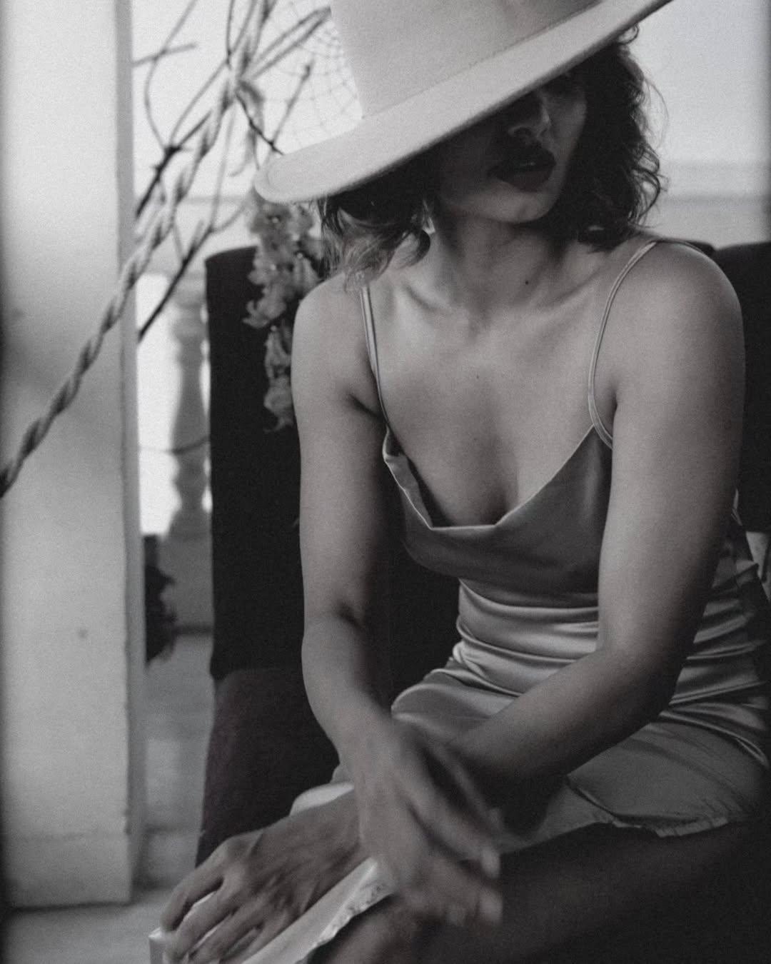 In this stunning poolside photograph, Tejaswi Madivada radiates effortless glamour and confidence. Seated in a sleek black swimsuit with gold accents, she holds a glass of white wine against a serene ocean backdrop, her curly hair framing a playful pout that perfectly captures her bold and vibrant personality.