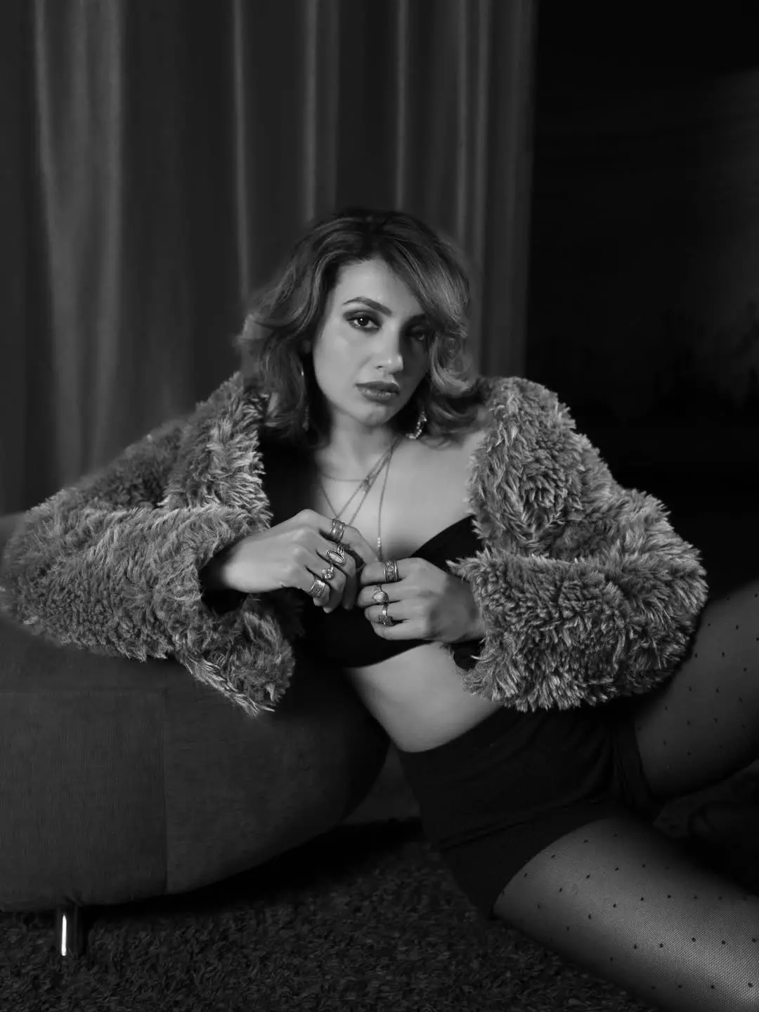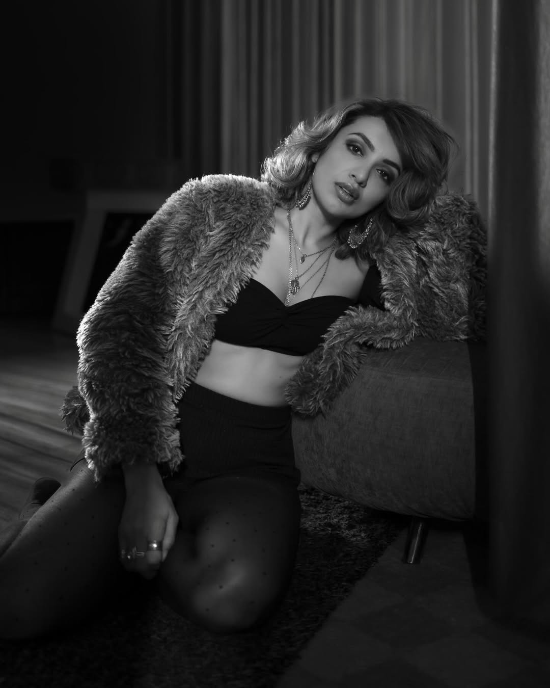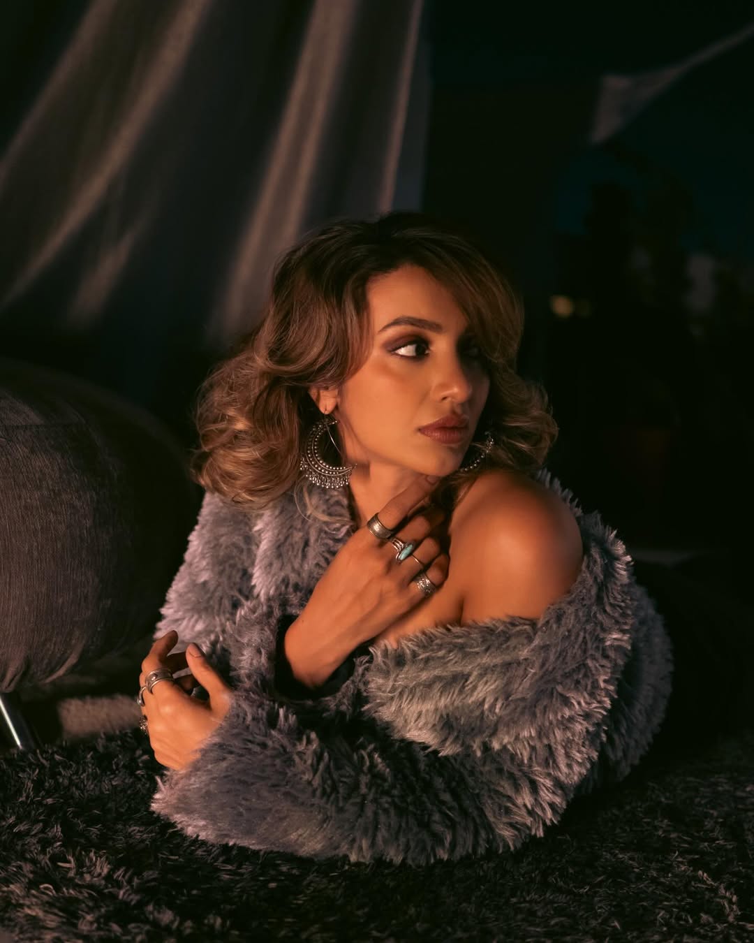Her accessories make a bold statement: multiple layered silver necklaces draw attention to her neckline, while large, dangling earrings frame her face, perfectly complementing the outfit’s chic and contemporary vibe. The combination of the strapless black piece with the plush jacket and standout jewelry strikes a balance between edgy sophistication and glamorous allure.