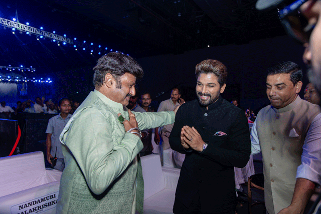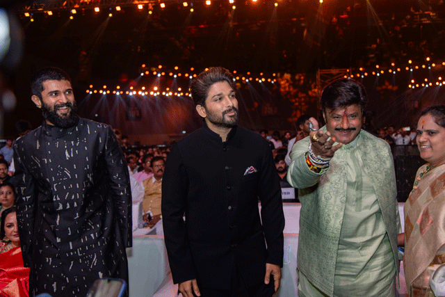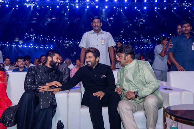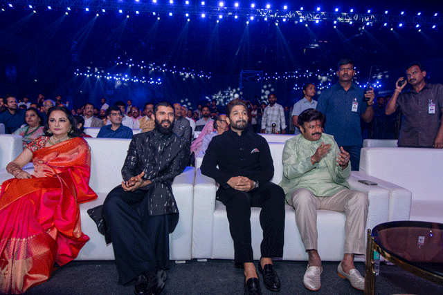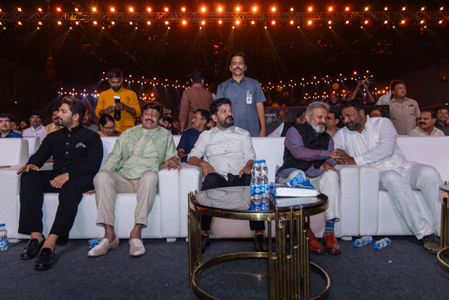 The event was graced by film legends including Nandamuri Balakrishna, Allu Arjun, S.S. Rajamouli, Dil Raju and Vijay Deverakonda, alongside political dignitaries like CM Revanth Reddy.