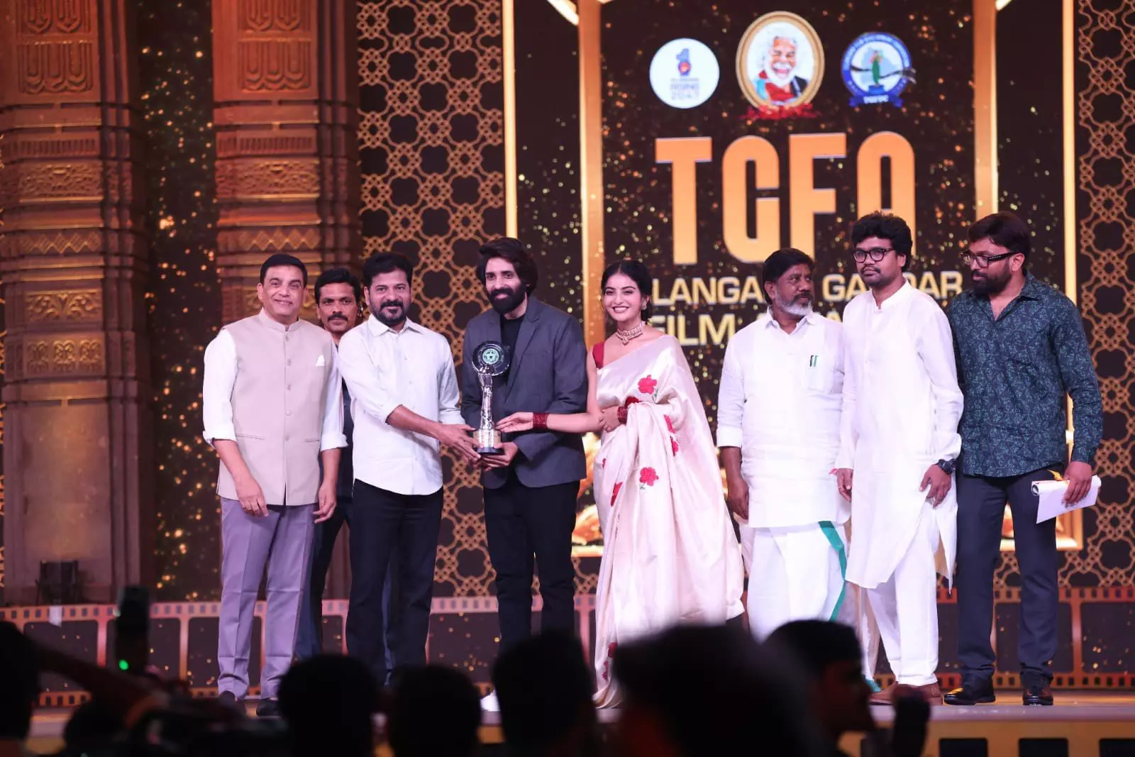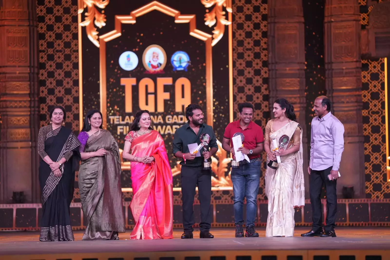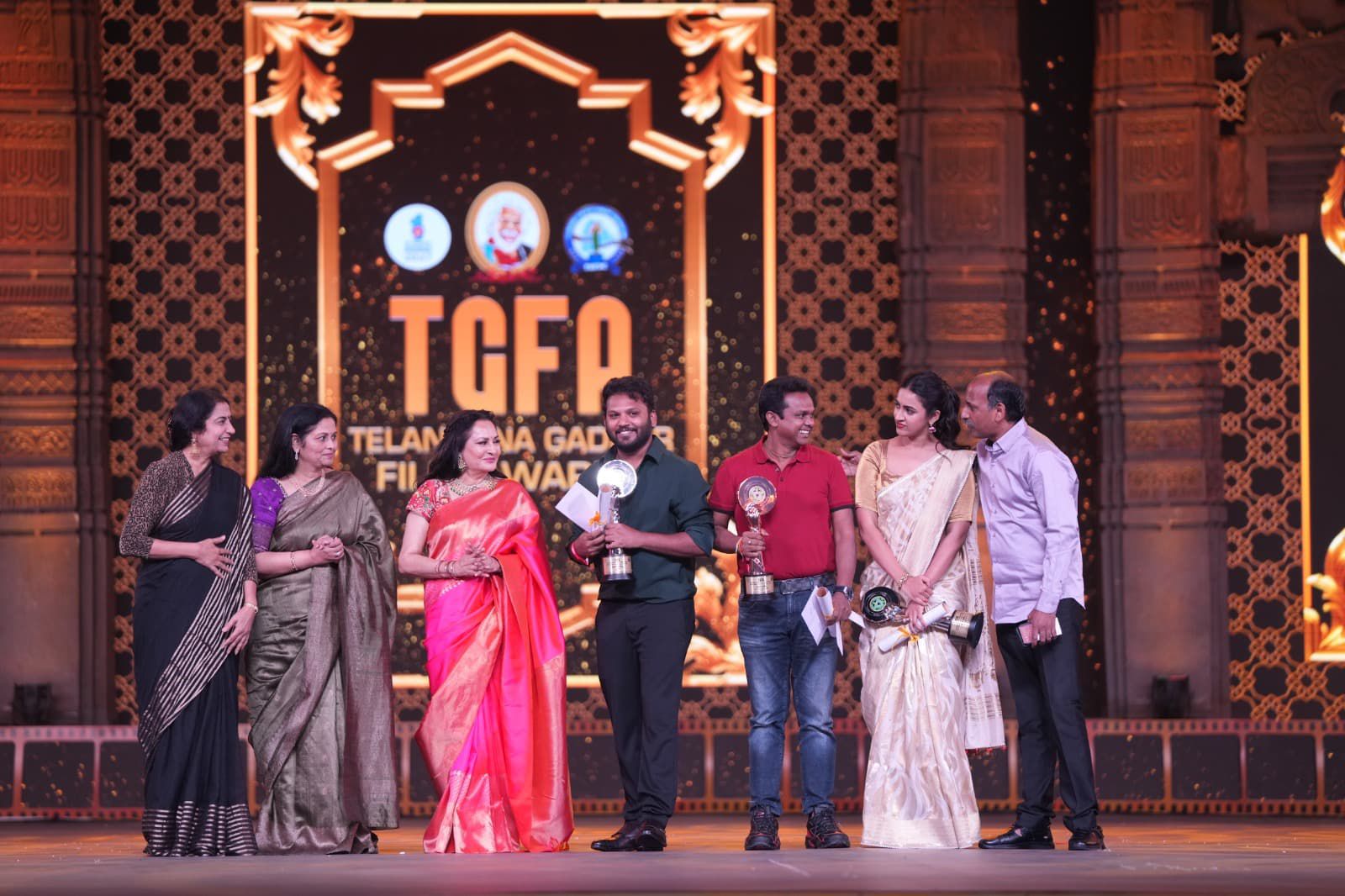 The Telangana Gaddar Film Awards brought the Telugu film industry together in a big way. For nearly 12 years, there had been no government-hosted film awards ceremony for Telugu cinema. However, in a move to encourage film artists, CM Revanth Reddy initiated the awards to honor the best movies, directors, actors, and actresses from each year since the formation of Telangana. Along with the T.G.F. (Telangana Gaddar Film) Awards, each winner also receives a cash prize of ₹5 lakhs.