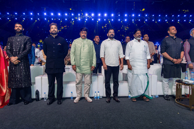 The event was graced by film legends including Nandamuri Balakrishna, Allu Arjun, S.S. Rajamouli, Dil Raju and Vijay Deverakonda, alongside political dignitaries like CM Revanth Reddy.