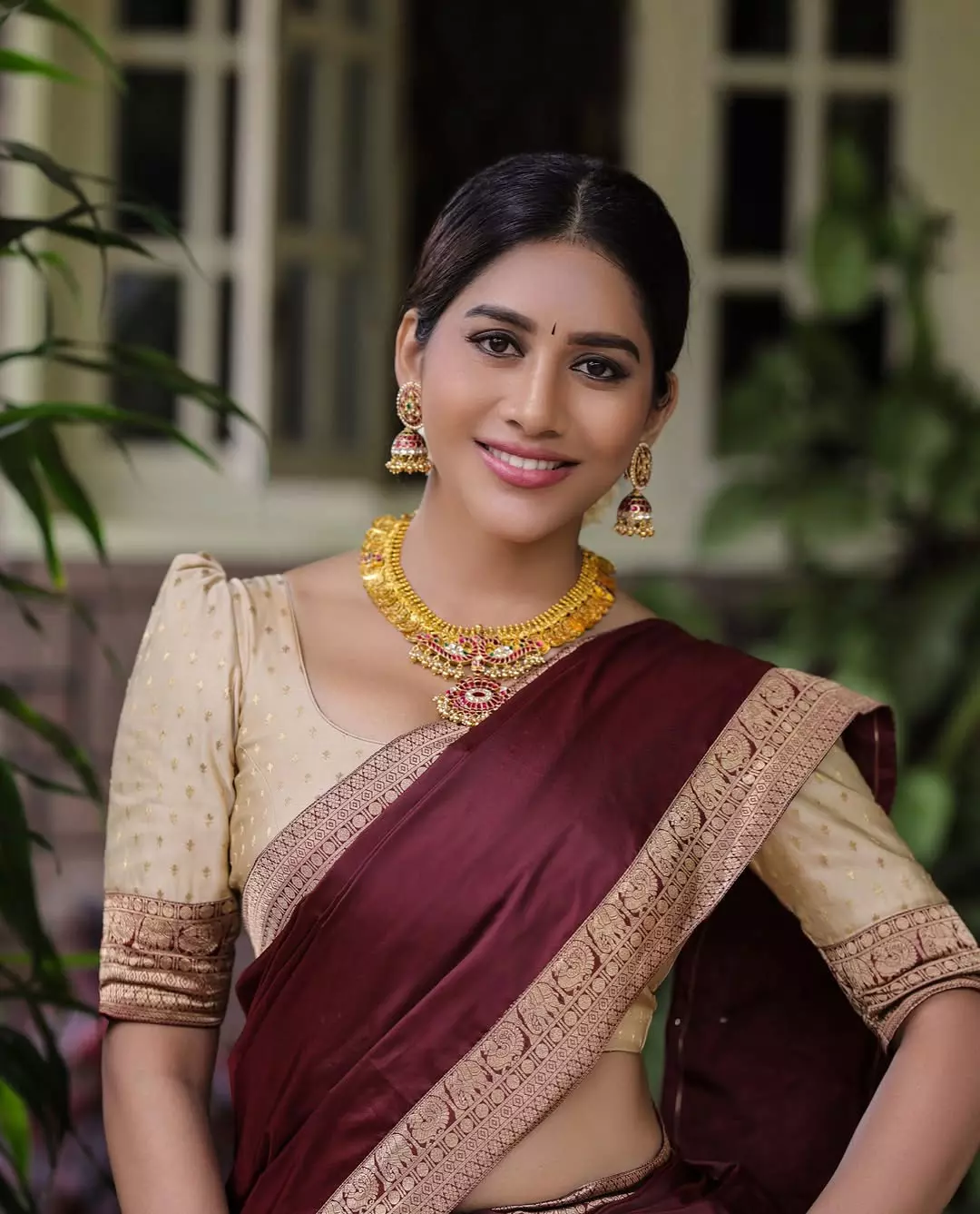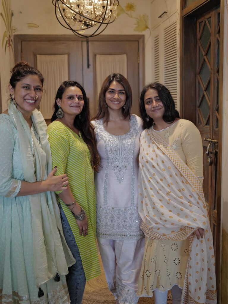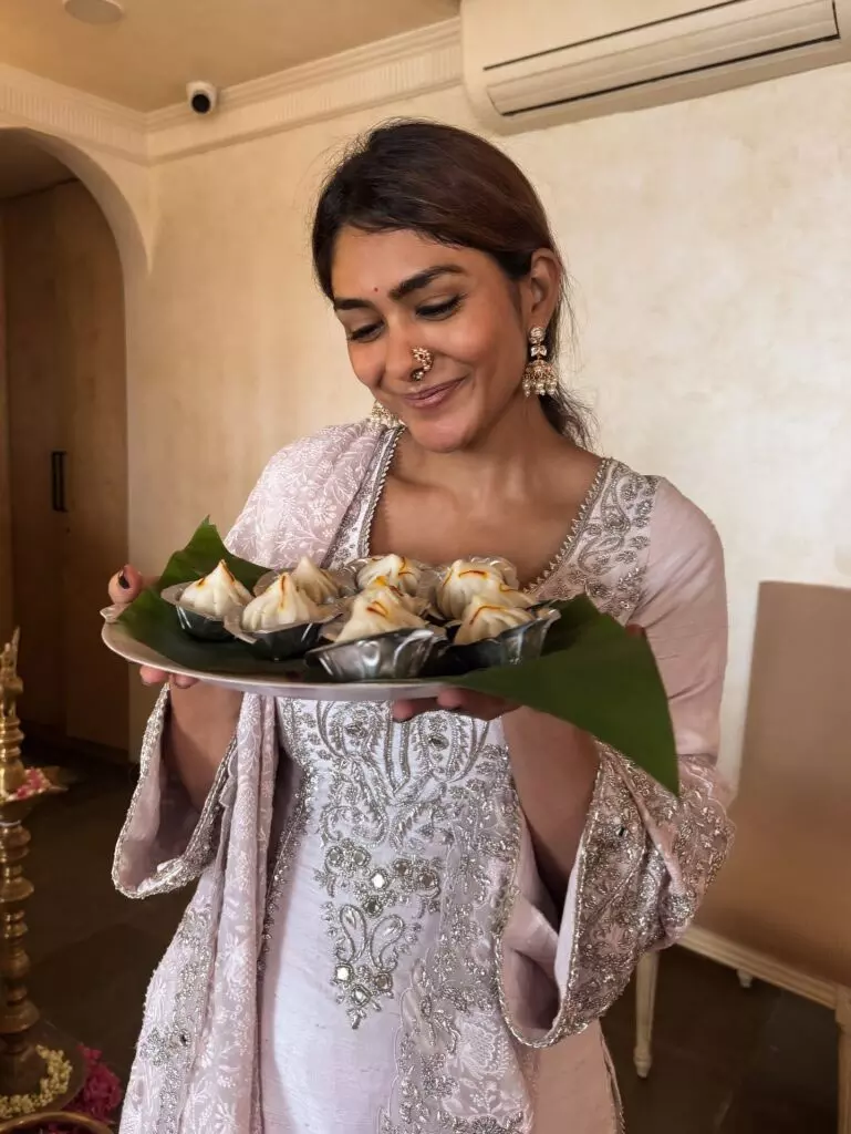Mrunal Thakur, who will soon be seen in the film Dacoit, kept her look elegant and minimal by wearing a white kurti set. Her simple style reflected sophistication and comfort, making it a perfect pick for the festival. Niharika Konidela chose a deep purple saree that added a rich and traditional touch to the evening. Her classic drape brought out the true essence of the celebration.