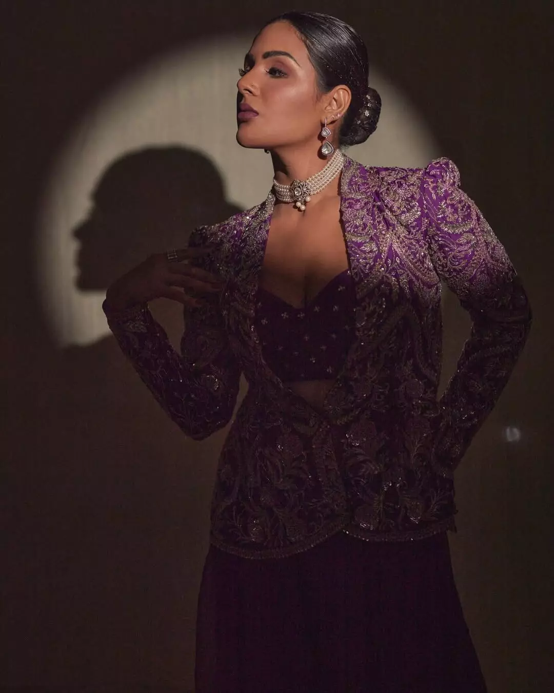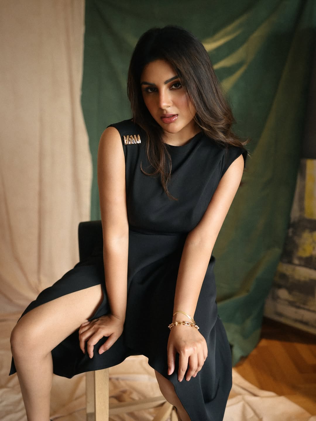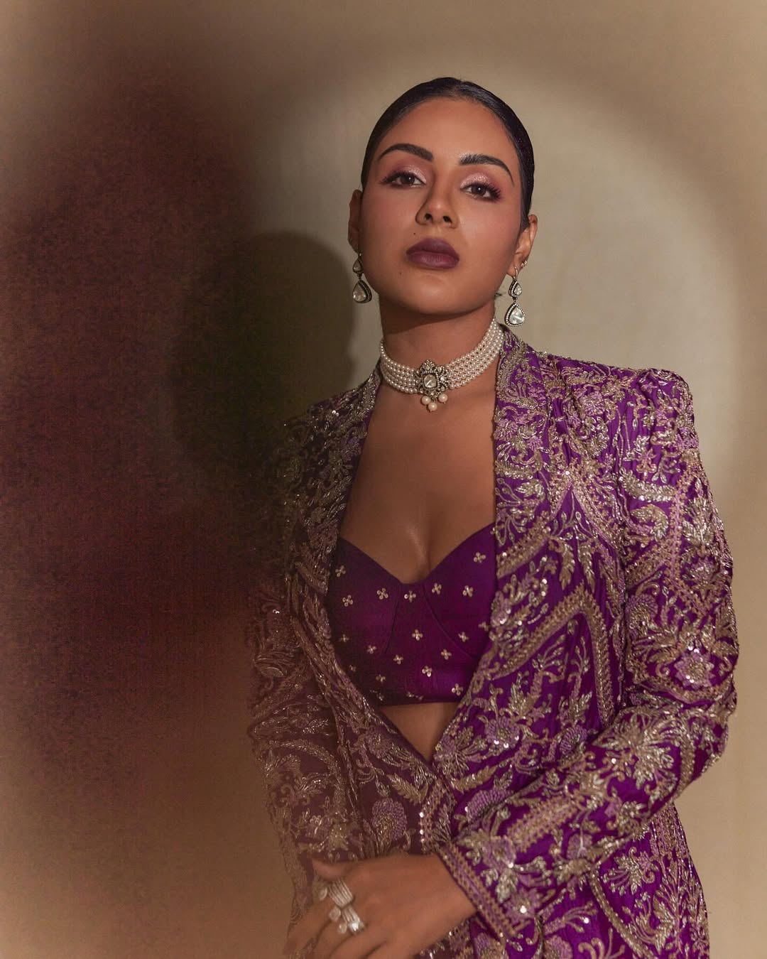 Samyuktha Menon stuns with effortless glamour in this mesmerizing portrait, wearing a sleeveless sequined dress bursting with intricate floral motifs in shades of navy, pink, and silver that catch the light beautifully. Paired with elegant emerald earrings and flawless makeup, she exudes sophistication and poise. "Of all flowers: