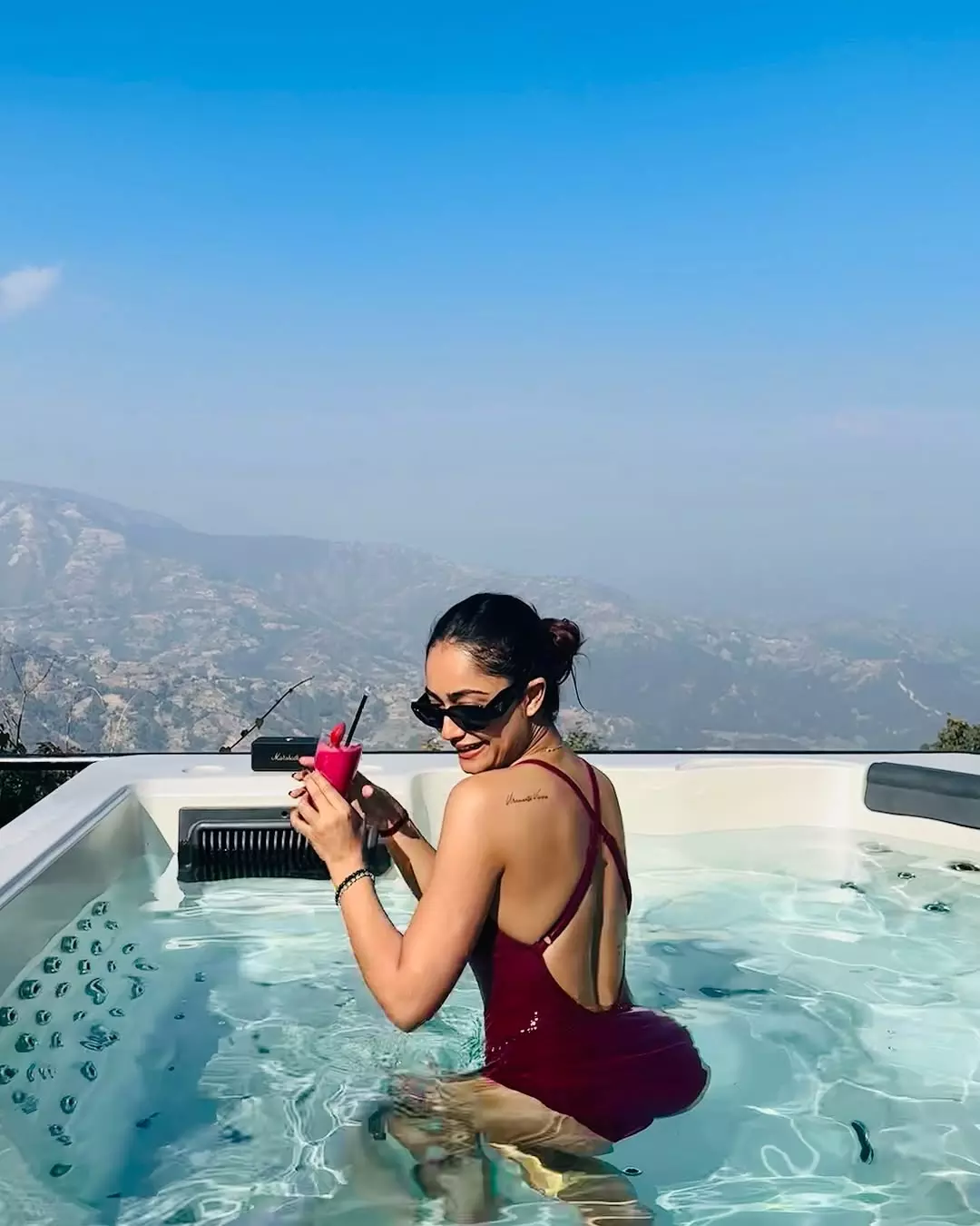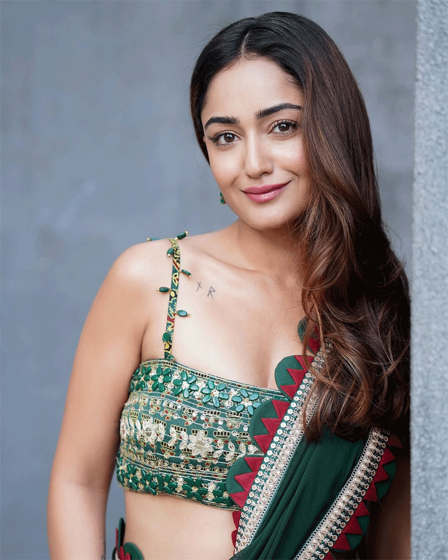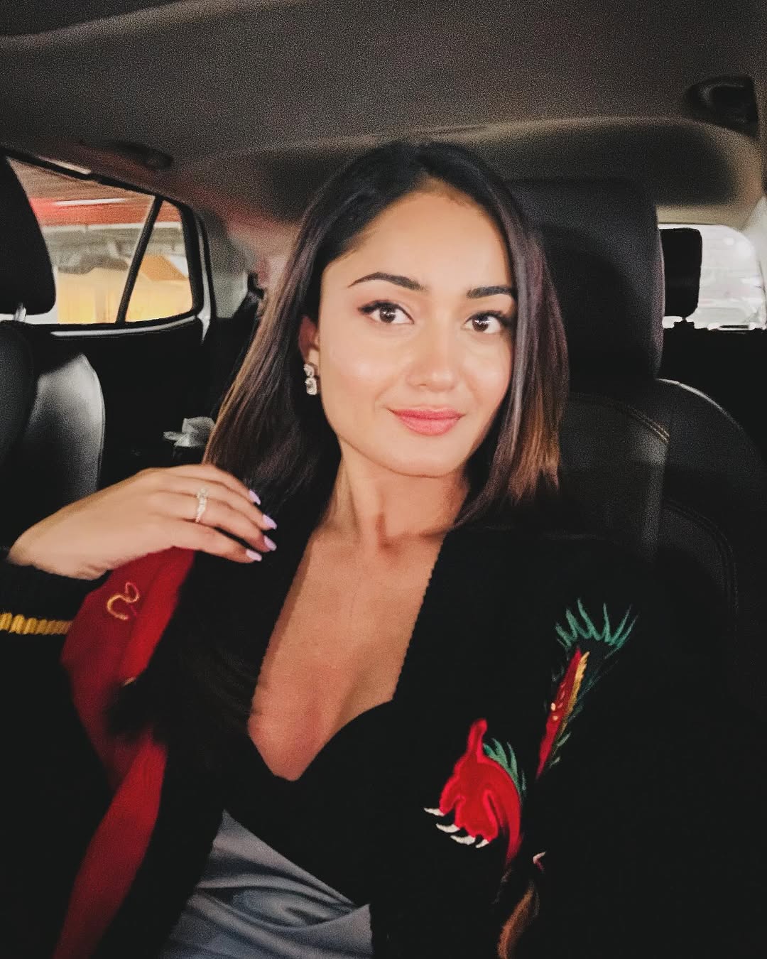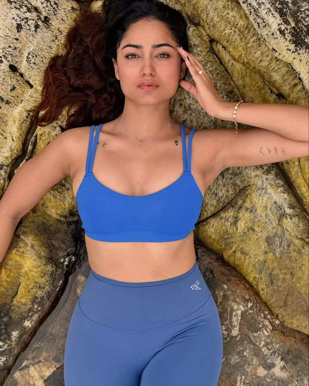 Tridha Choudhury radiates elegance in a mustard-yellow embroidered lehenga, her deep red-tinted waves catching the light as she poses against a wooden backdrop. She captioned the striking image: “She glowed differently—like dusk wrapped in flame.” - #misstriouslyyours