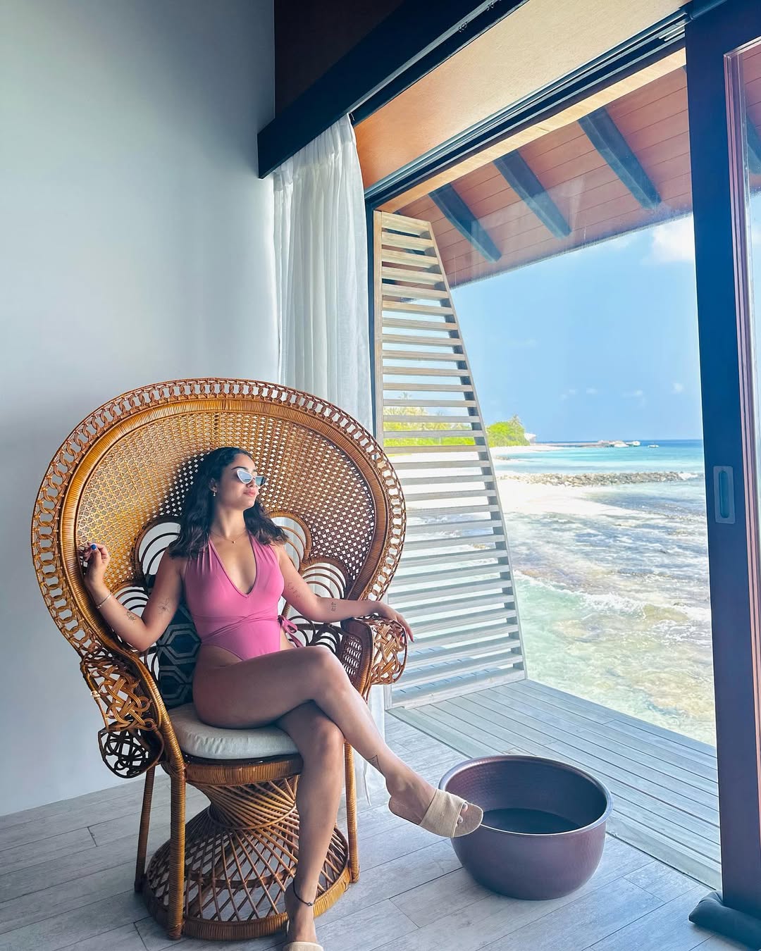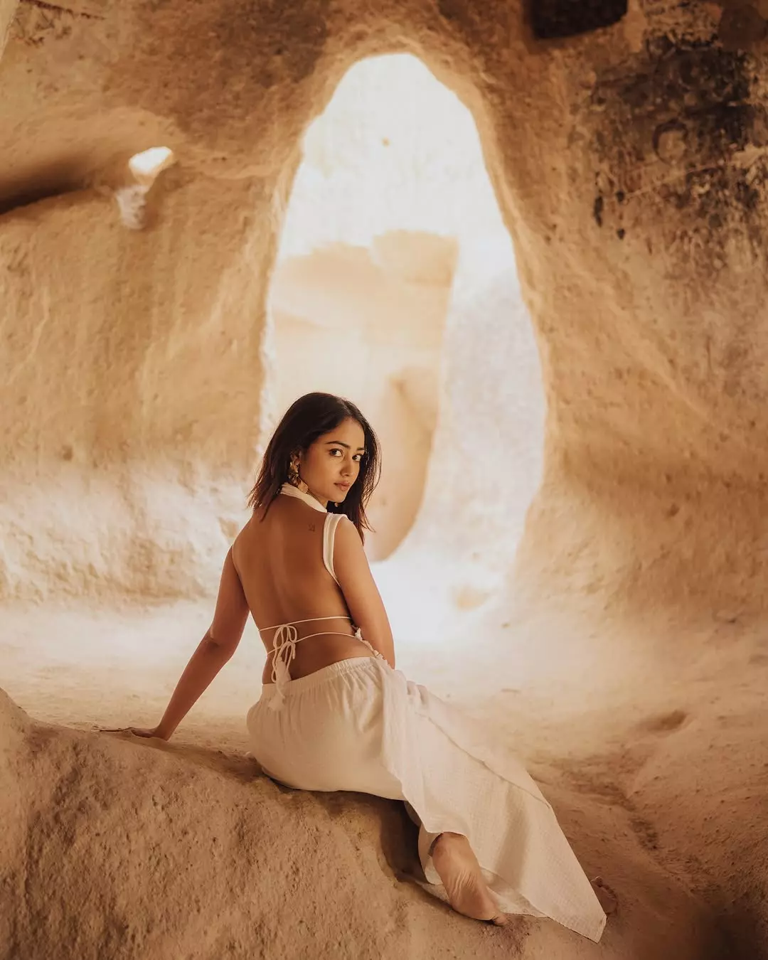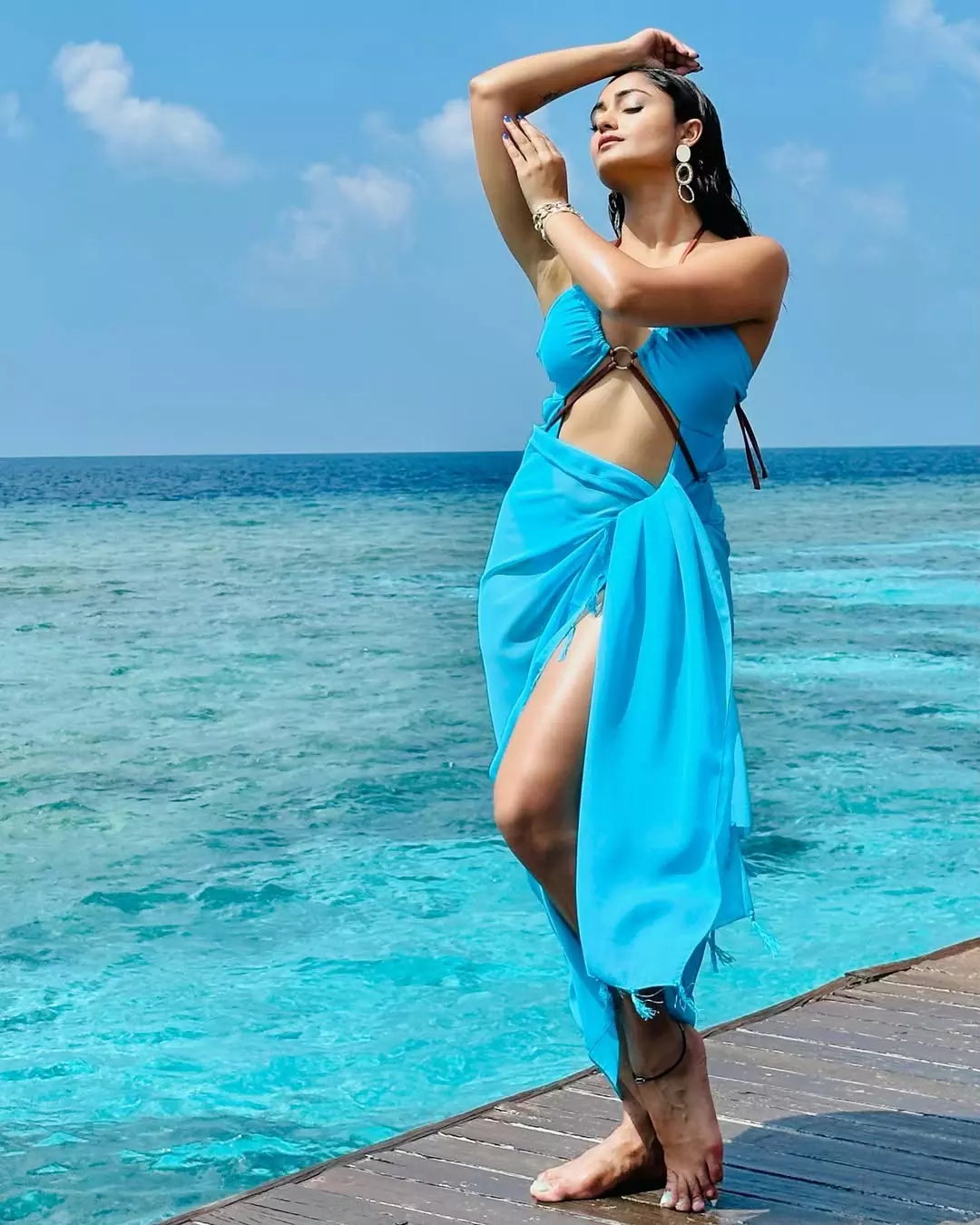 Tridha Choudhury radiates elegance in a mustard-yellow embroidered lehenga, her deep red-tinted waves catching the light as she poses against a wooden backdrop. She captioned the striking image: “She glowed differently—like dusk wrapped in flame.” - #misstriouslyyours