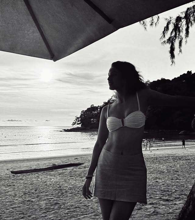 In one of the standout clicks, she’s seen sensually biting into a fruit, radiating a carefree confidence that mirrors her growing stature in the film industry. Her toned physique and relaxed pose make a strong case for slow fashion and body positivity.