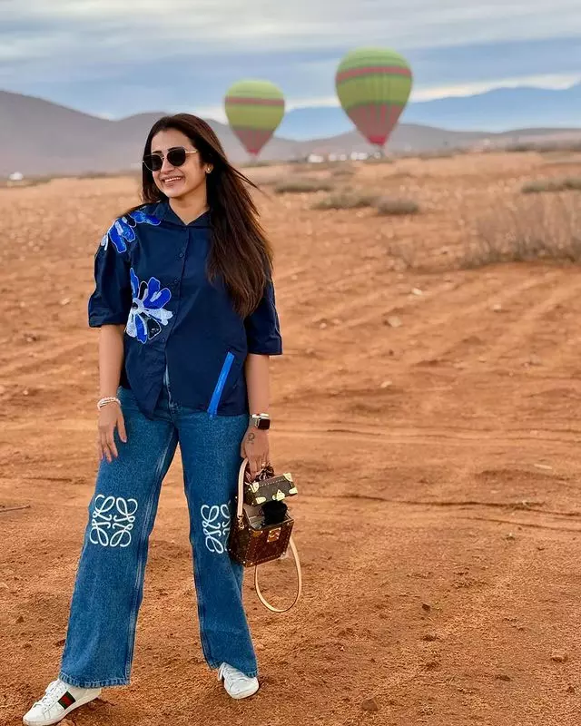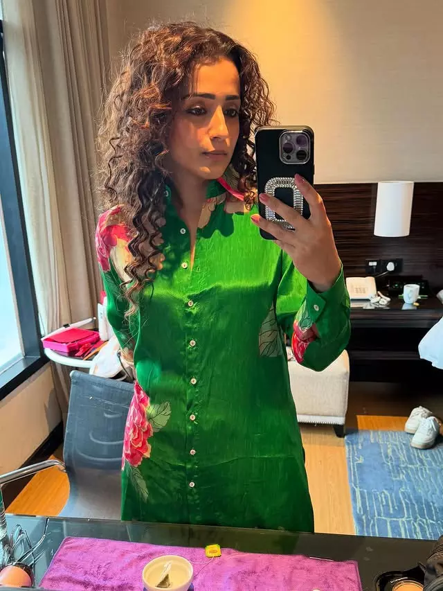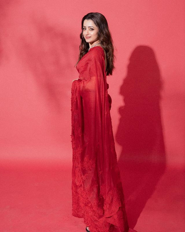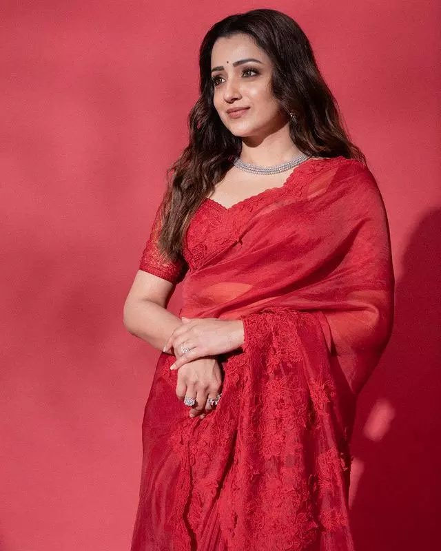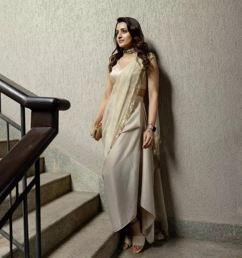 Dressed in a delicate, pastel pink outfit adorned with butterflies and ruffled sleeves, Trisha looked effortlessly chic and graceful.