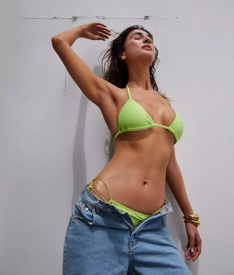 In a fresh and vibrant new photoshoot against a bright lime-green backdrop, Vaani Kapoor exudes effortless charm and confidence. Wearing a figure-hugging off-white slip dress adorned with colourful sea-themed embroidery — including starfish, seashells, and seahorses — with delicate blue trim and tie straps, the actress delivers a sultry yet fresh gaze. The summery ensemble perfectly highlights her graceful style and glowing presence.