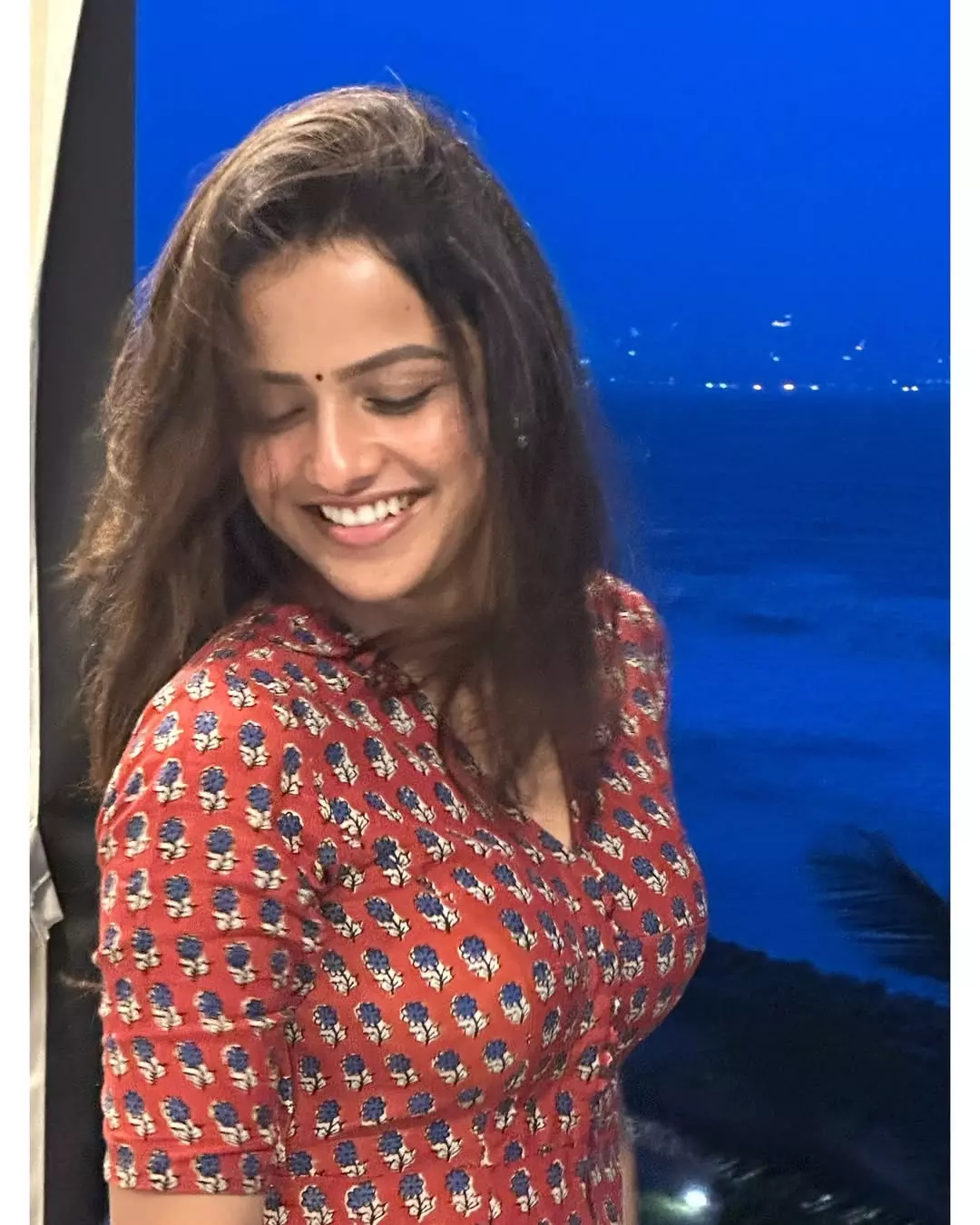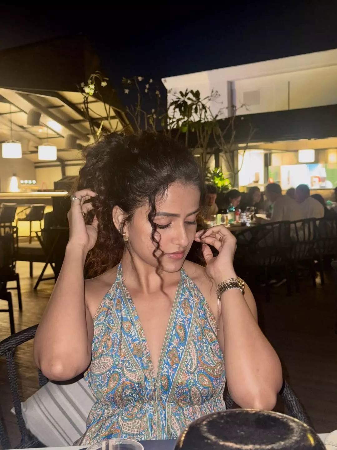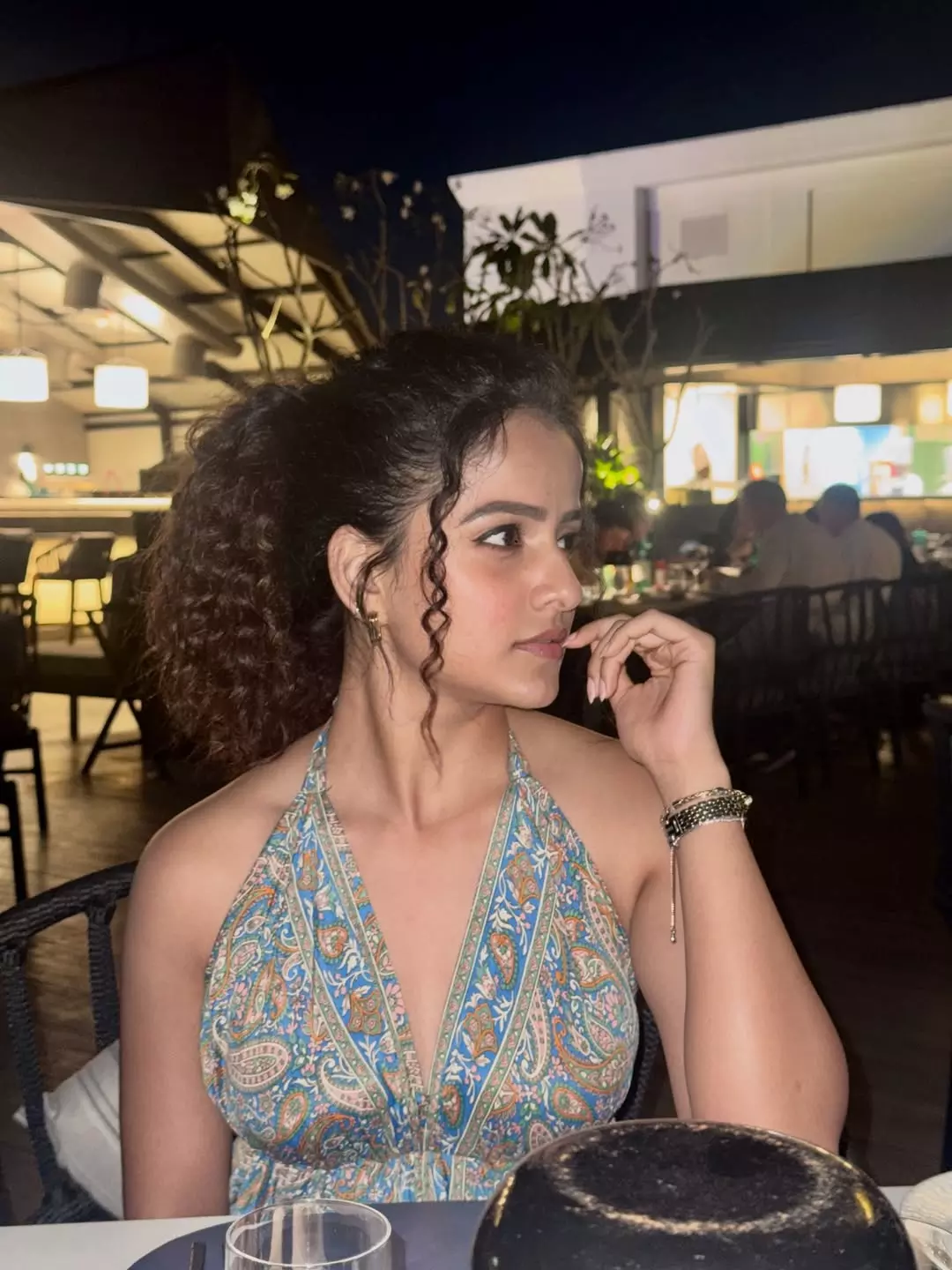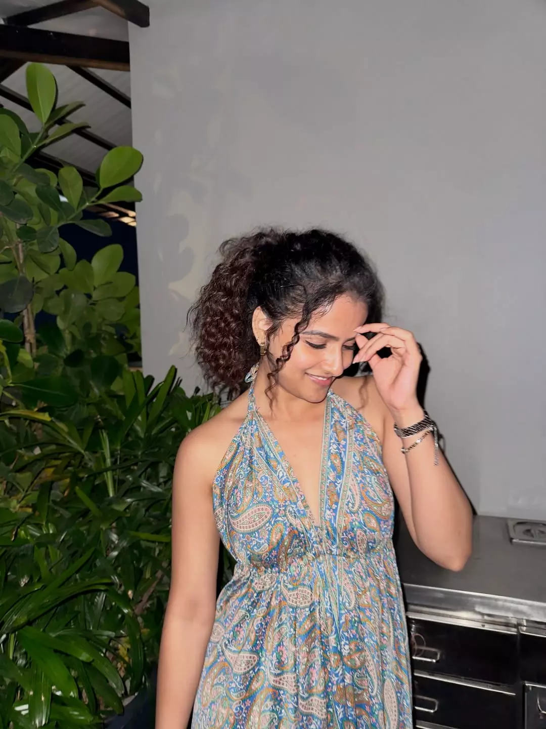 This graceful photograph of Vaishnavi Chaitanya captures her in a vibrant multicoloured paisley halter-neck dress, with curly hair tied in a playful high ponytail.