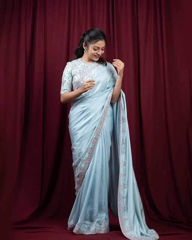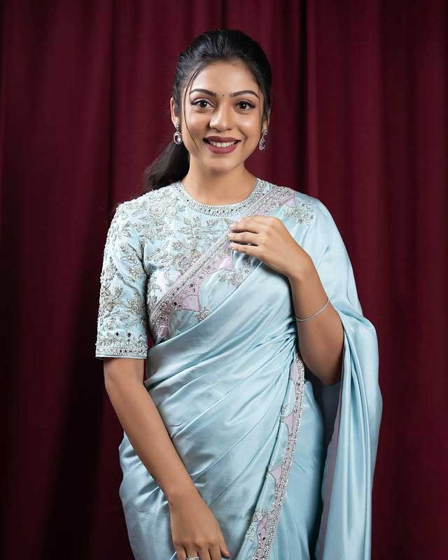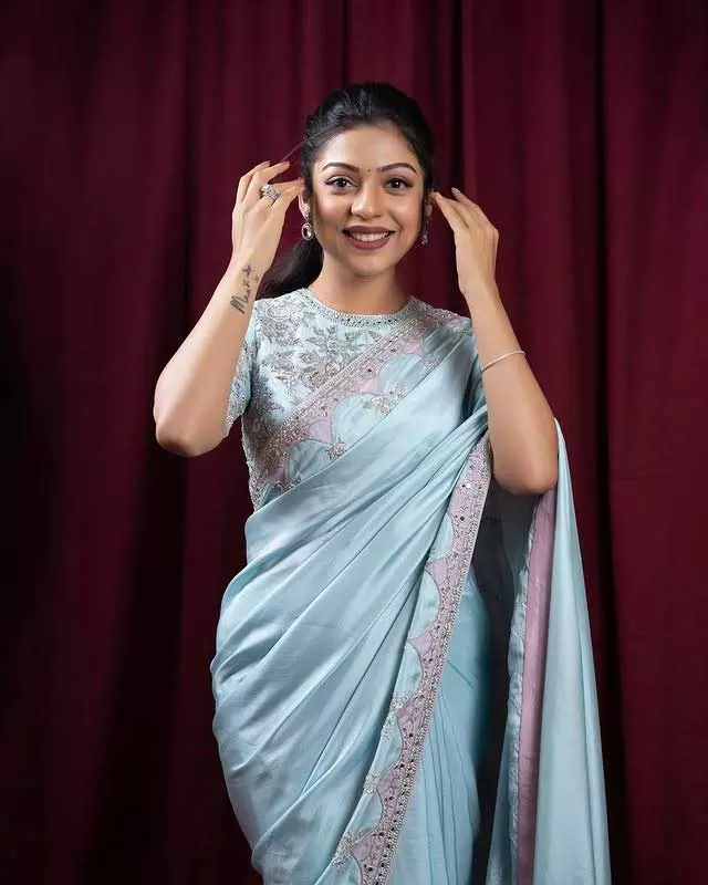 Varsha Bollamma known for her charming presence on screen, looks effortlessly elegant in a stunning light blue saree that she posted recently on Instagram. The post, accompanied by a caption says, "Saripoda shanivaram X Saree kadadam guruvaaram.�