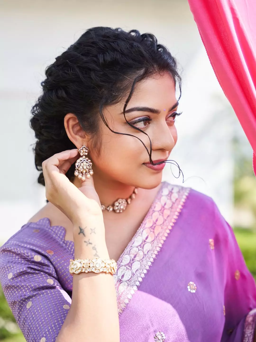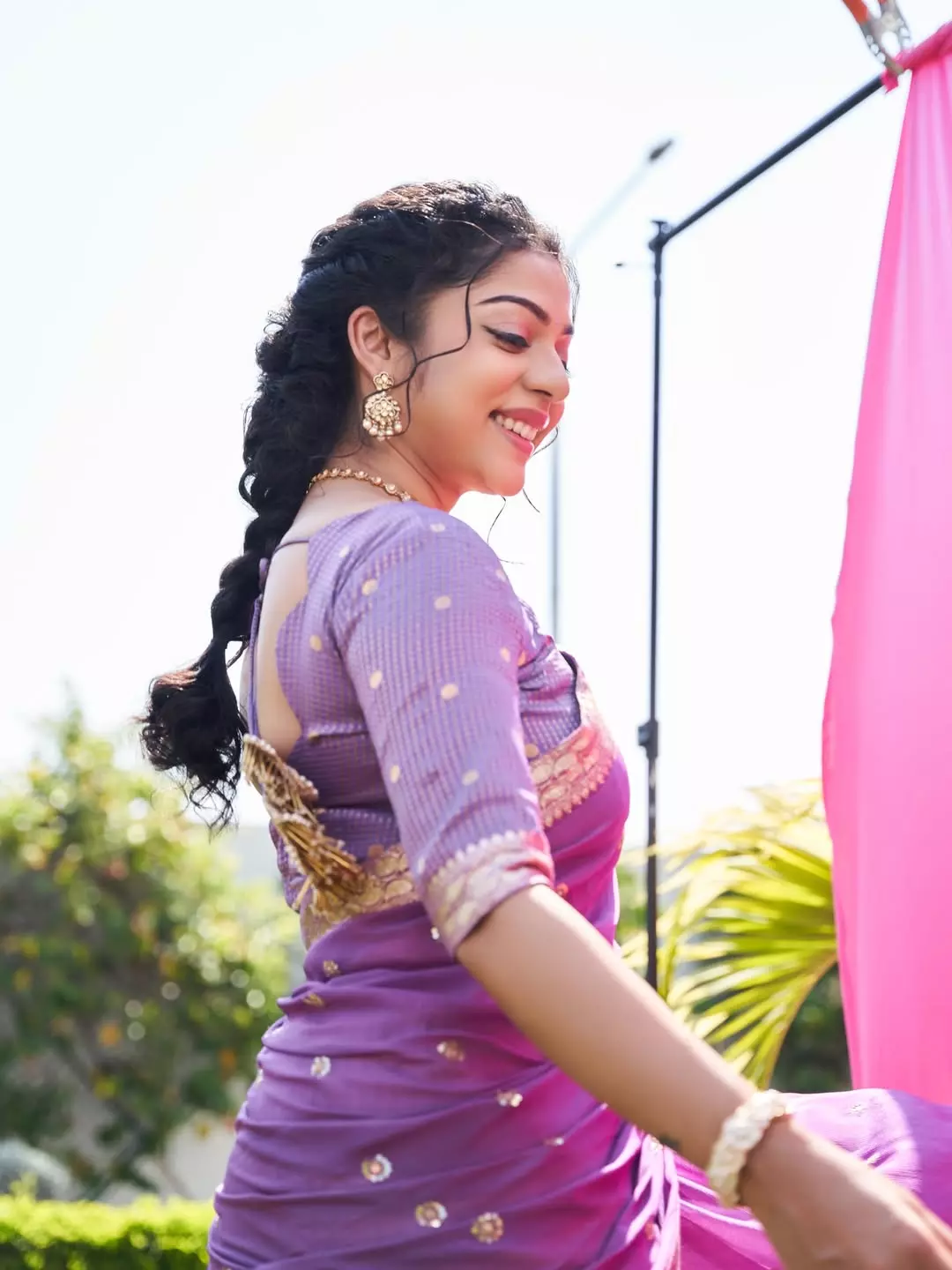 Radiating joy and vibrant energy, Varsha Bollamma looks absolutely breathtaking in this purple-and-cream traditional ensemble.