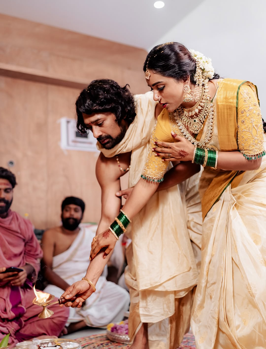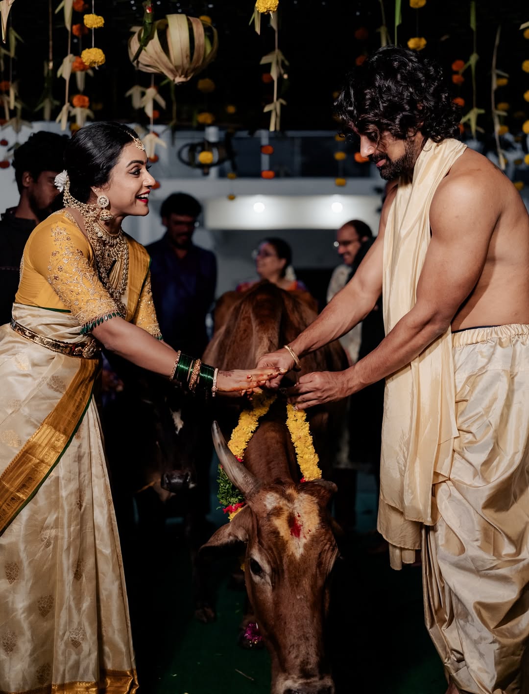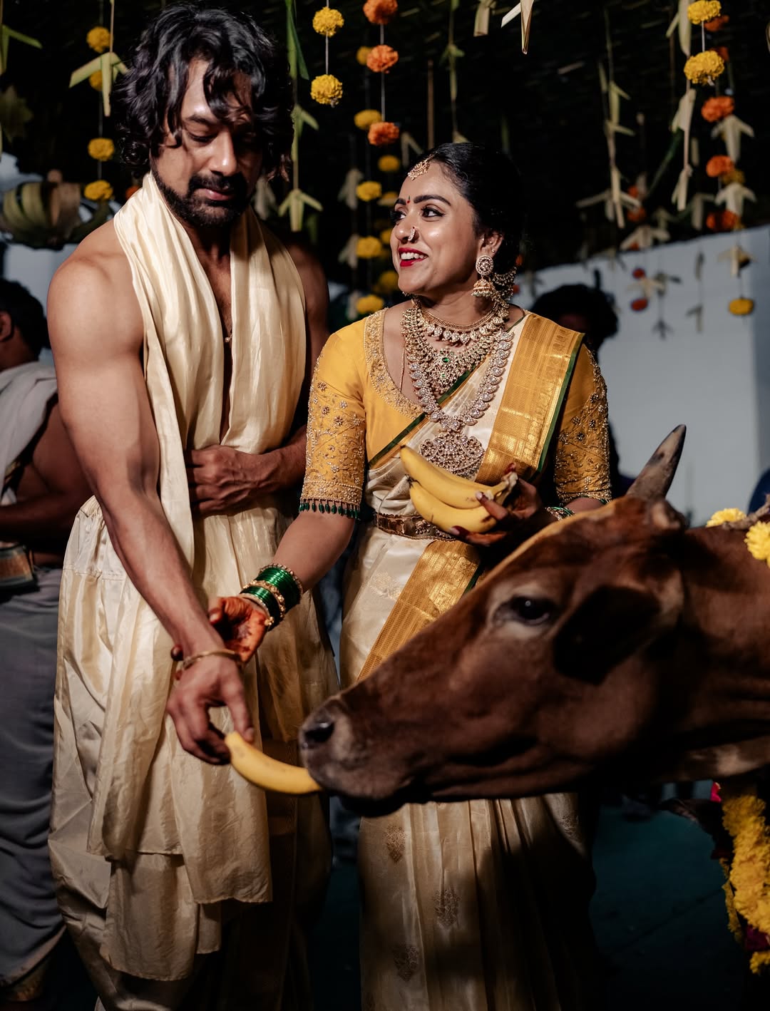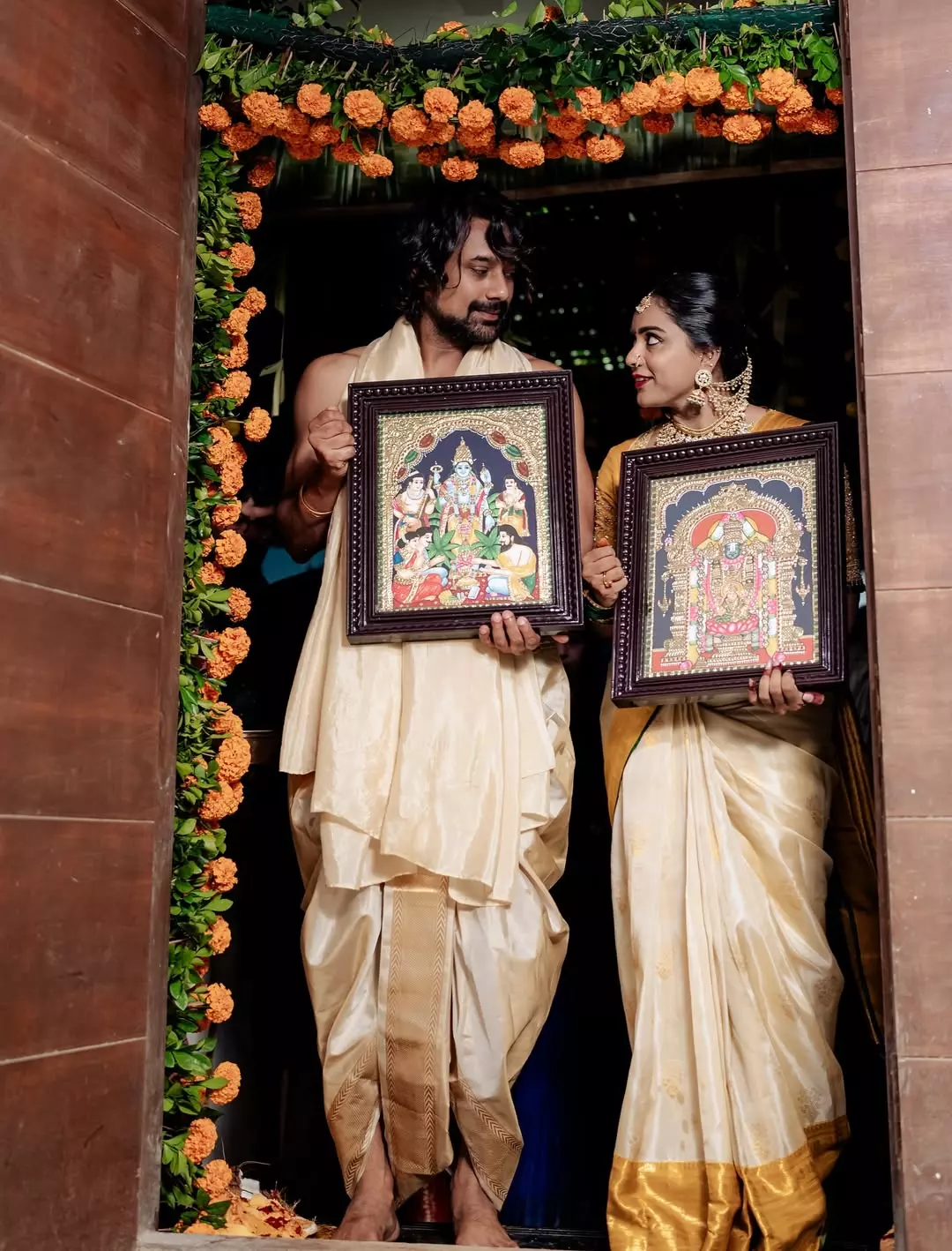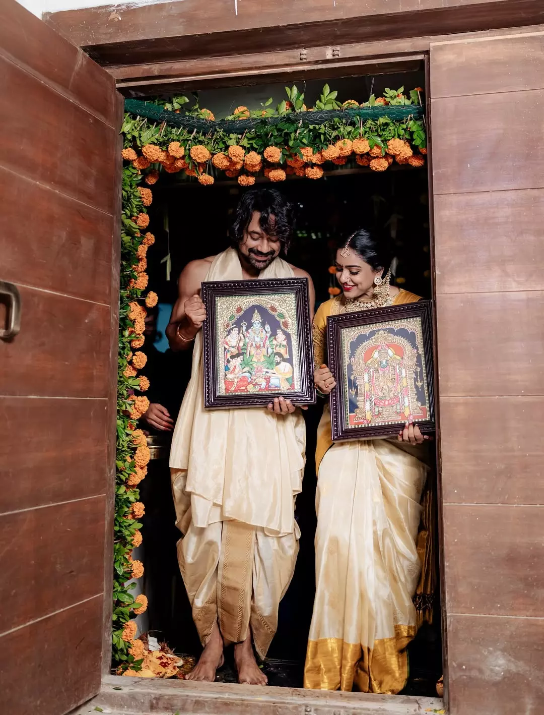 Tollywood couple Varun Sandesh and Vithika Sheru always manage to capture hearts with their charming chemistry and heartwarming posts. The recent Instagram picture shared by Vithika shows the couple in traditional attire, holding divine paintings with bright smiles on their faces. The caption reads in Telugu: “మనసు నిండా ఆనందంతో, నా కలల ఇంటి గృహప్రవేశం”. This moment is truly special as the couple steps into a new chapter of life together.