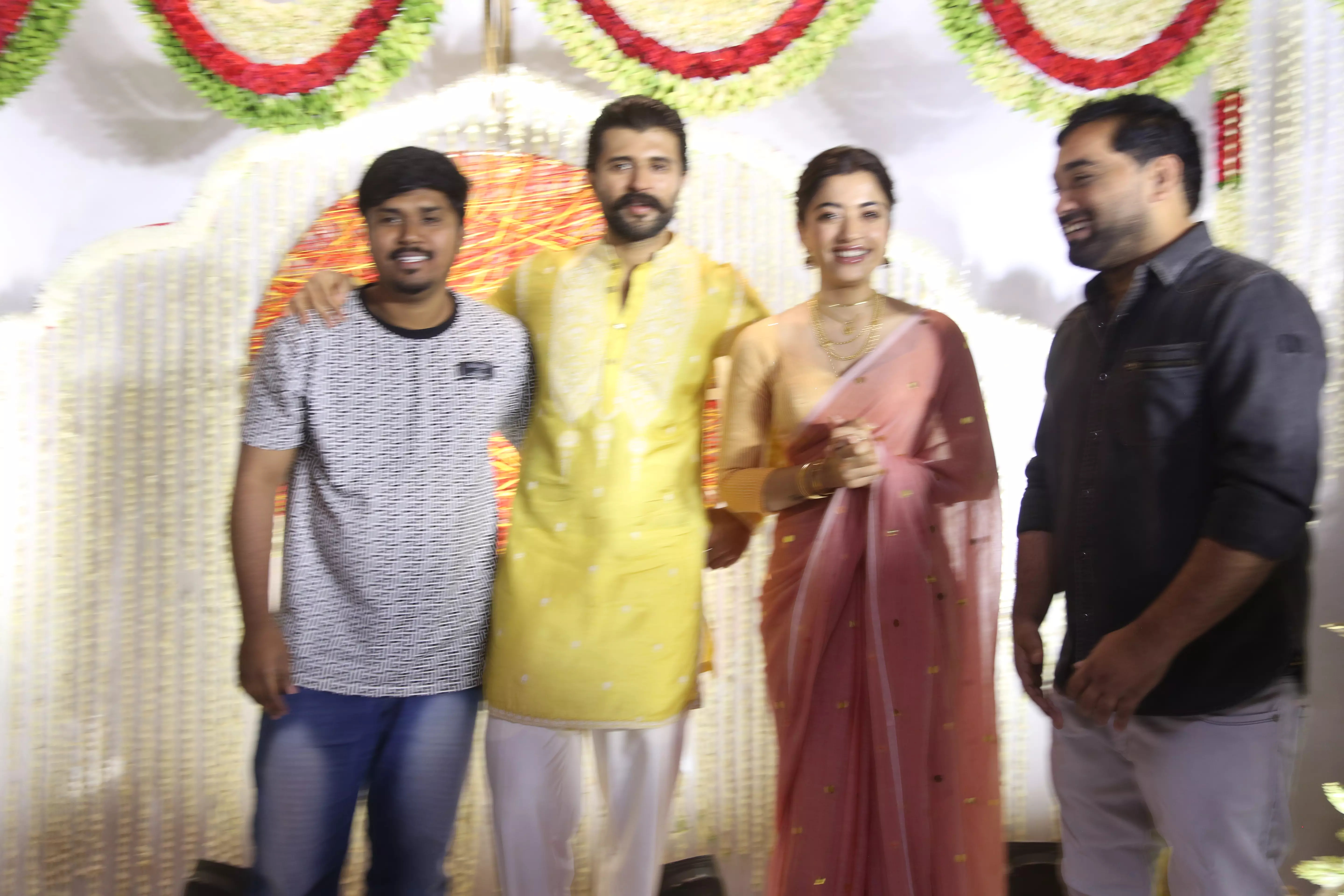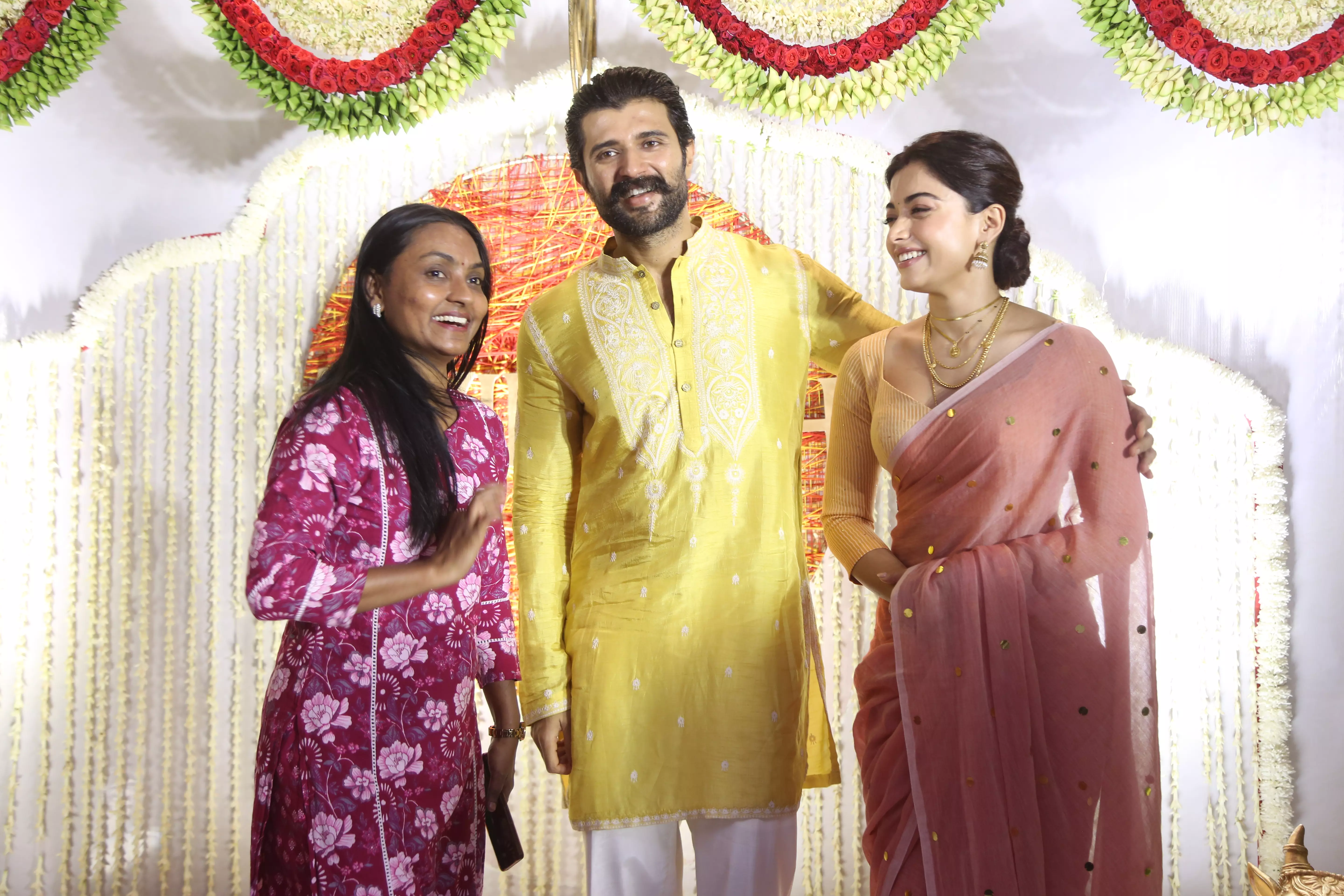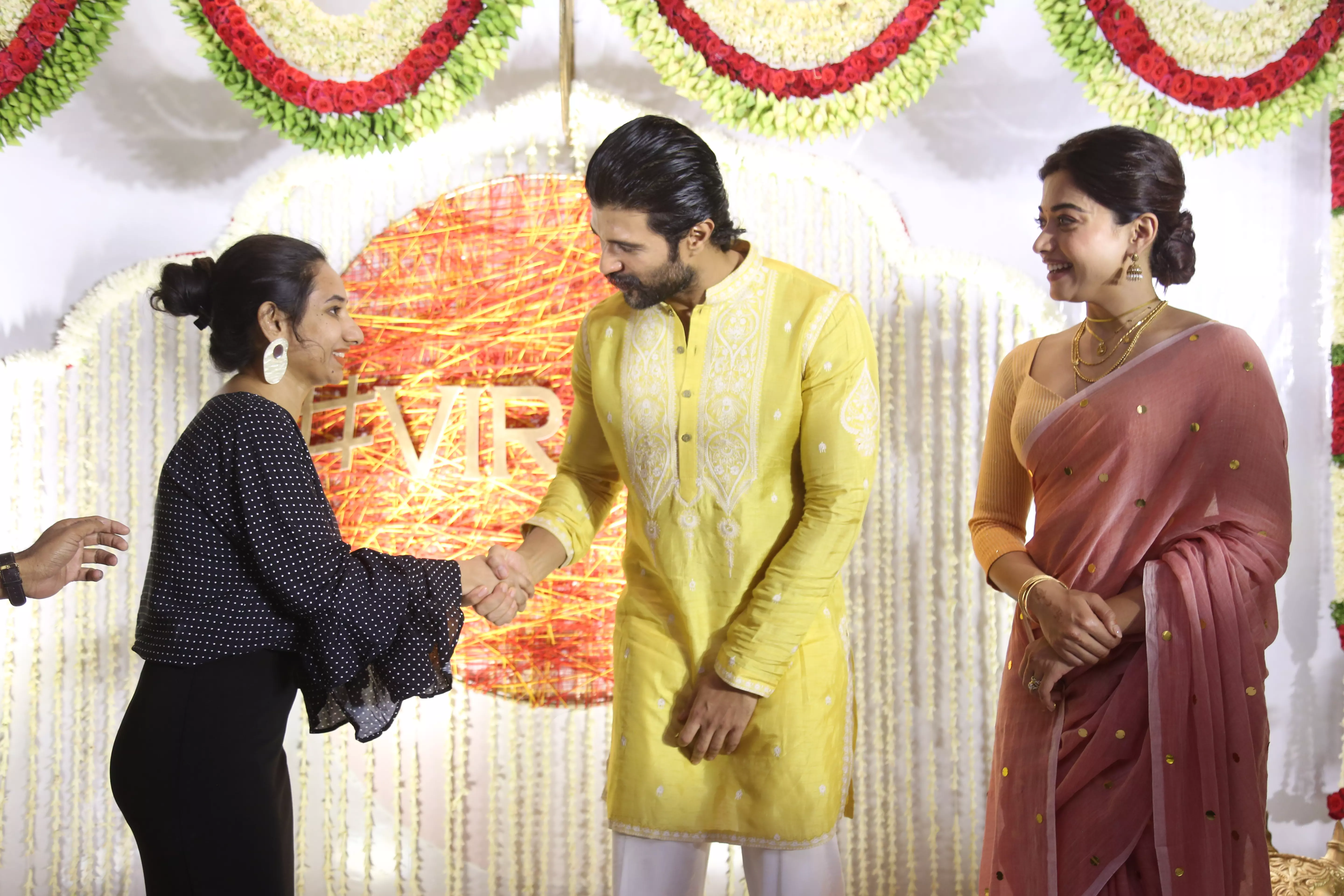 Featuring Vijay Deverakonda and Rashmika Mandanna interacting with the media during their event appearance. These photos capture the couple smiling, greeting photographers, and sharing light moments while posing for the press.