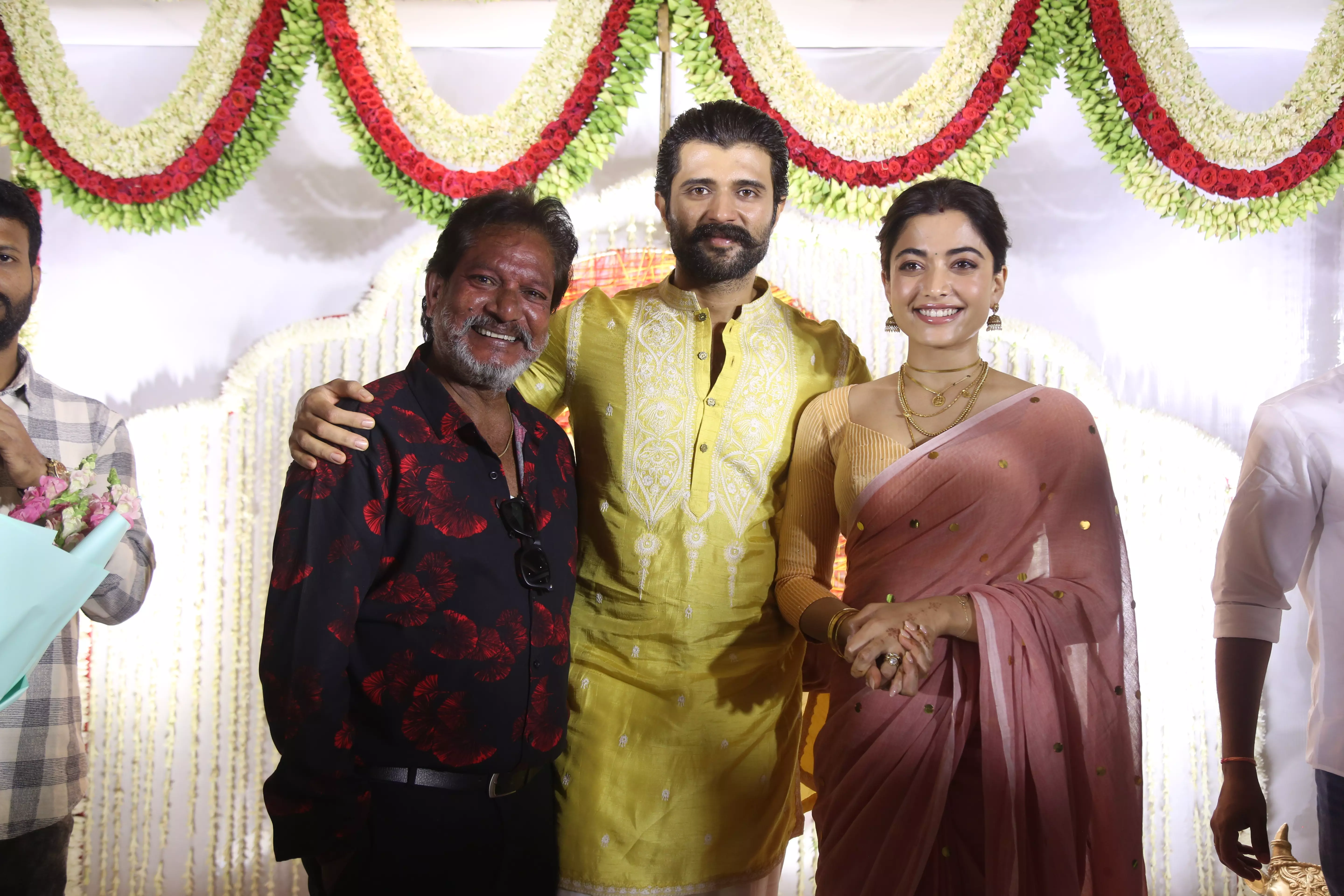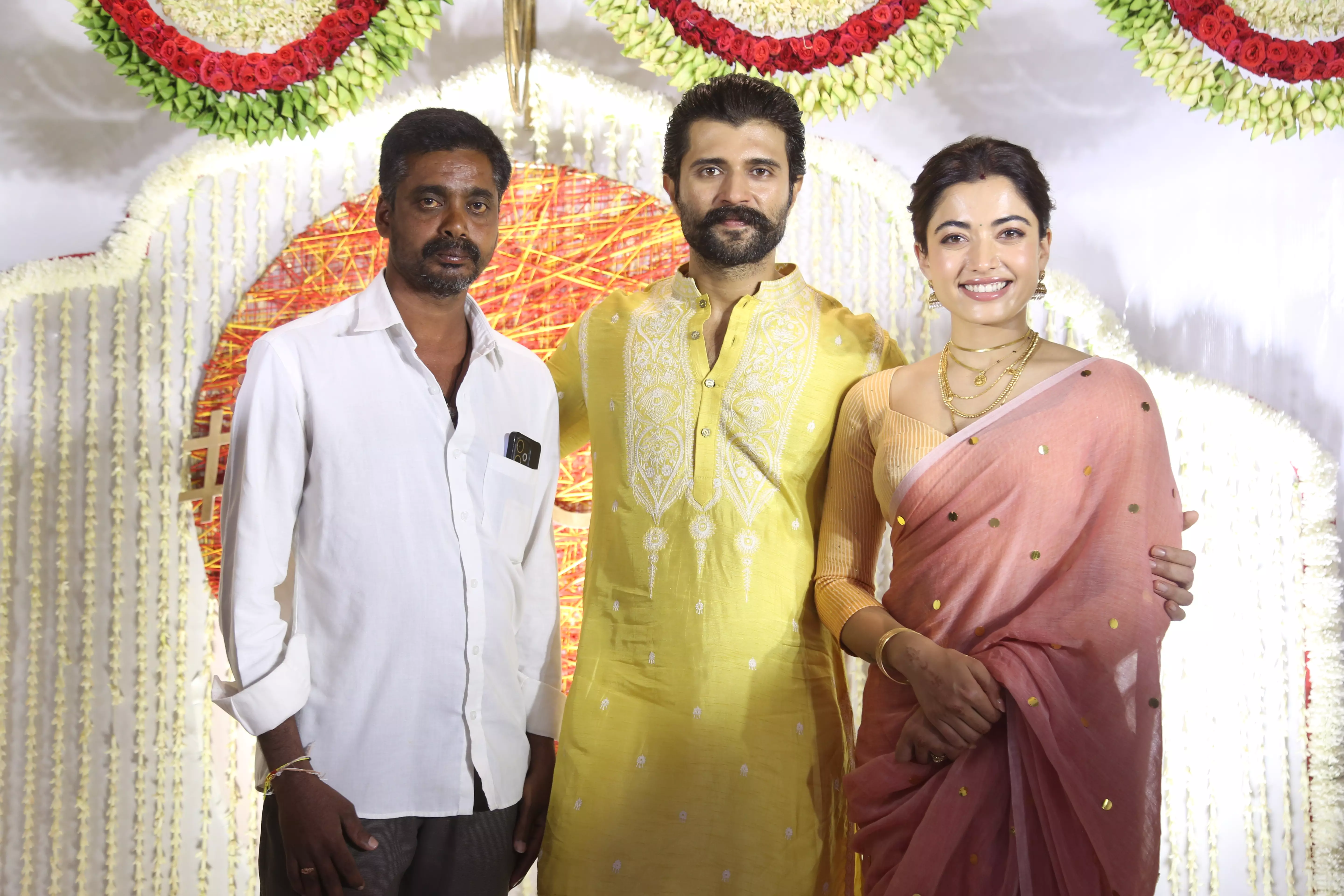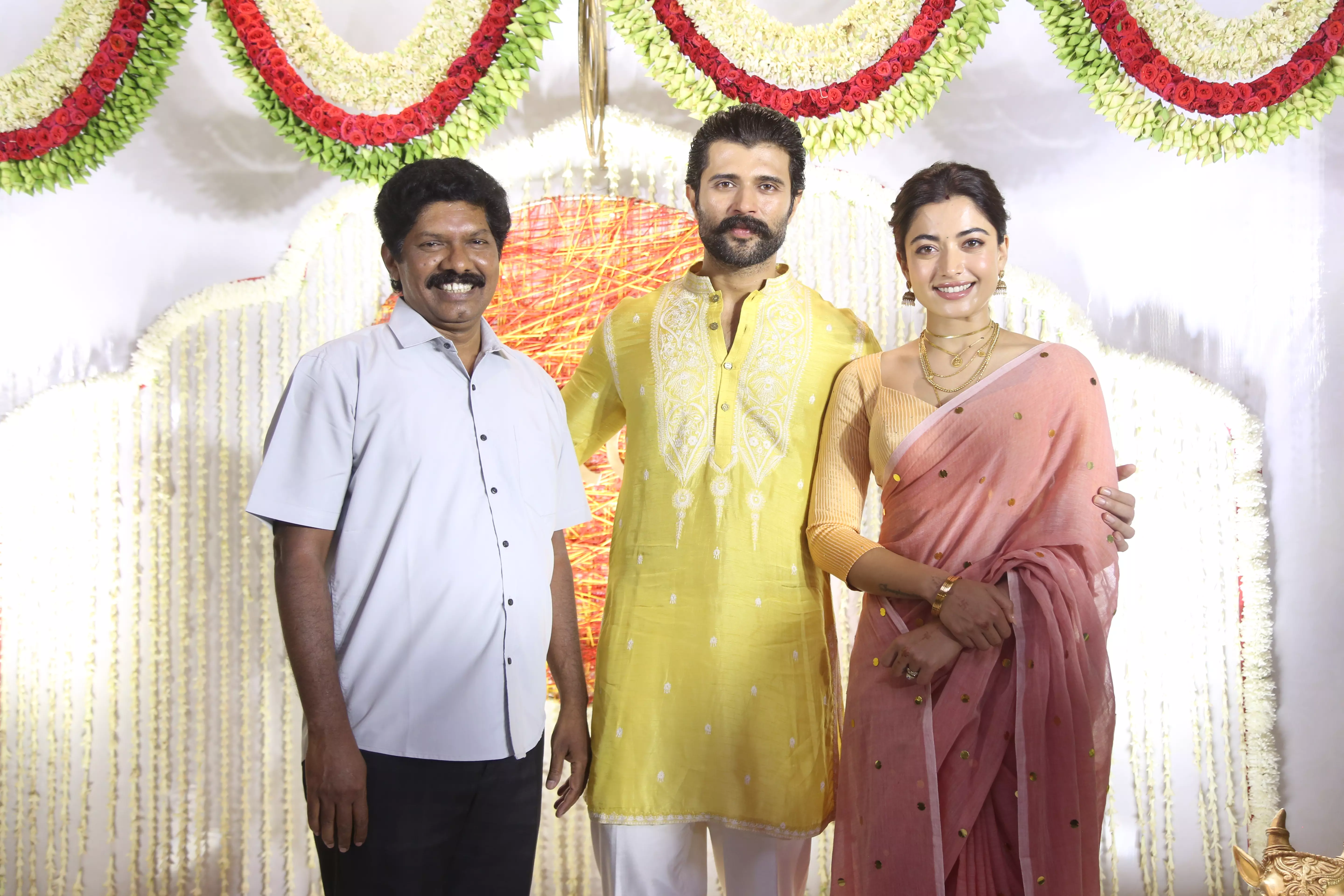Featuring Vijay Deverakonda and Rashmika Mandanna interacting with the media during their event appearance. These photos capture the couple smiling, greeting photographers, and sharing light moments while posing for the press.