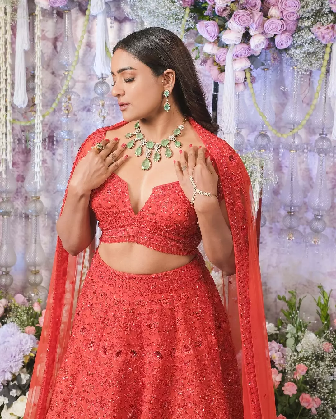 By: Tupaki Desk | 18 April 2025 10:02 AM ISTDraped in a stunning red embellished lehenga, Vithika Sheru exudes grace and elegance in this regal look. The intricate detailing of her outfit, paired with a statement emerald green necklace set, creates a perfect blend of tradition and glamour. With soft makeup, a poised expression, and a dreamy floral backdrop, she captures the essence of timeless beauty with a modern twist.
