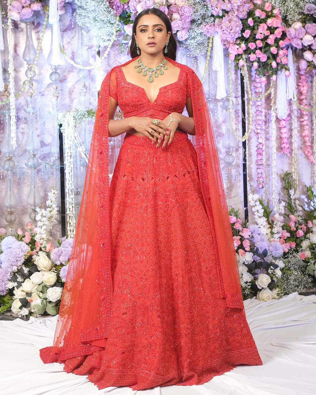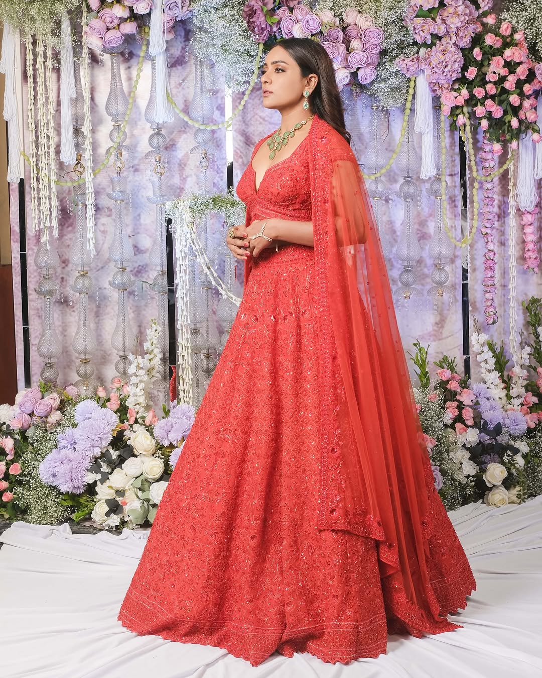 Draped in a stunning red embellished lehenga, Vithika Sheru exudes grace and elegance in this regal look.