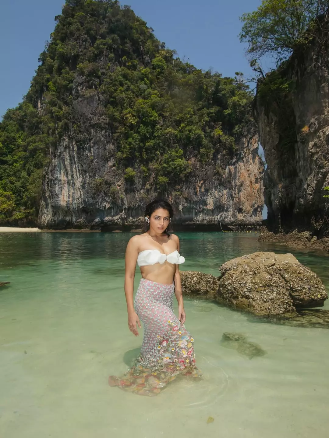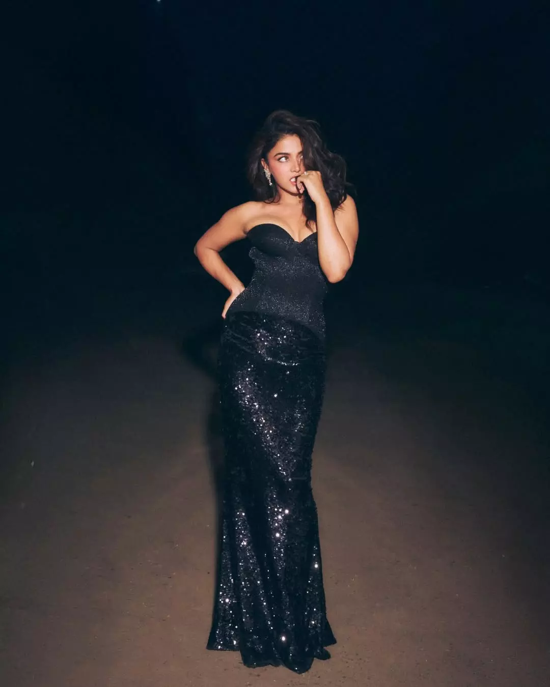 By: Tupaki Desk | 20 April 2026 9:30 AM ISTThis captivating photograph of Wamiqa Gabbi showcases her in a sleek, sparkling black sequined strapless gown that hugs her silhouette perfectly. With one hand on her hip and the other playfully touching her lips, her sultry gaze and windswept hair create an irresistible mysterious allure against the dark, moody backdrop.