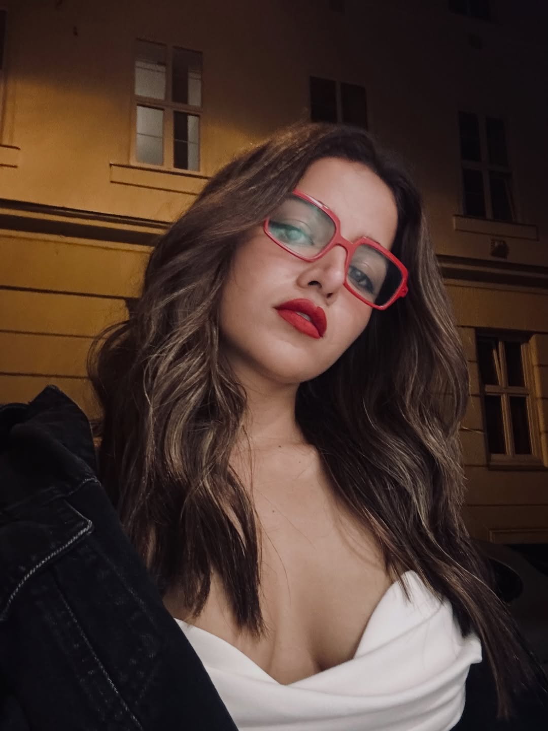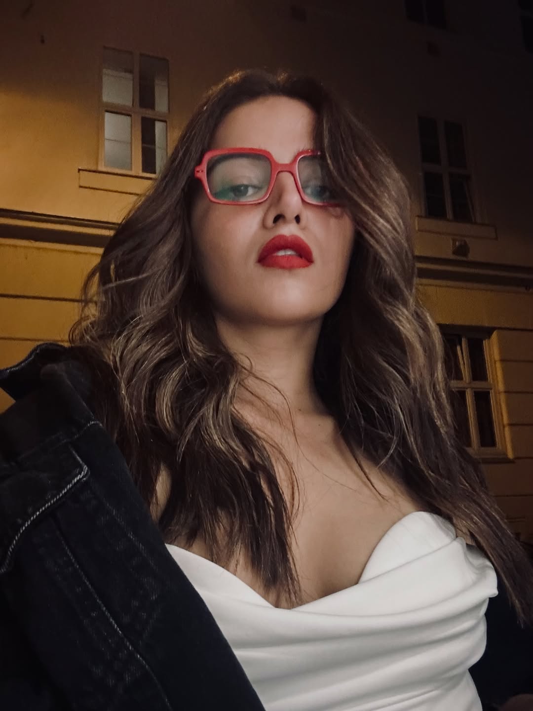 In the snap, Wamiqa rocks bold red-framed glasses that perfectly complement her face shape, adding a quirky, stylish twist to her look. Her vibrant red lipstick takes center stage, radiating confidence and glamour while perfectly coordinating with her eyewear. Together, the red accents make her features pop and bring a touch of drama to an otherwise casual setting.