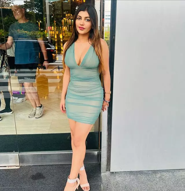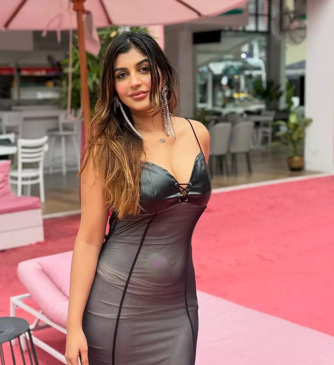 Keeping the styling minimal, she allows the statement dress to take center stage. Sleek hair and understated makeup complement the outfit perfectly, ensuring the focus remains on the intricate detailing and modern design elements. The sheer accents and corset-inspired structure lend a high-fashion appeal, making the look ideal for bold evening outings or standout appearances.