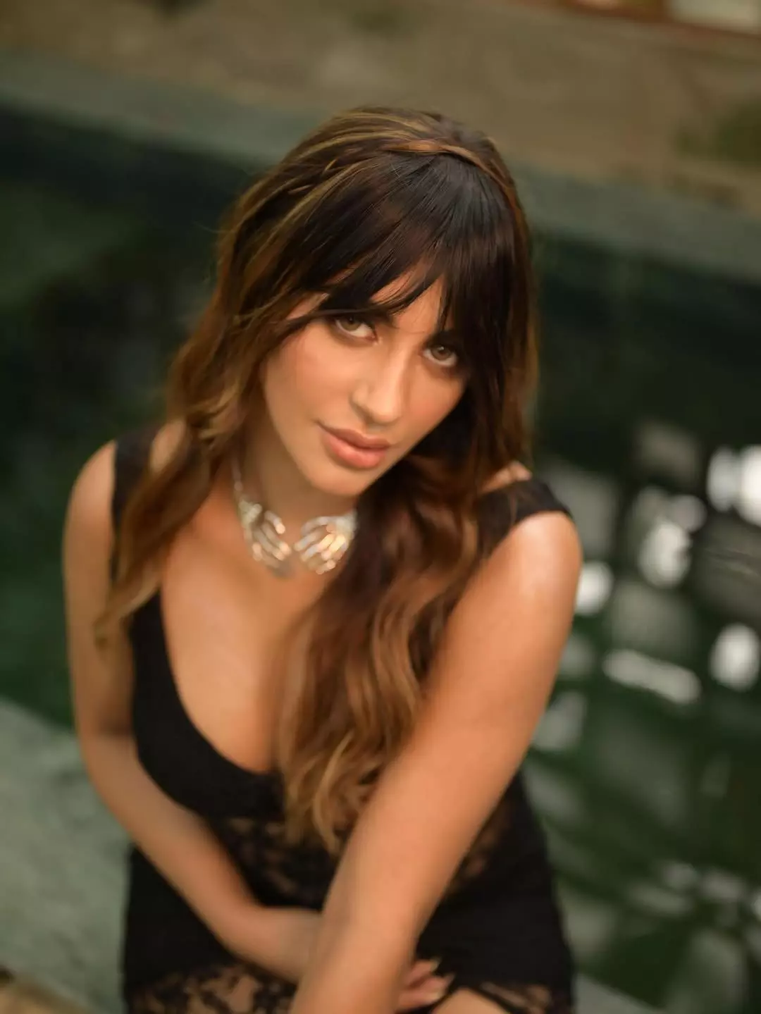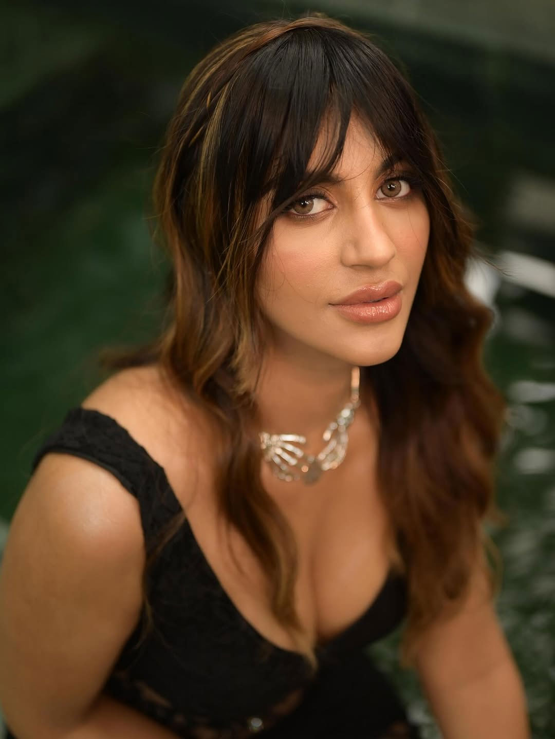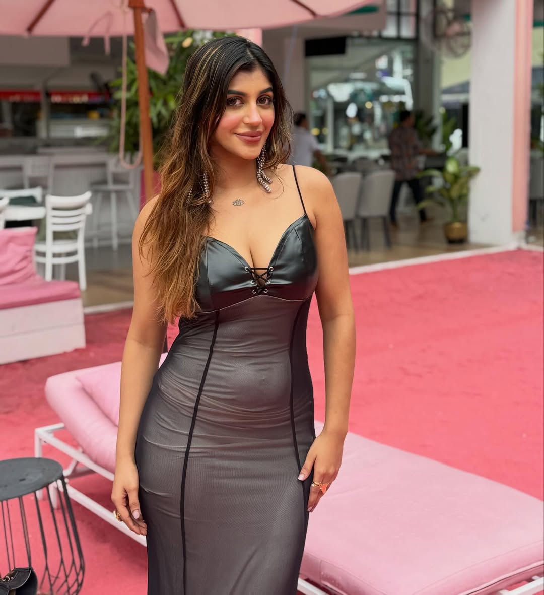 At the heart of the look is the lace-up, corset-style bodice paired with a plunging neckline—an edgy yet elegant combination that elevates the outfit. The structured design beautifully defines her frame, while the figure-hugging fit accentuates her curves with effortless ease. Yashika carries the look with remarkable poise, proving that confidence truly is her most powerful accessory.