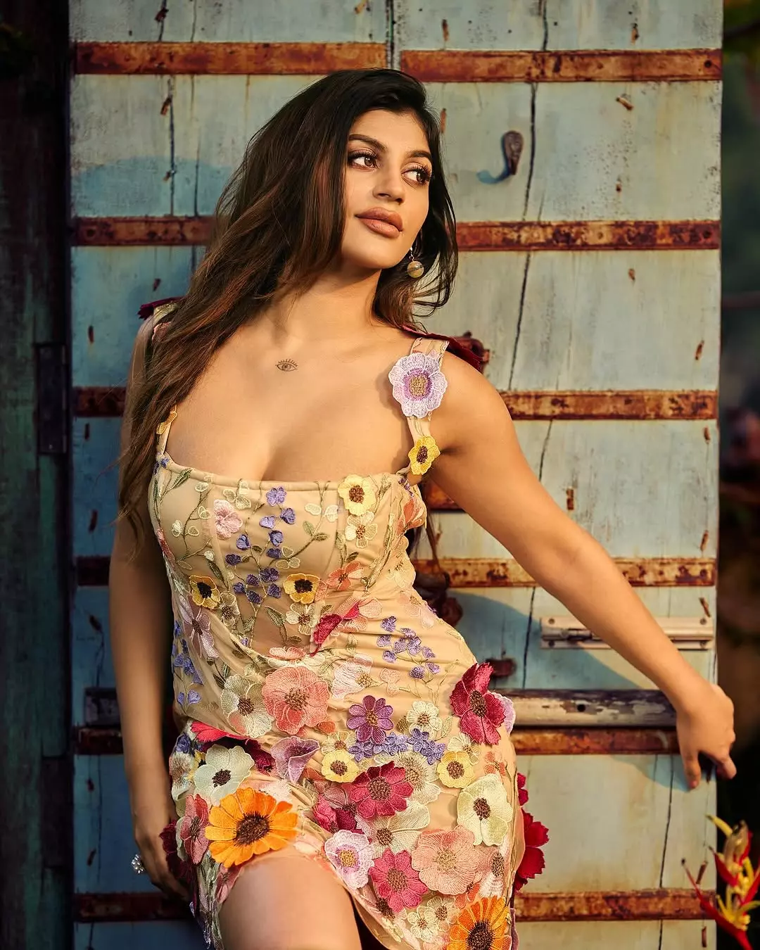 Yashika Aannand stuns in this breathtaking photoshoot, radiating confidence and elegance in a strapless floral mini dress adorned with delicate rose patterns, layered tulle, and shimmering details.