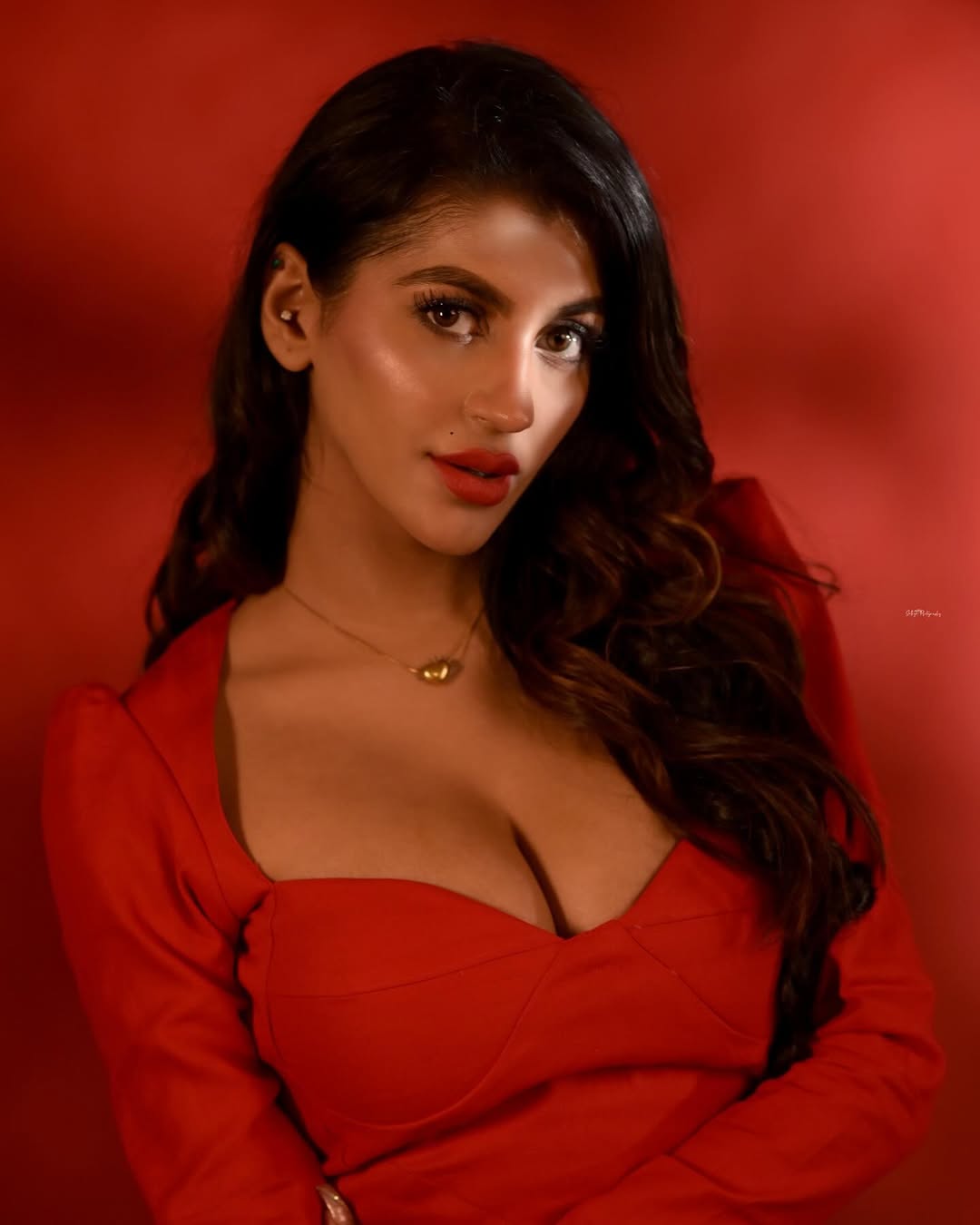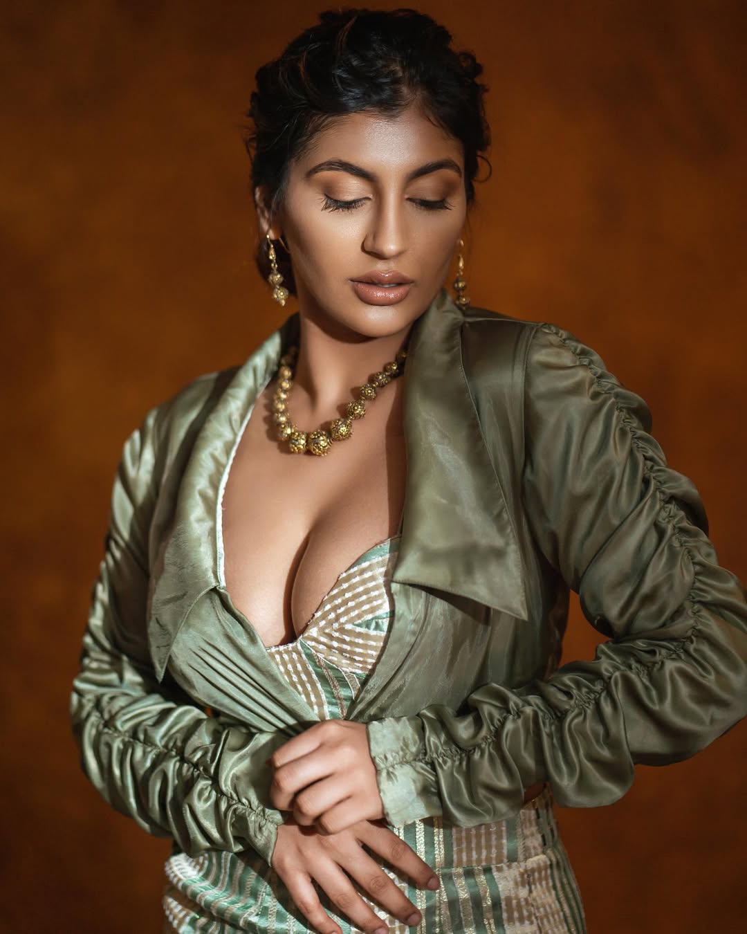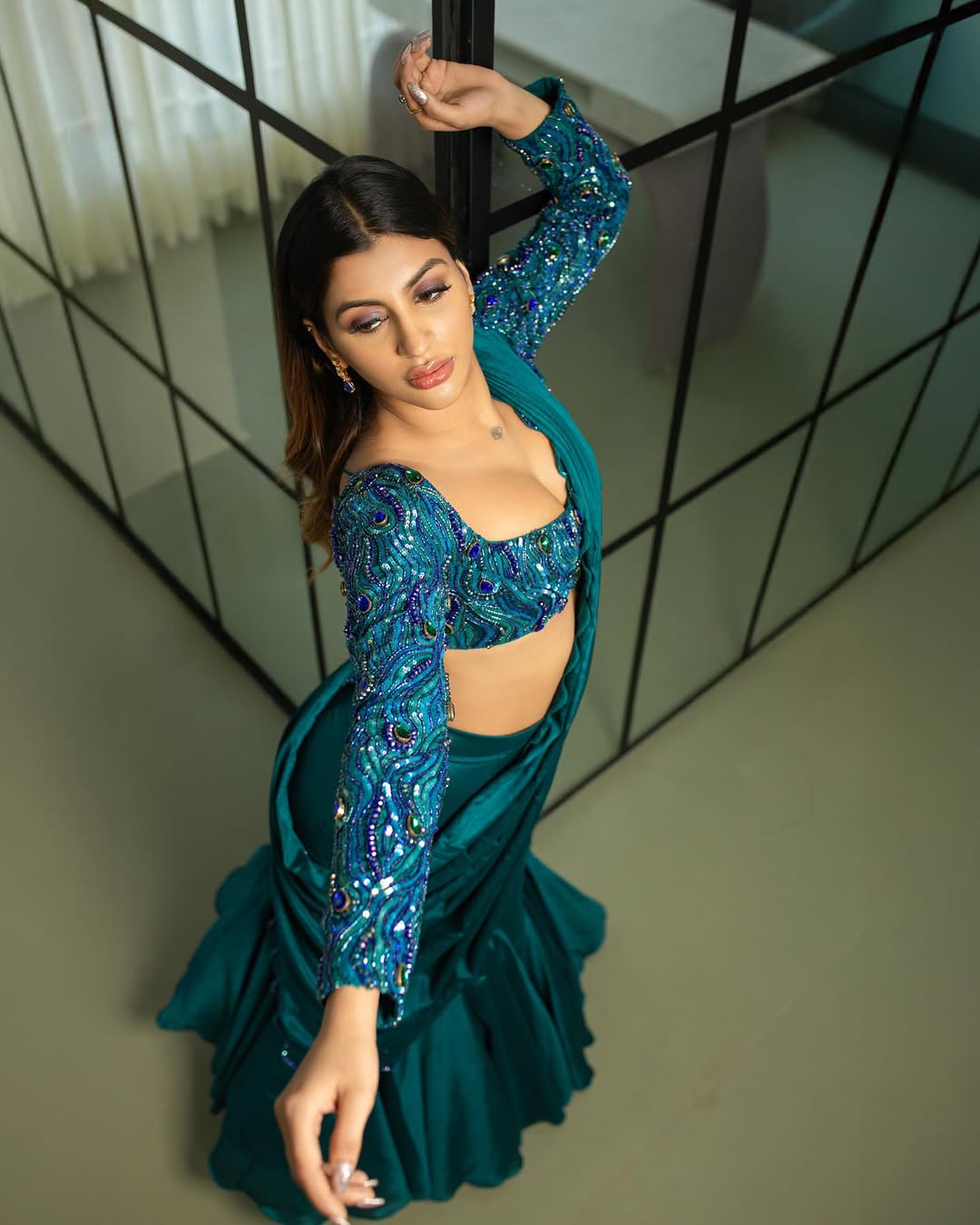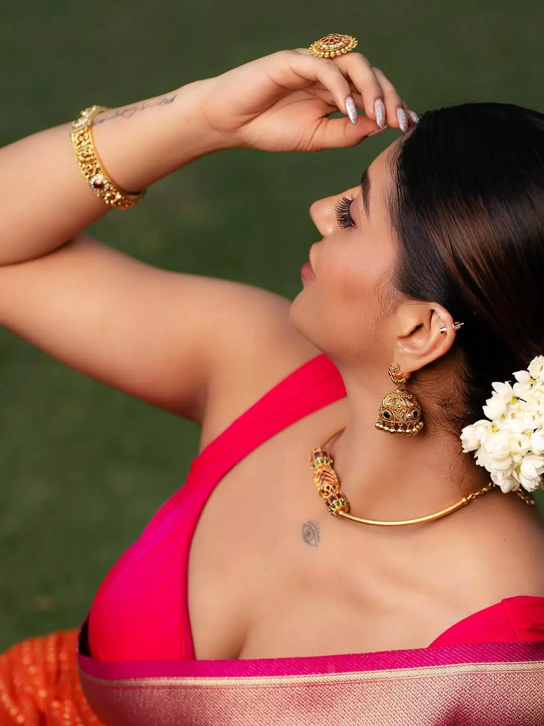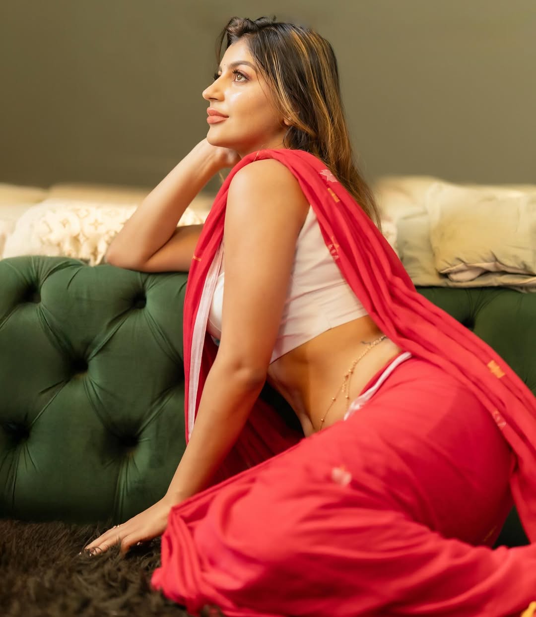 Yashika Aannand sets the frame on fire with a lime-green saree draped like liquid sin over a gold-sequined bralette that catches every ray like molten treasure. One hand lifts raven waves to reveal an evil-eye tattoo, the other lets the pleats cascade, exposing a glittering navel ring and sun-kissed midriff. Smokey eyes locked, crimson lips parted—she’s Bigg Boss Tamil’s ultimate rebel queen reborn as desi dynamite.