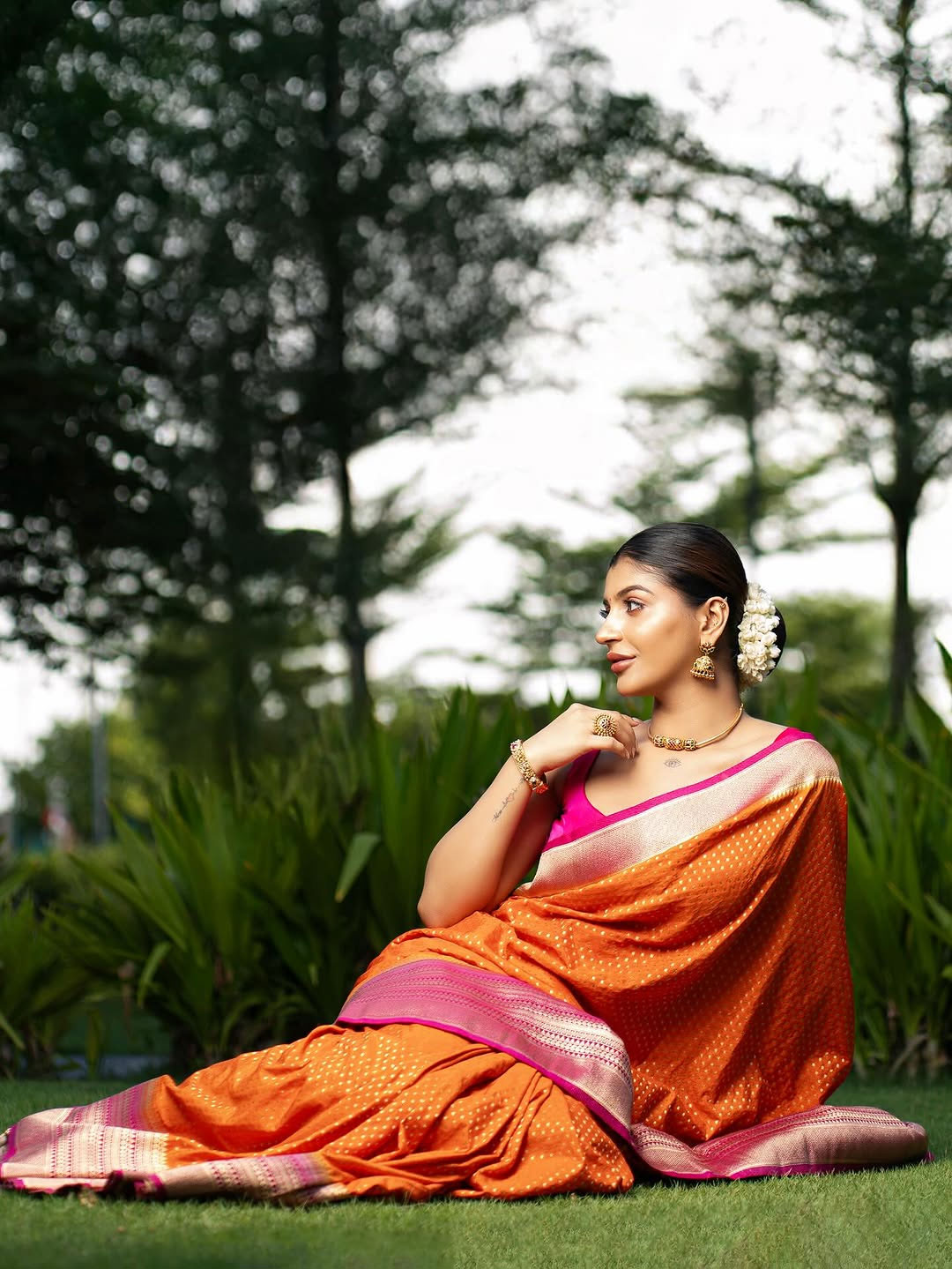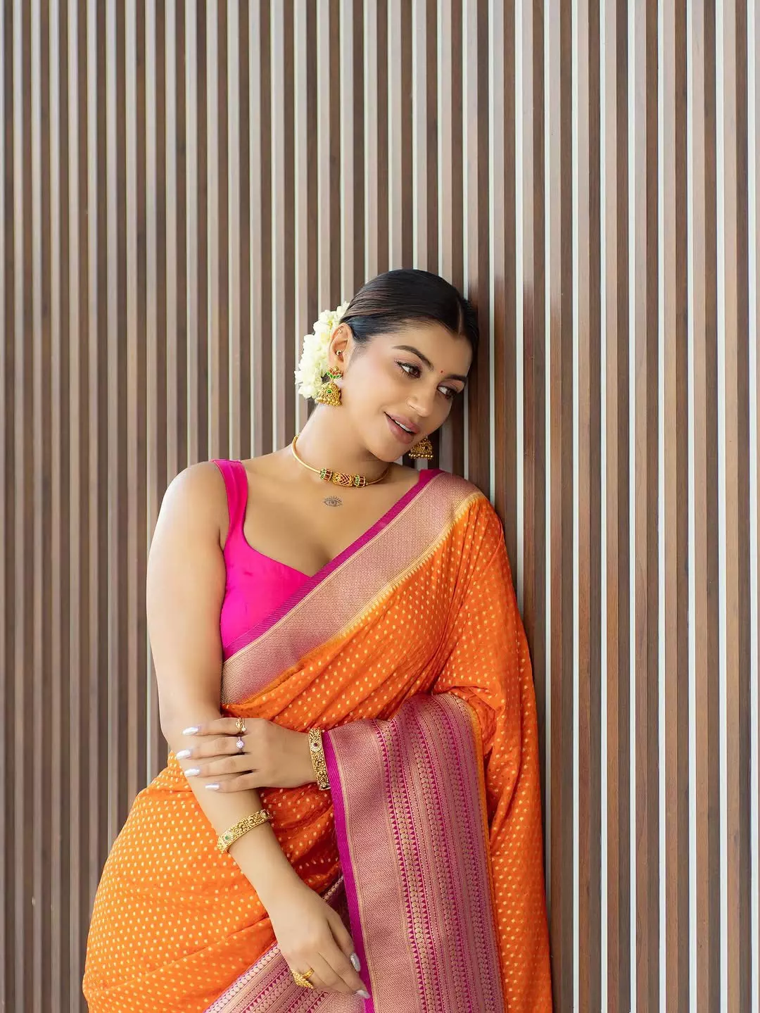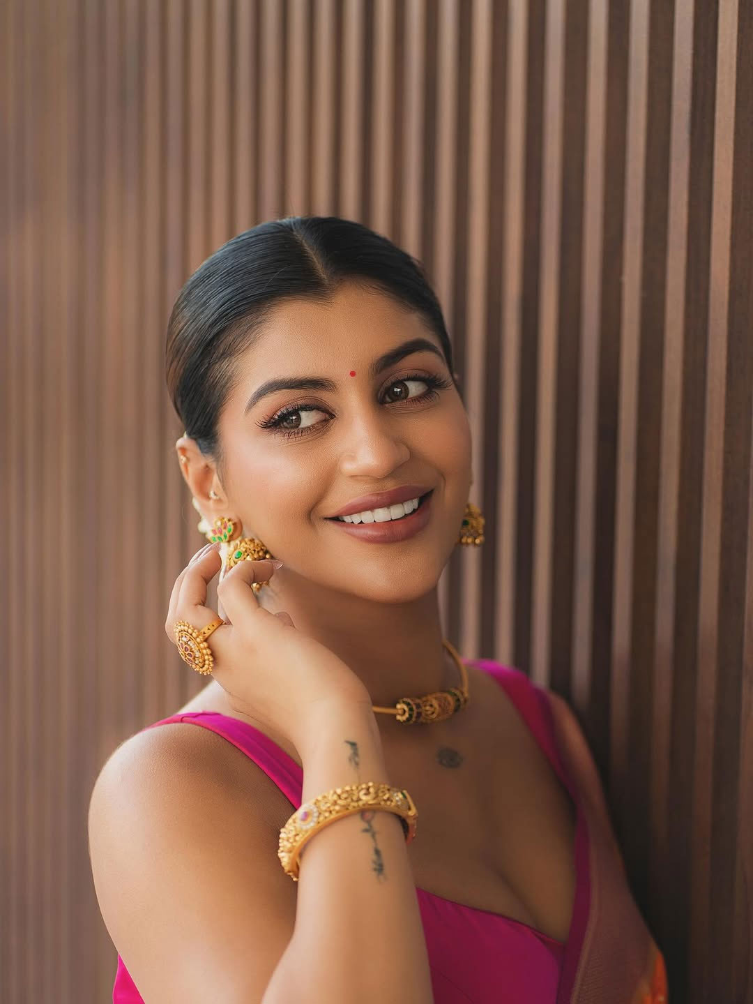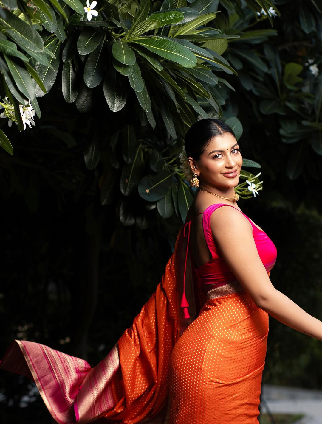 By: Tupaki Desk | 3 July 2025 9:08 PM ISTYashika Aannand known for her appearances in Tamil films and television shows has captivated her audience with her charm and acting talent. Recently, she shared a photo on Instagram where she showcased her elegance in a bright pink blouse paired with a vibrant orange saree, accessorized with traditional jewelry. Her graceful look drew the attention of her followers, as she posed against a minimalist wooden background, a visual representation of modern beauty mixed with tradition.