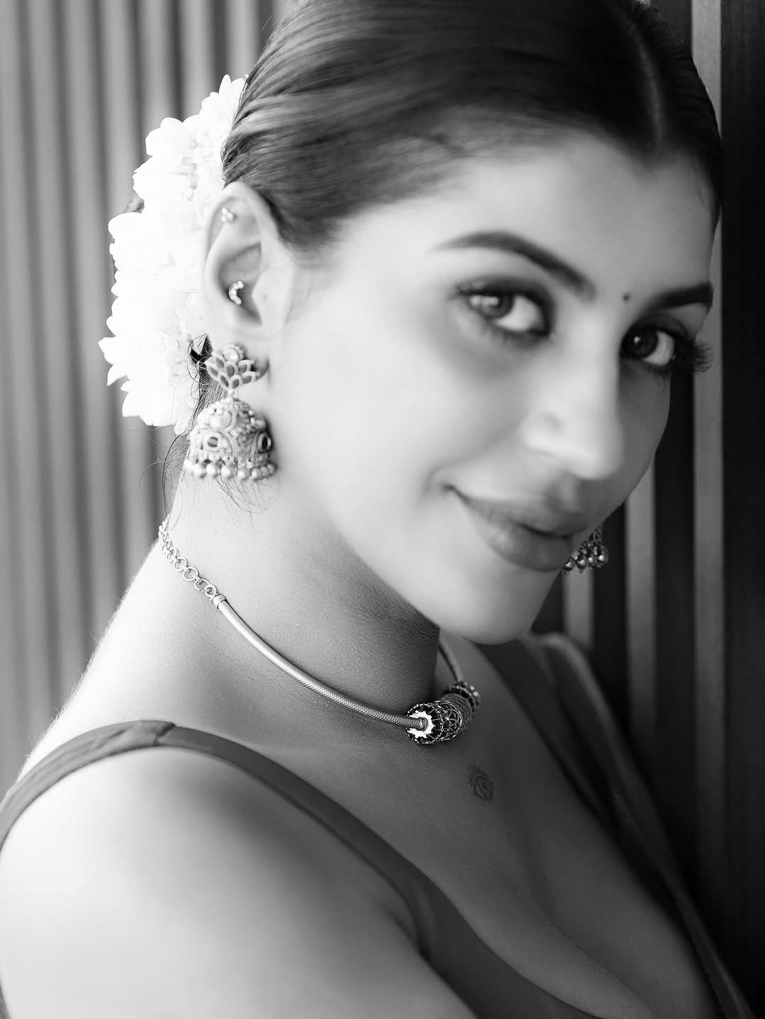 In the post, she invited her fans to choose their favorite look with a playful caption: *"Choose your fav 💖✨😊."* Yashika tagged the makeup artist, studio, and designer responsible for her look, showing appreciation for their hard work. The brands she mentioned include @lakshana-_priya-_mua for makeup, @studio-_d-_wedding-_house for photography, and @lakshana-_designer-_studio for the saree design.