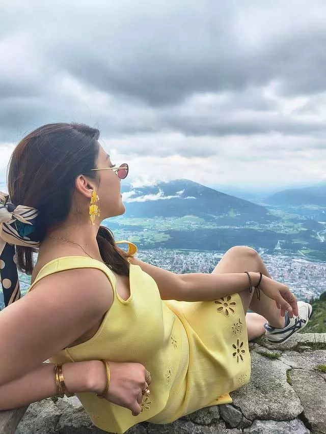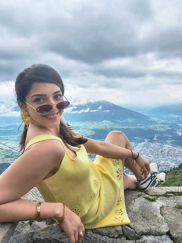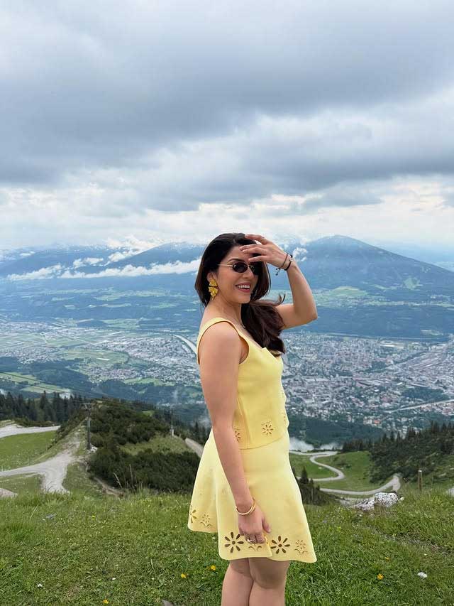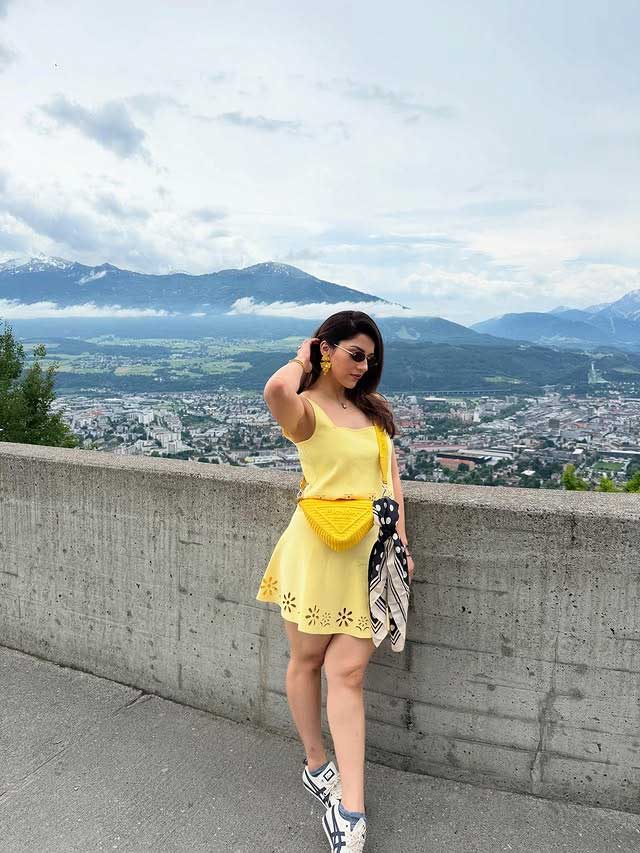 Mehreen Pirzada recently shared a cheerful moment from the mountains of Innsbruck, Austria, with a stunning scenic backdrop. In the picture, she is seen enjoying the fresh air and the wide view of the town below while dressed in a bright yellow look that matches the sunny vibe of the location. Her caption reads, “On top of the 🌍,” giving a perfect sense of joy and freedom that the picture captures. The post also mentions, “Shot with @motorolain Razr 😍 #innsbruck #austria #mountains,” showing her collaboration and excitement for travel and photography.