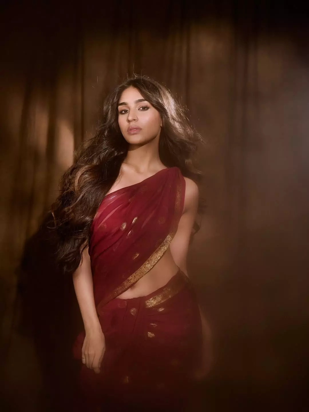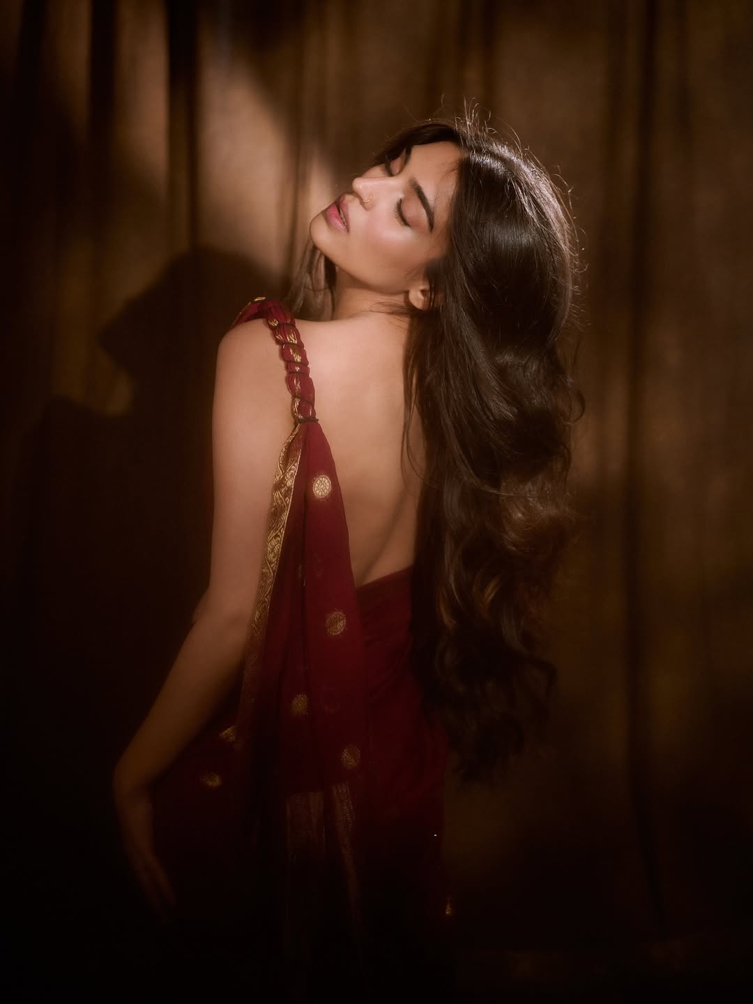 Yukti Thareja Glows In Deep Maroon Saree, Captures Cinematic Magic