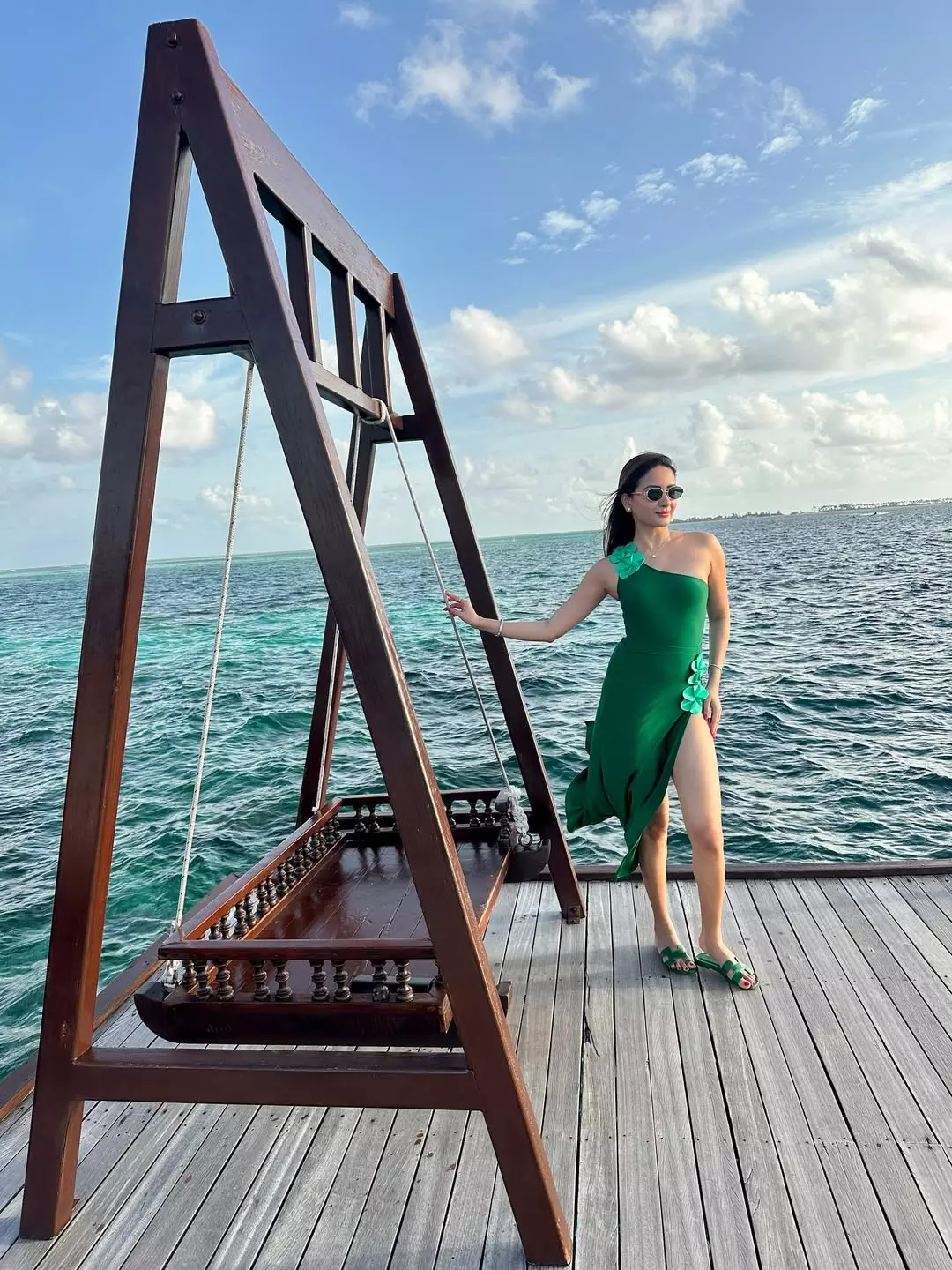 Zaara Yesmin looks radiant and effortlessly chic as she enjoys a breezy boat ride in the Maldives. Dressed in a stunning green outfit paired with a wide-brim hat and shades, she perfectly blends elegance with vacation vibes. Captioning her moment as “Once again to my favourite place with some happy tanning 🌞 #maldives 🥰 #zaarayesmin 💕”, Zaara gives us major holiday inspiration with her glamorous yet relaxed style.