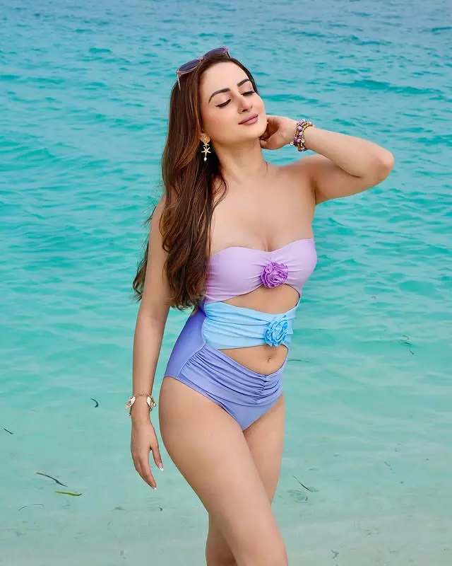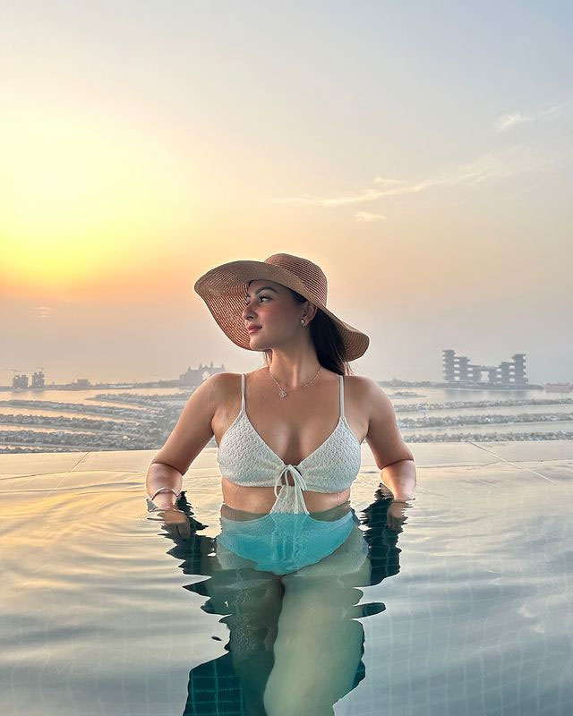 In her latest Instagram update, Zaara effortlessly channels summer elegance. Captured standing gracefully in a serene pool, she gazes confidently into the camera wearing a chic white lace bikini top paired with aqua blue high-waisted bottoms that beautifully highlight her silhouette.