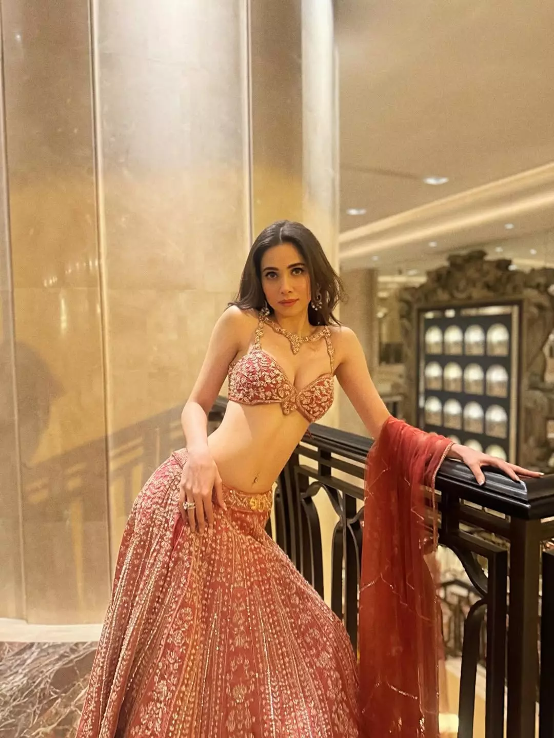 By: Tupaki Desk | 15 Jan 2026 8:31 PM ISTThis breathtaking photograph showcases Zahrah S Khan exuding unapologetic confidence and desi glamour in a stunning pink embroidered lehenga choli. The intricate gold detailing on the halter-neck blouse highlights her toned physique, paired with a flowing, heavily embellished lehenga skirt, sheer dupatta, statement earrings, and soft waves framing her face. Set against a luxurious hotel backdrop, her poised stance and captivating gaze radiate sophistication and strength.