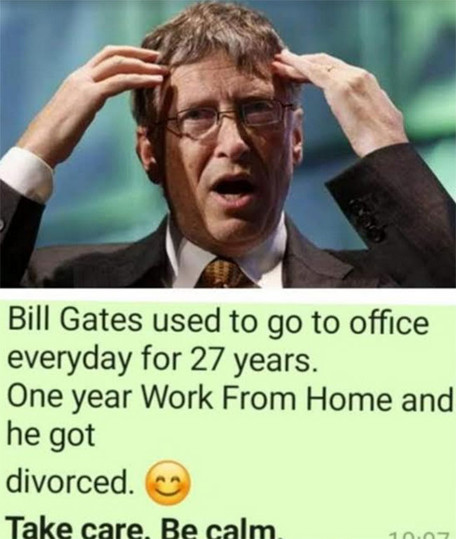 నిజానికి బిల్ గేట్స్ విడాకులకు ఇది కారణం కాకున్నా నెటిజన్లు మాత్రం తమ క్రియేటివిటీని అంతా జోడించి బిల్ గేట్స్ అంతటి వాడినే వర్క్ ఫ్రం హోం ఇంతటి దారుణానికి దారితీసేలా చేసిందని.. అందరూ కామ్ గా ఉండాలని సెటైర్లు వేస్తున్నారు. ఏంతైనా కరోనా లాక్ డౌన్ తో వచ్చిన ఈ కొత్త పని వాతావరణం ఇంట్లో బందీగా మారిపోయిన భర్తలకు, భార్యలకు మధ్య బంధాన్ని పలుచన చేస్తుందనడంలో ఎలాంటి సందేహం లేదని నిపుణులు అంటున్నారు.