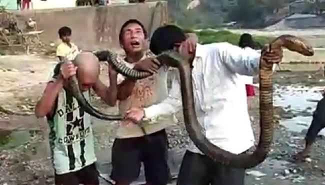 కరోనా వైరస్ కారణంగా తమ దగ్గరున్న బియ్య అయిపోయాయని.. దీంతో ఆహారం కోసం పామును వేటాడామని ఆ ముగ్గురు వేటగాళ్లు తెలిపారు. మెడలో చచ్చిన కింగ్ కోబ్రాను వేసుకొని వీడియో లో మాట్లాడారు.